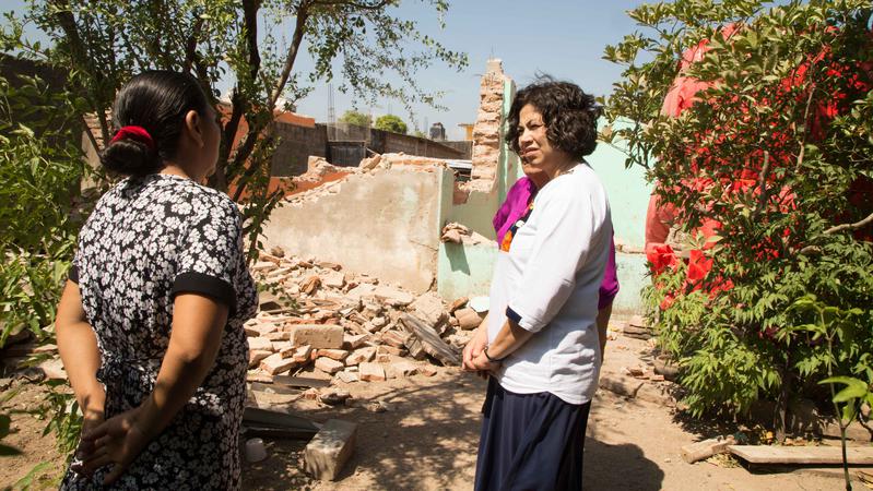 Sister Reyna I. Aburto, second counselor in the Relief Society general presidency of The Church of Jesus Christ of Latter-day Saints, traveled to the Mexican state of Oaxaca to visit with survivors of a recent earthquake. Sister Aburto began her tour in Juchitán de Zaragoza, where she was received by the municipal president, Gloria Sánchez López, Friday, November 3, 2017.