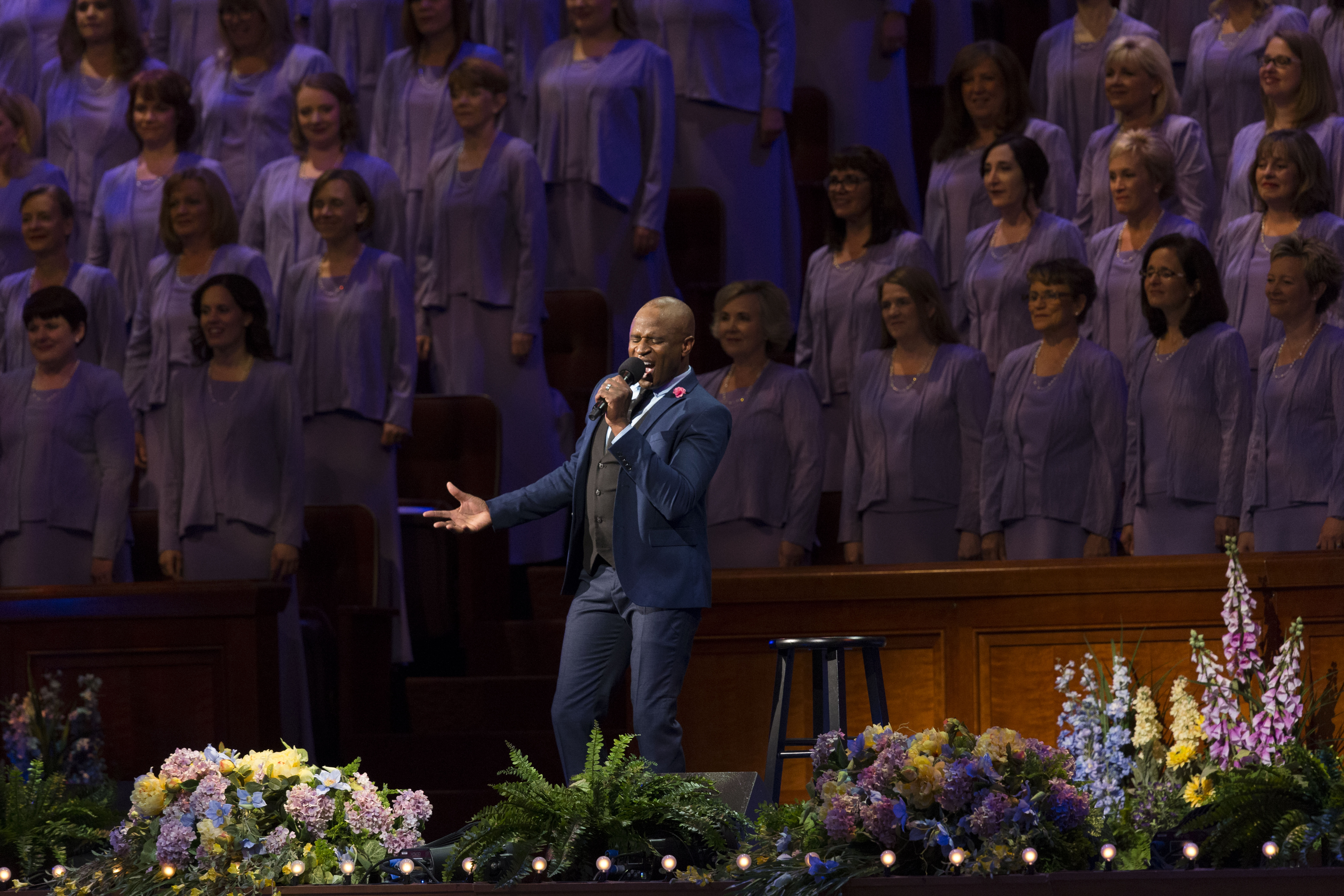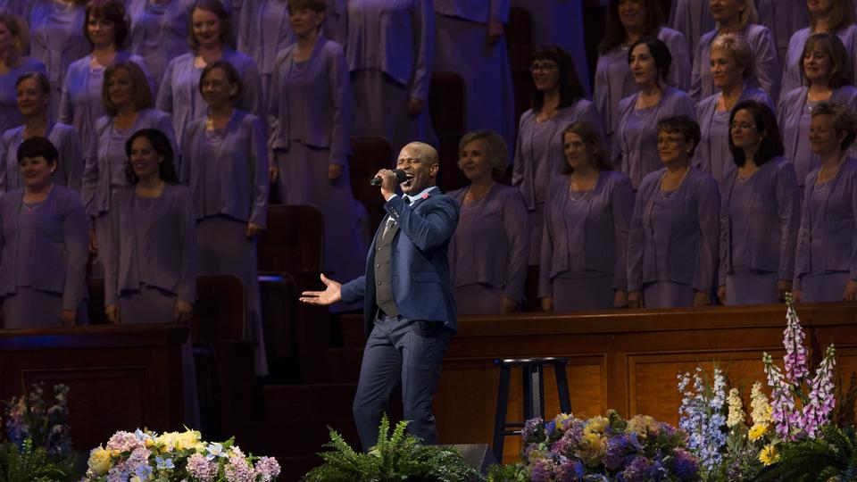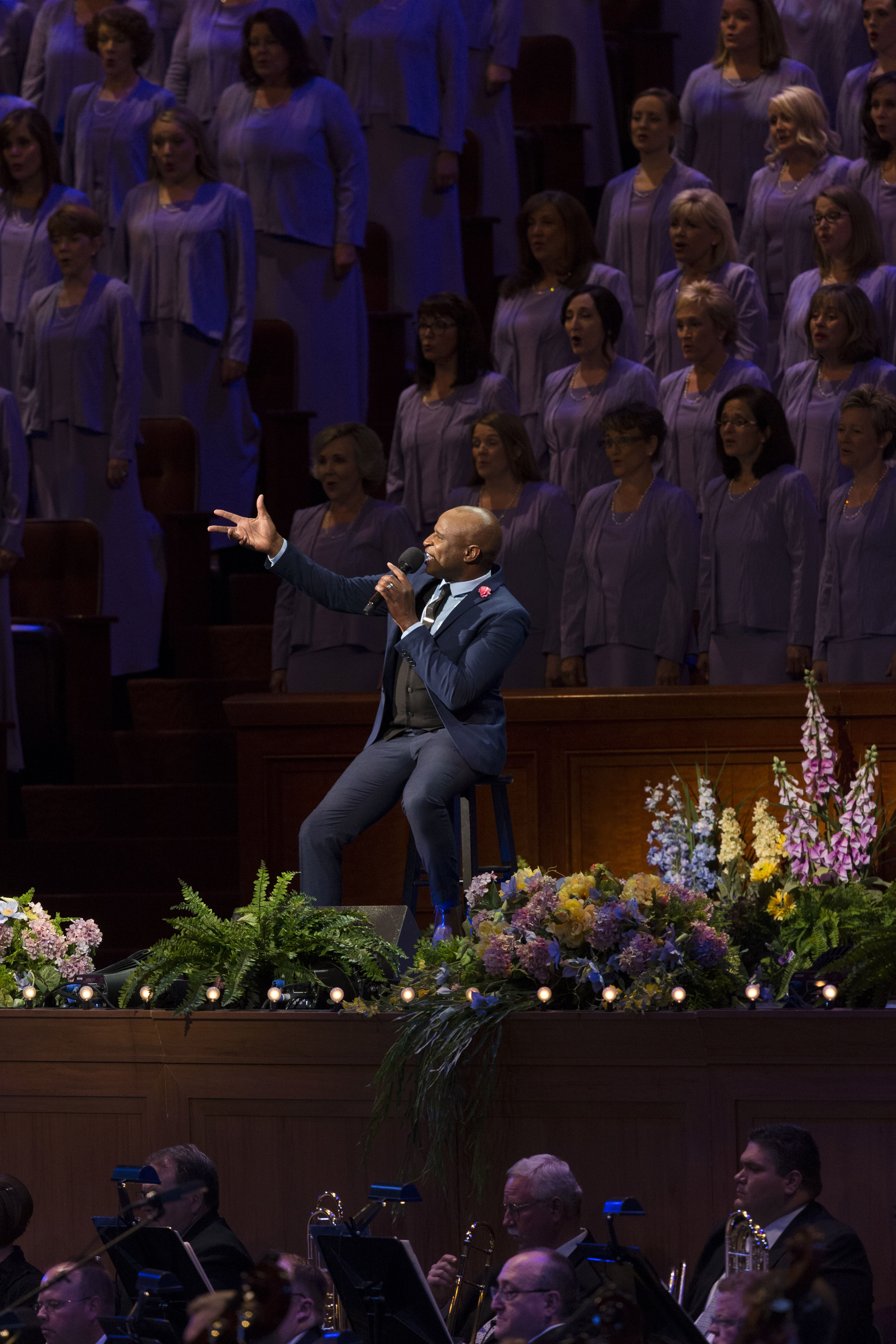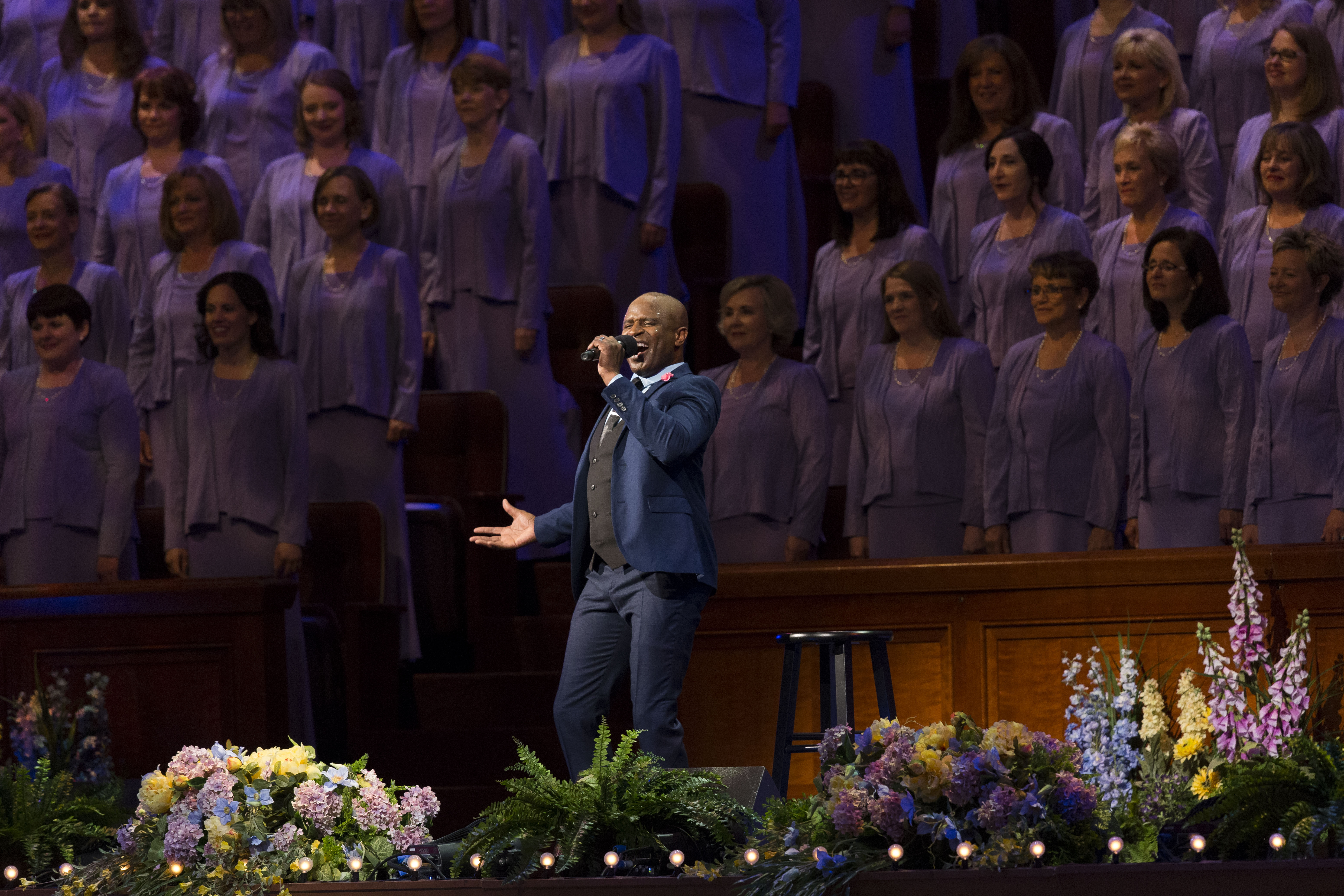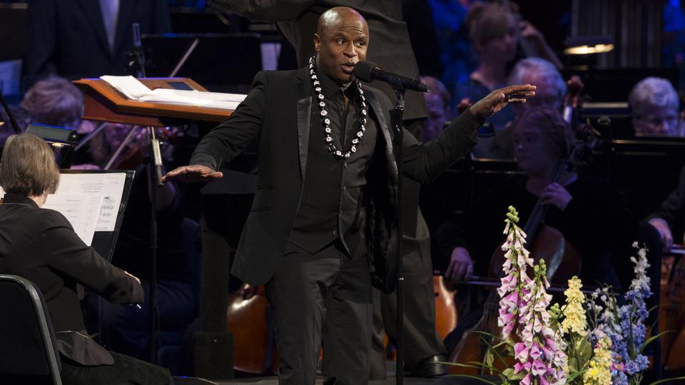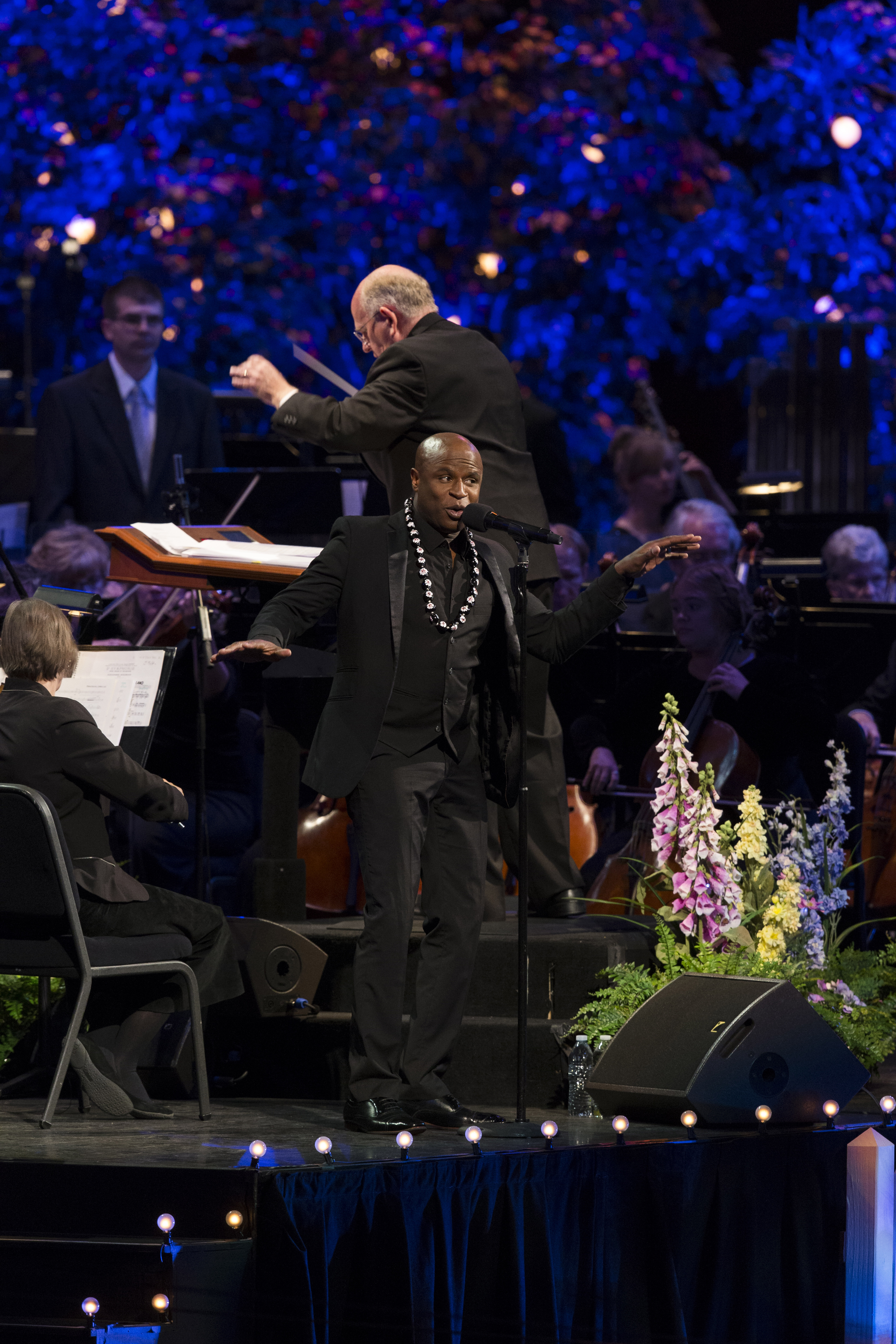 “I don’t sing with my hands behind my back sitting on a chair. I give everything,” said singer Alex Boyé, who was feeling right at home during the annual Pioneer Day concert with the Mormon Tabernacle Choir and Orchestra at Temple Square. “Like a grand homecoming,” said the former choir member, who sang to a large crowd during “Music for a Summer Evening” in the Conference Center on Temple Square in downtown Salt Lake City Friday night, July 14, 2017.