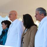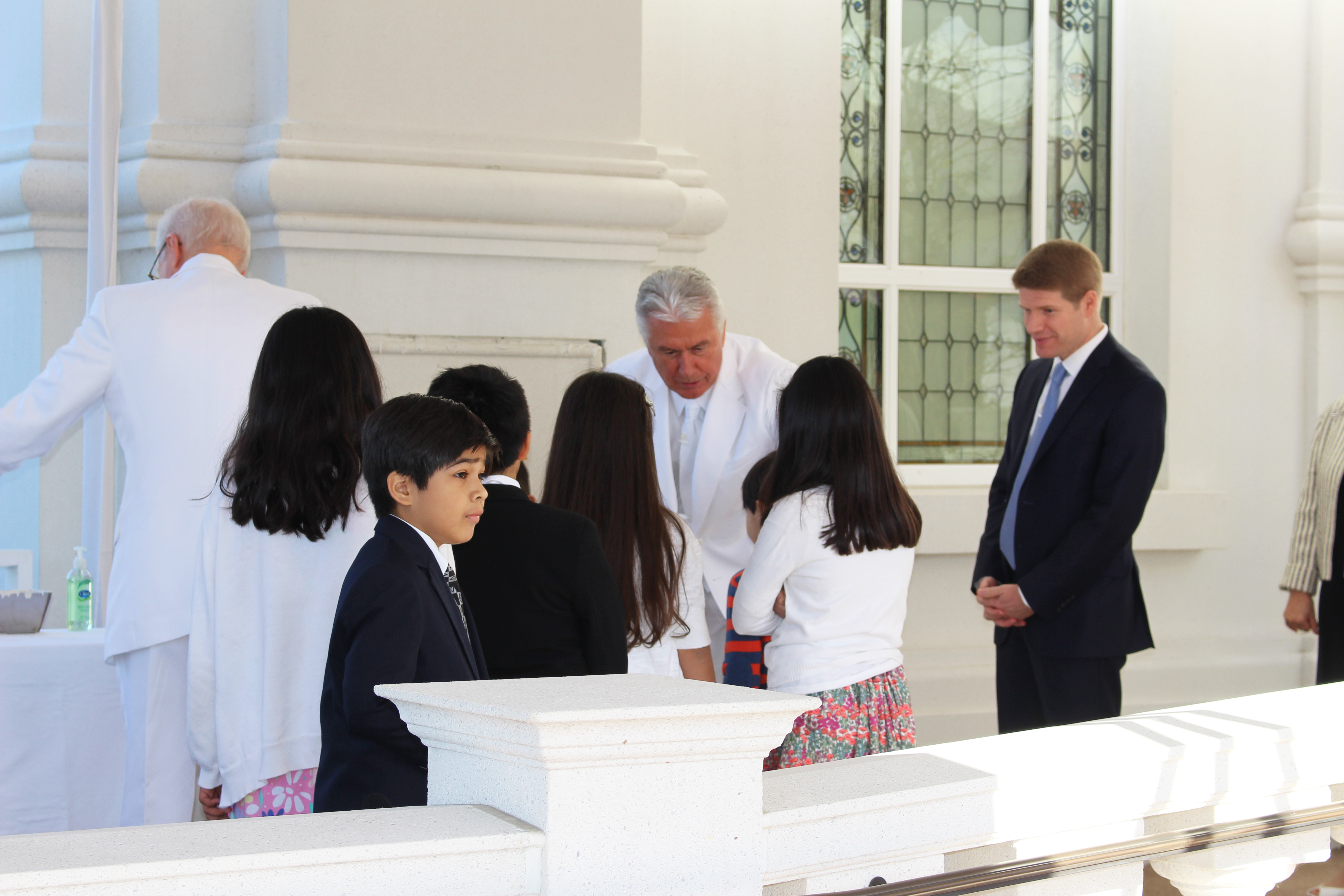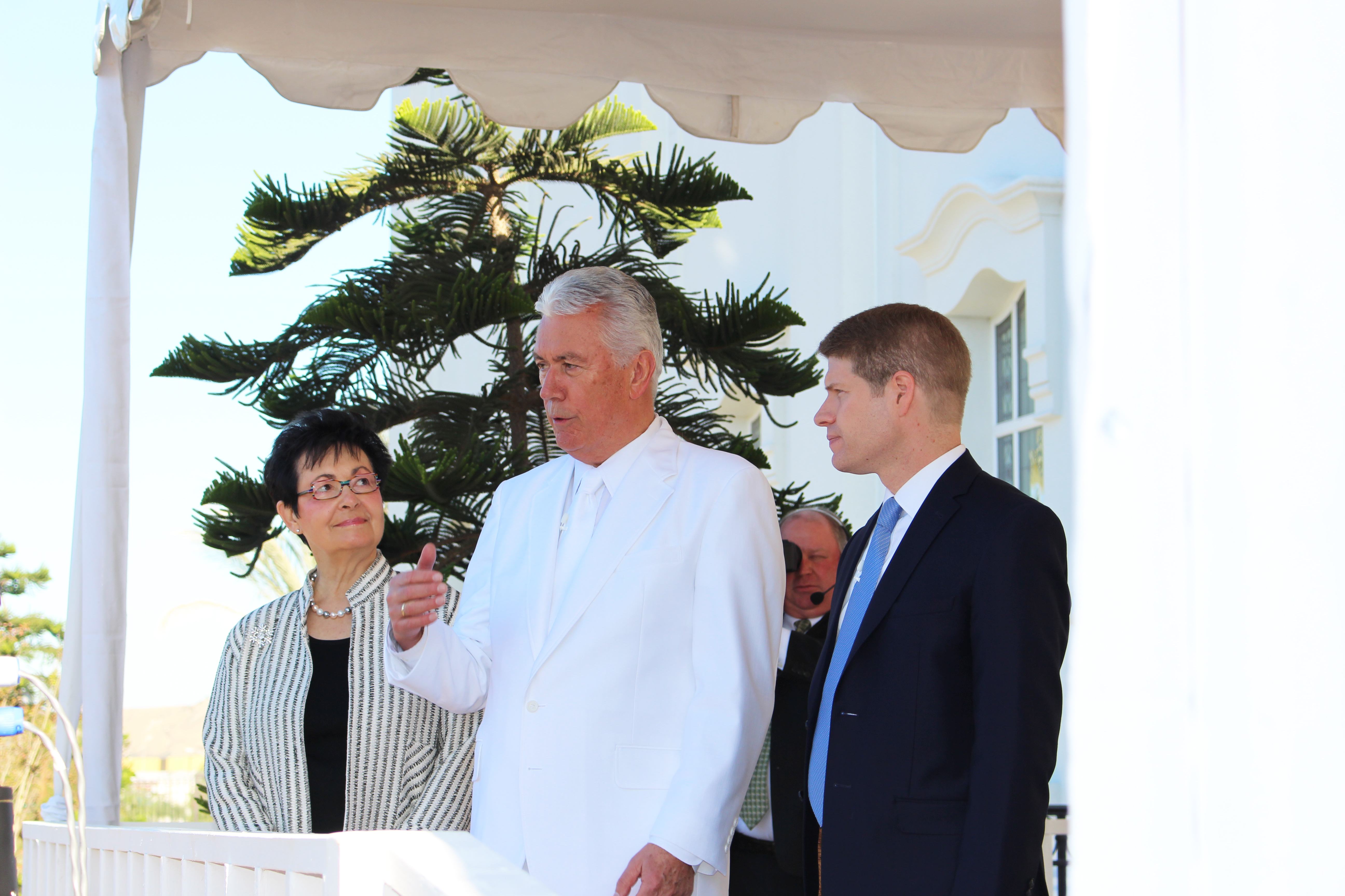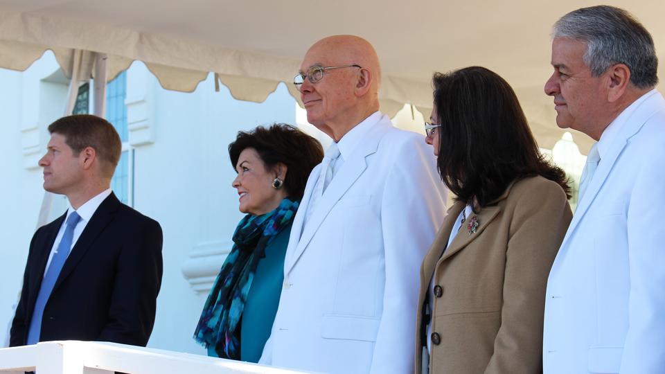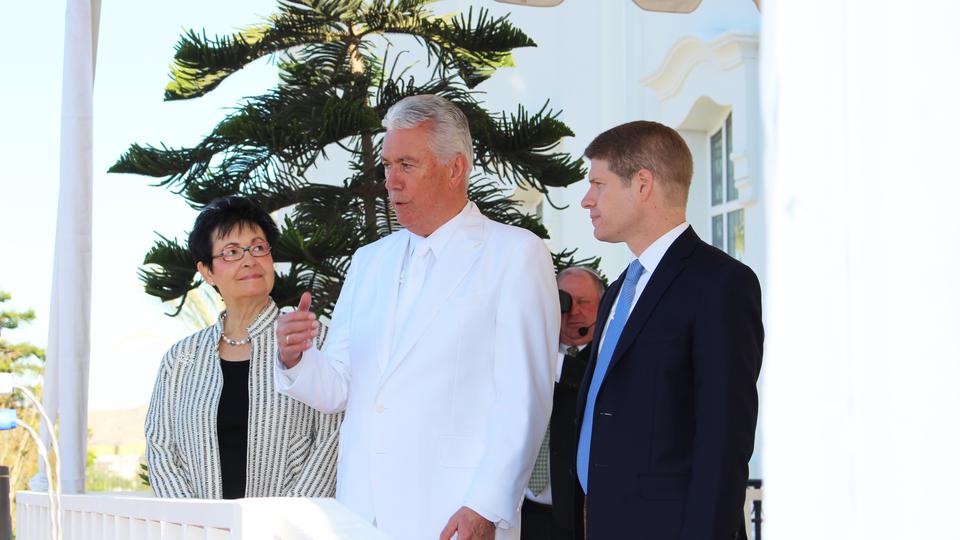 During the traditional cornerstone ceremony signifying that the temple is complete, President Uchtdorf called on the assistance of Church leaders and local Latter-day Saints to help him place mortar around the cornerstone.