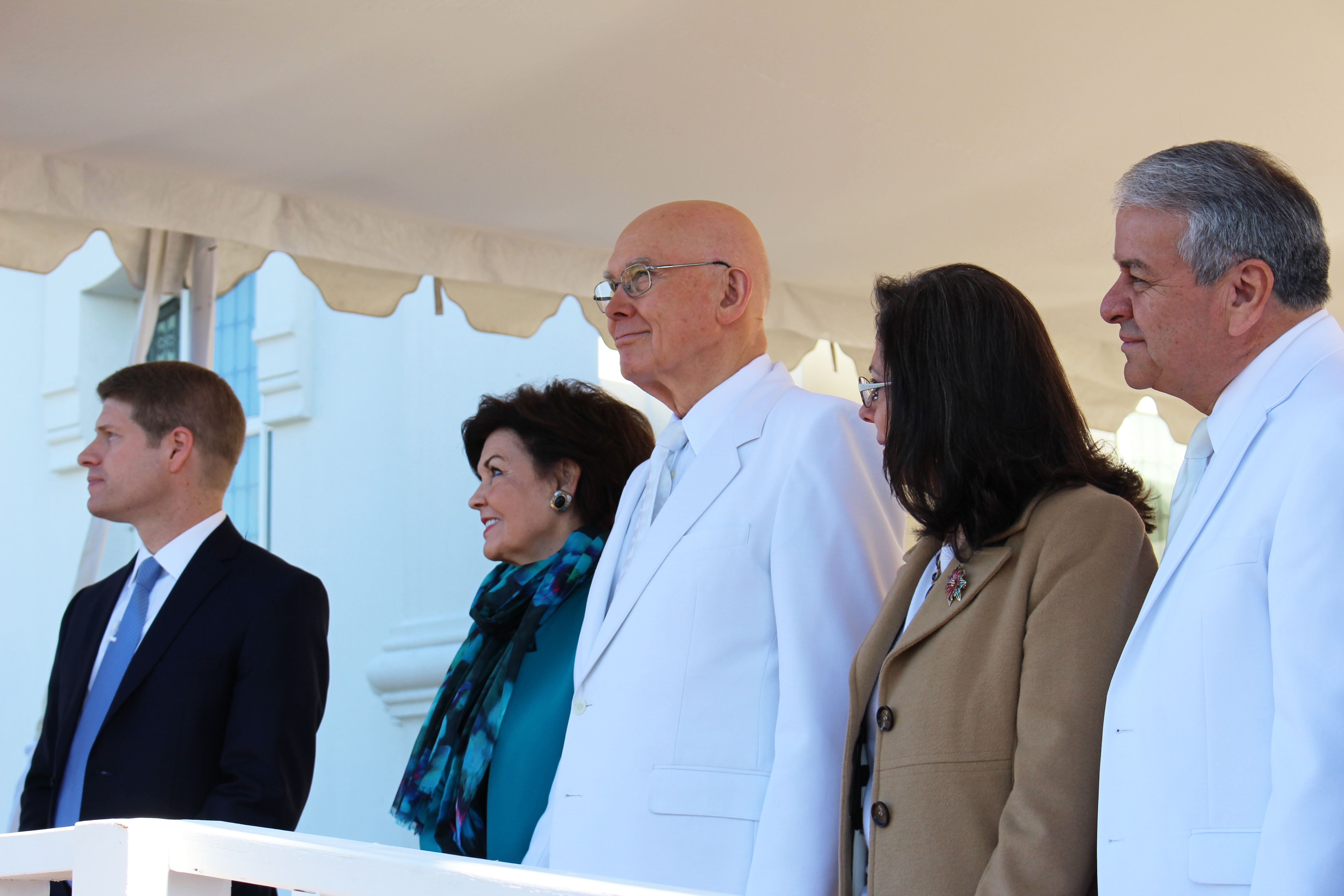 Assisting him at the dedication services were Elder Dallin H. Oaks of the Quorum of the Twelve Apostles, Elder Larry Y. Wilson of the Seventy and assistant executive director of the Temple Department, and members of the Mexico Area Presidency — Elders Benjamin De Hoyos, Paul B. Pieper and Arnulfo Valenzuela, also of the Seventy.