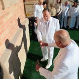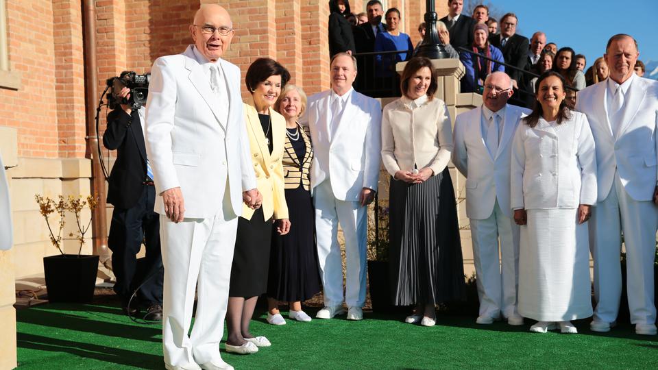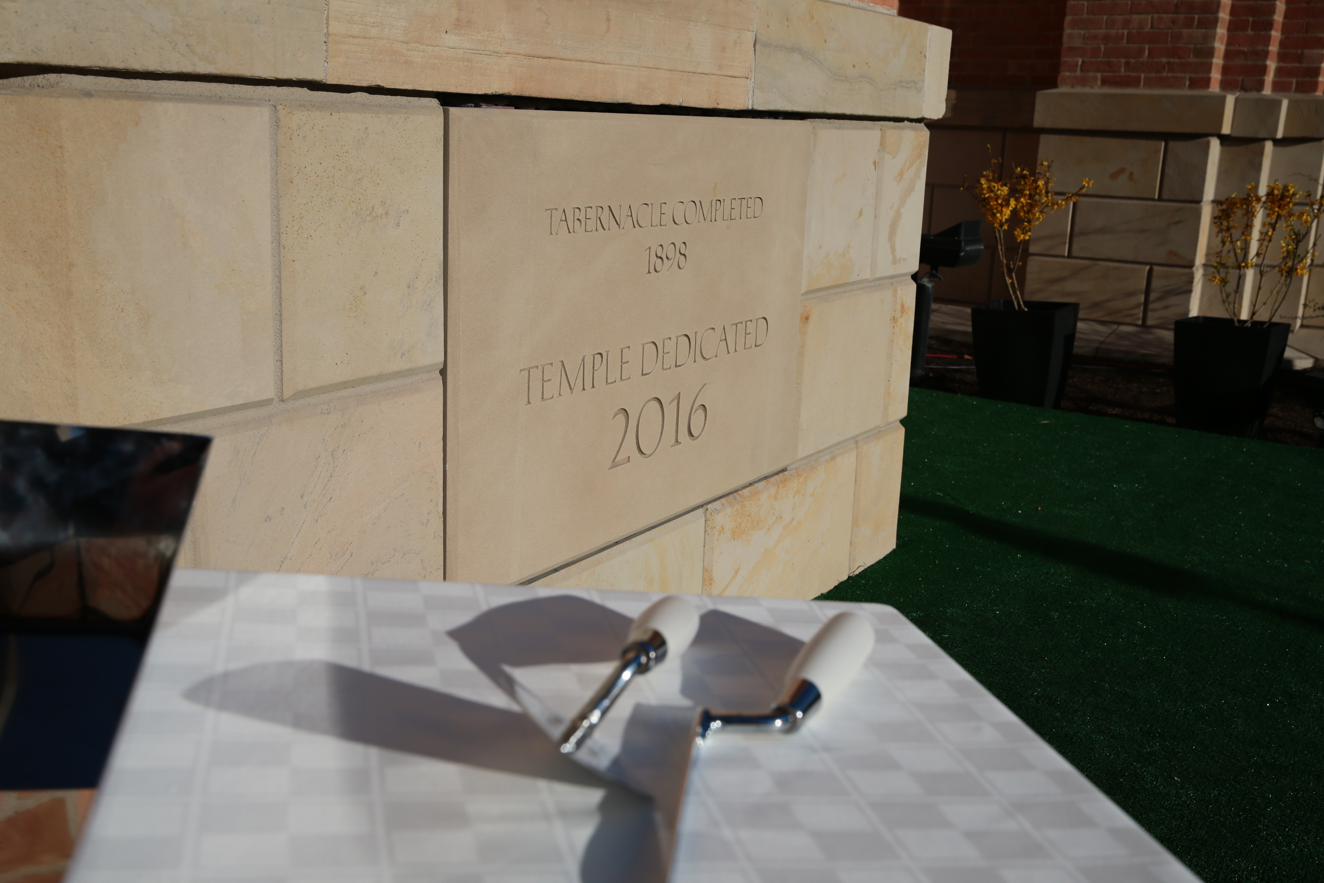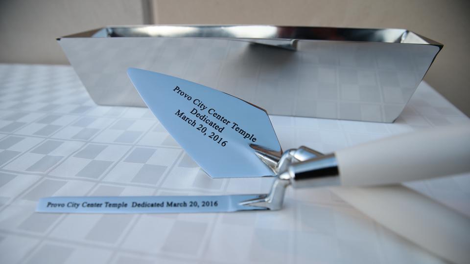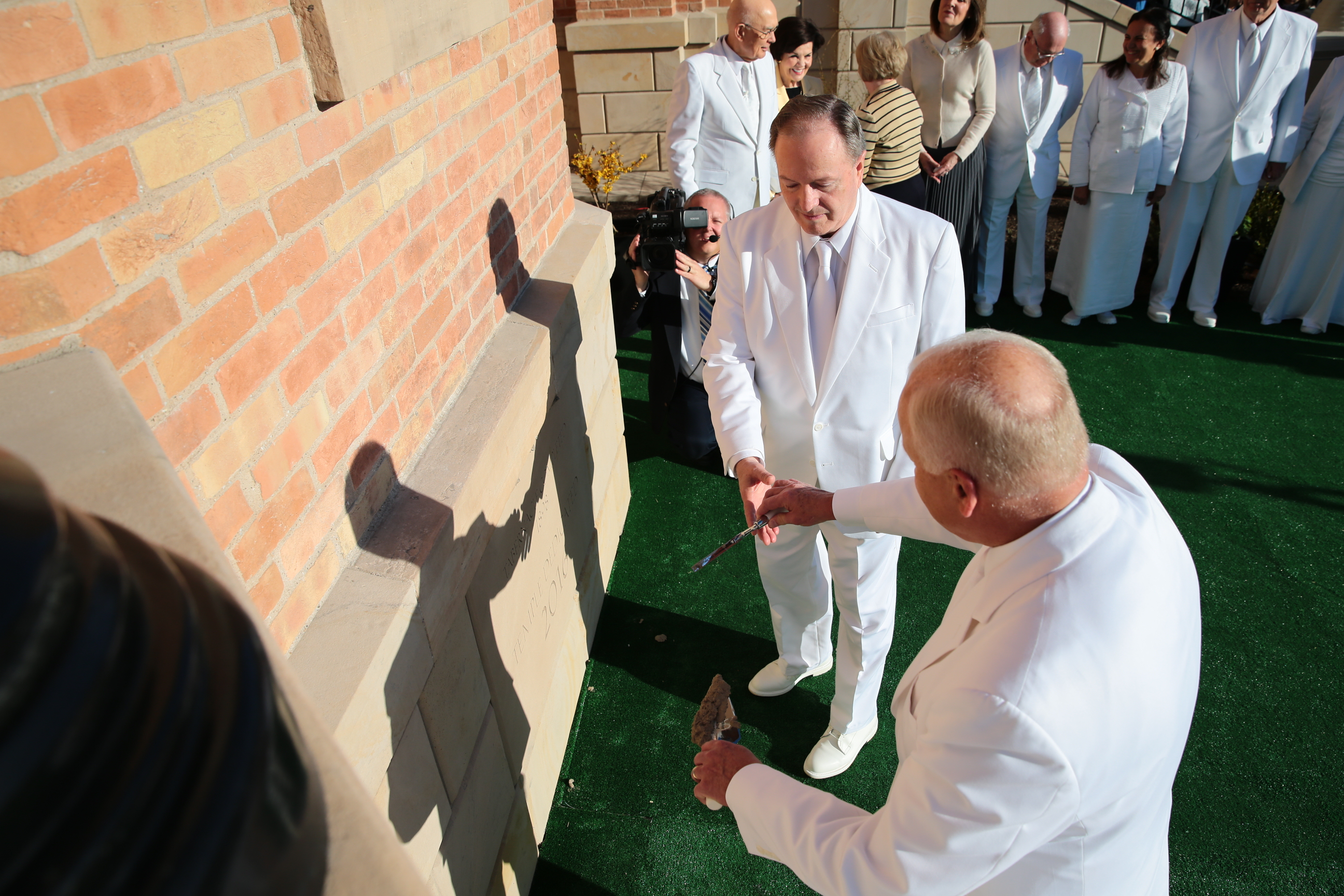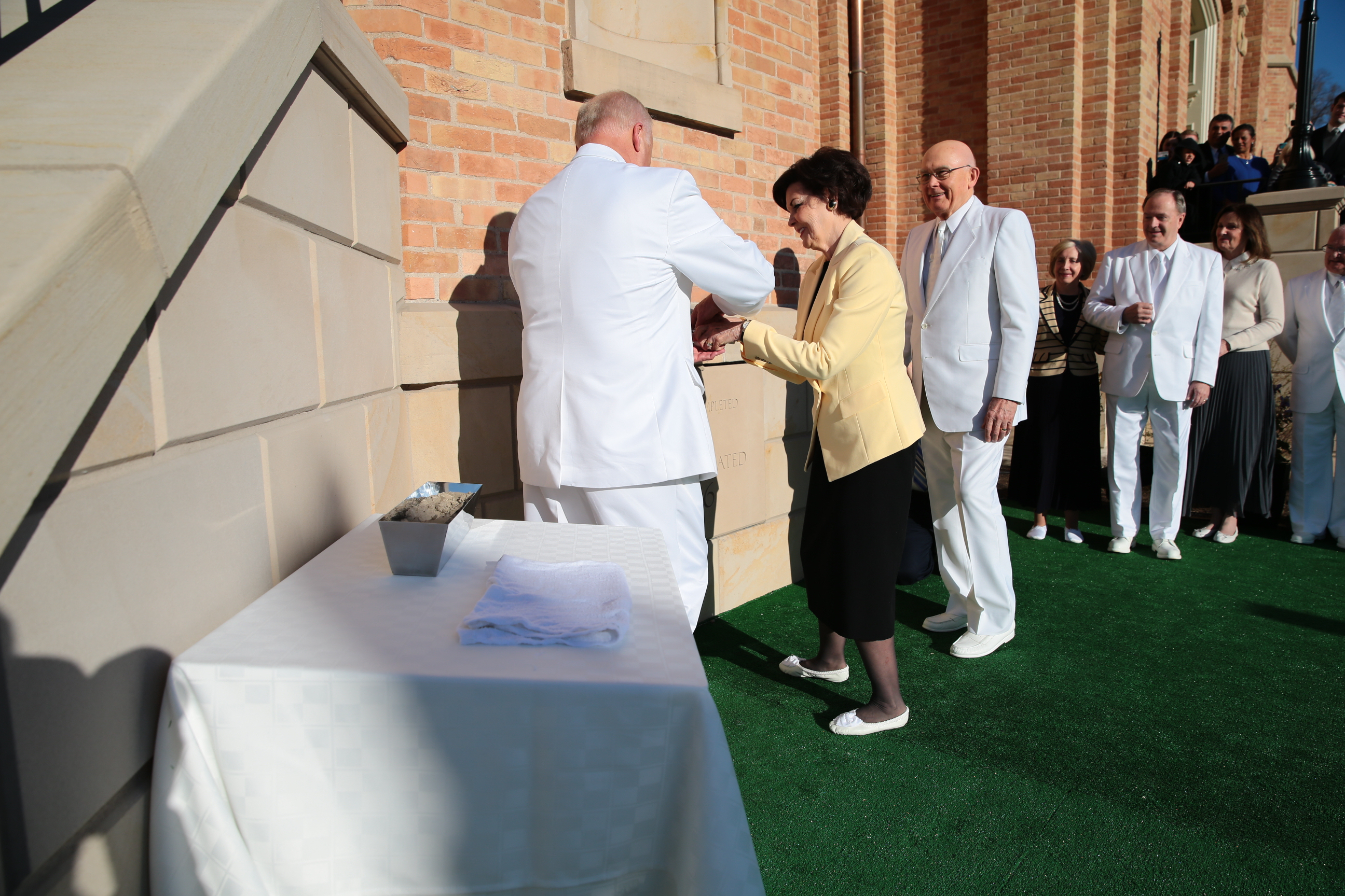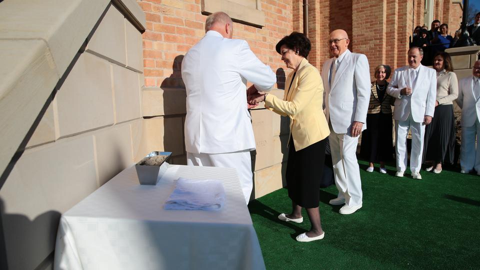 Prior to the first dedicatory session, Elder Oaks and Elders Lynn G. Robbins of the Presidency of the Seventy, Elder Richards and the new temple presidency, helped secure the cornerstone with mortar, the symbolic completion of the temple.