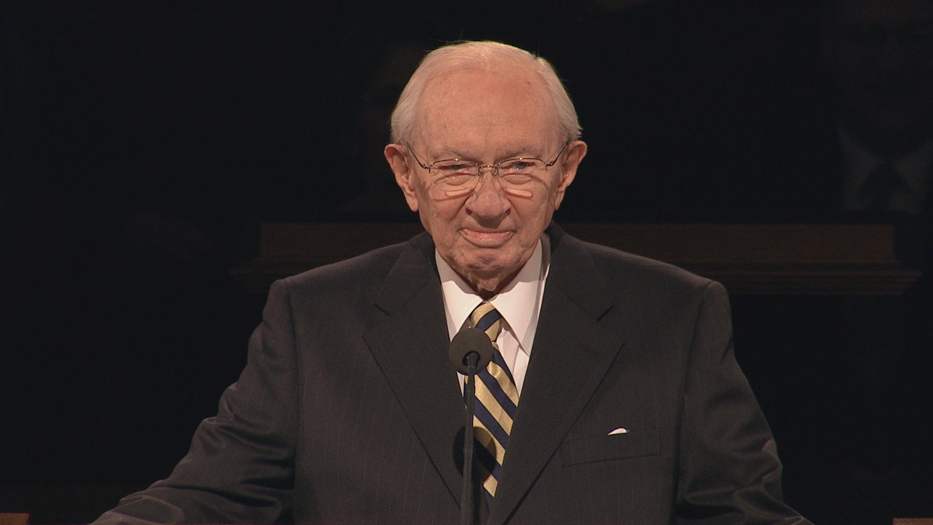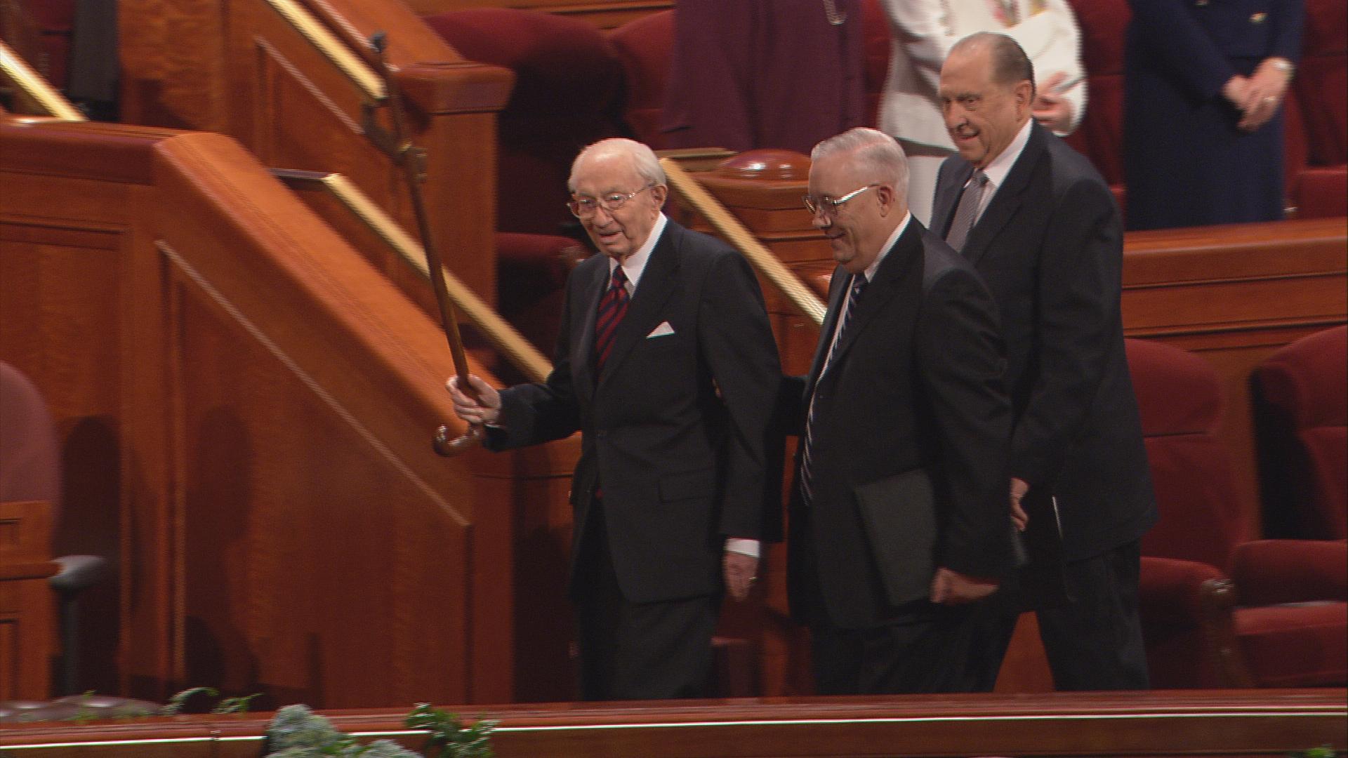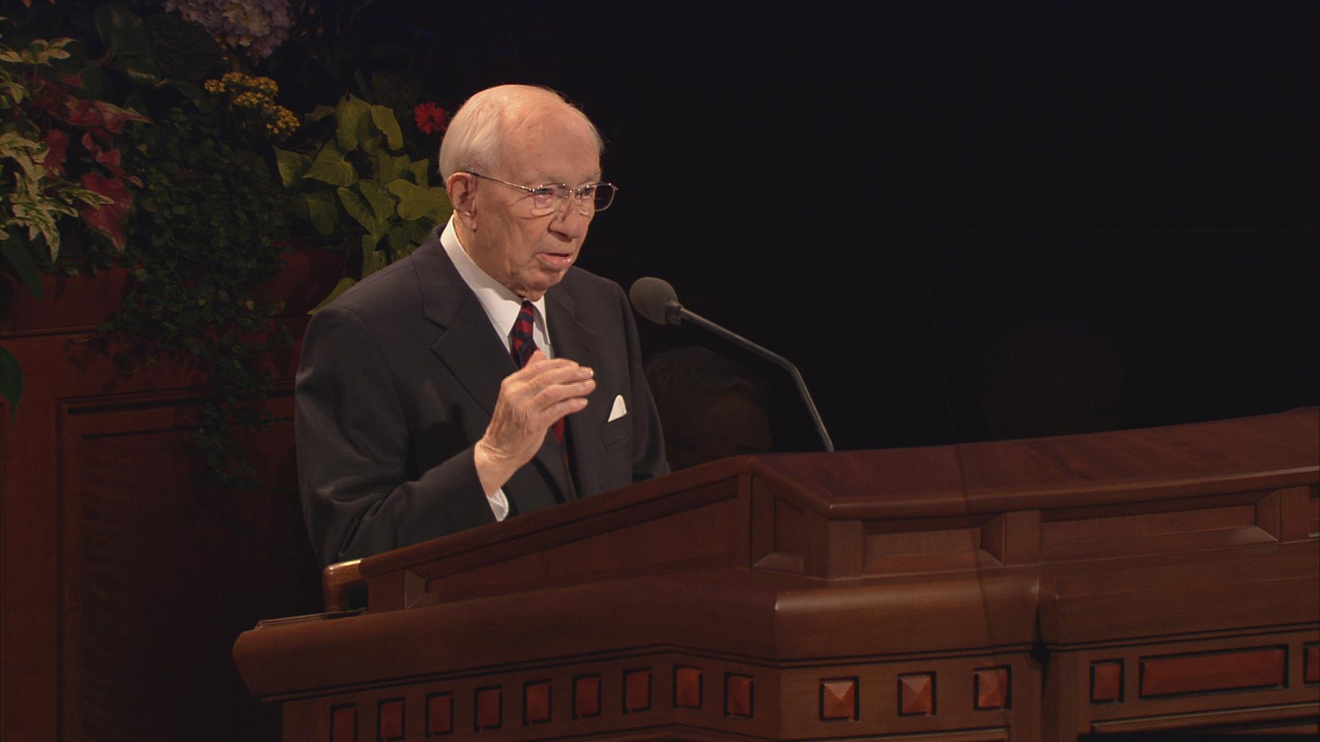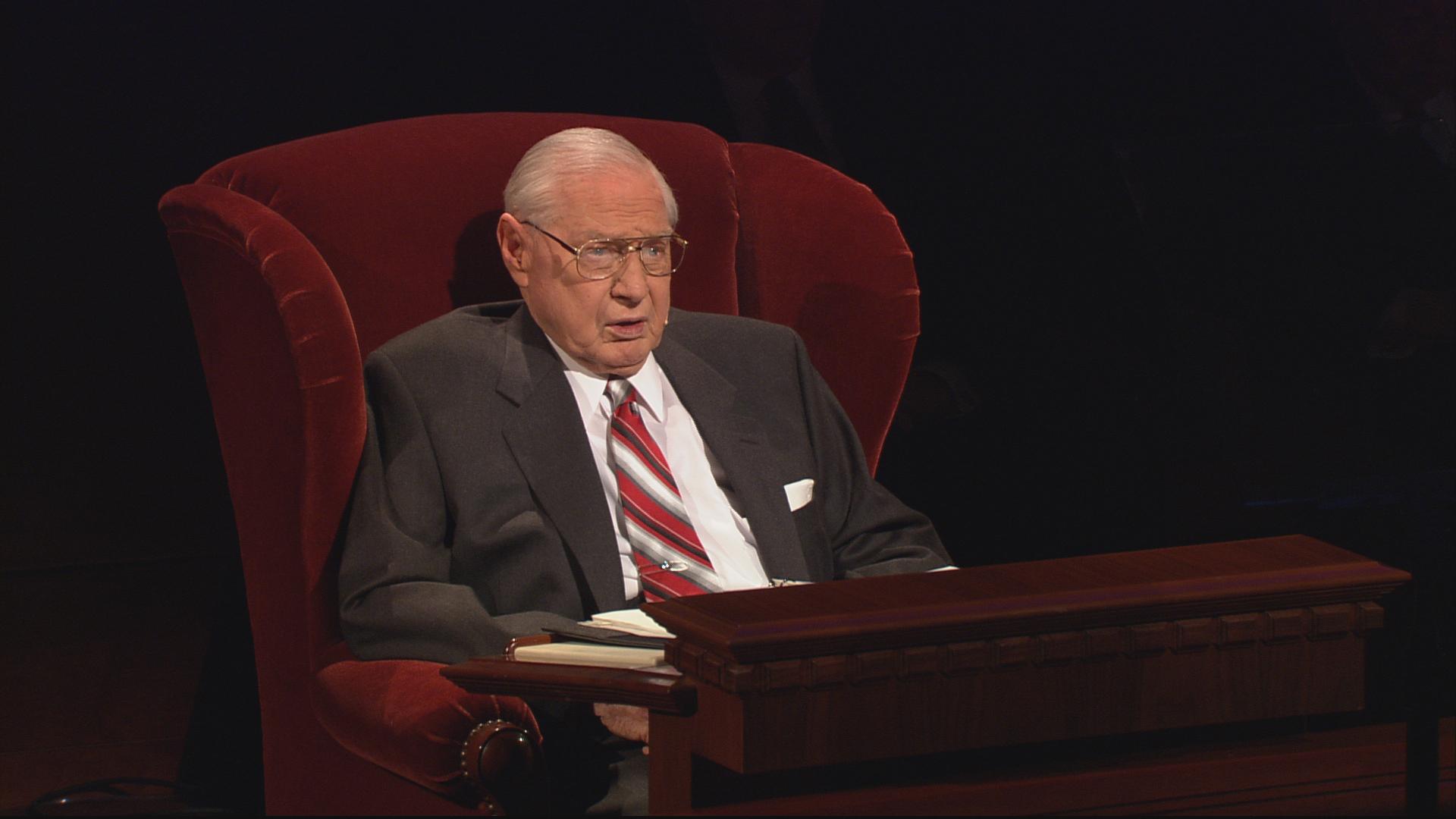 With his well-known humor and wit, President Gordon B. Hinckley, age 96, said in his Sunday morning address, “The wind is blowing, and I feel like the last leaf on the tree. Actually my health is quite good, despite all the rumors to the contrary. Skillful doctors and nurses keep me on the right track, and some of you may go before I do.”