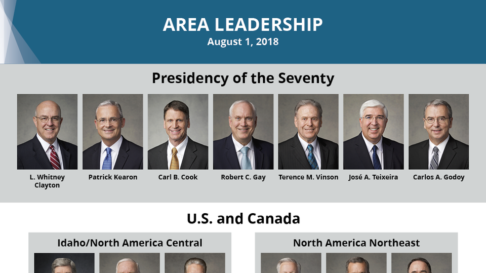 The First Presidency of The Church of Jesus Christ of Latter-day Saints has announced new area leadership assignments for each of its 21 global geographic regions, which will take effect August 1, 2018*. Unique in this year’s announcement is the calling of area presidencies for regions in the U.S. and Canada, which will be divided into six areas. (Note: Until August 1, 2018, the Presidents of the Seventy will continue to provide direct supervision for the U.S. and Canada.)