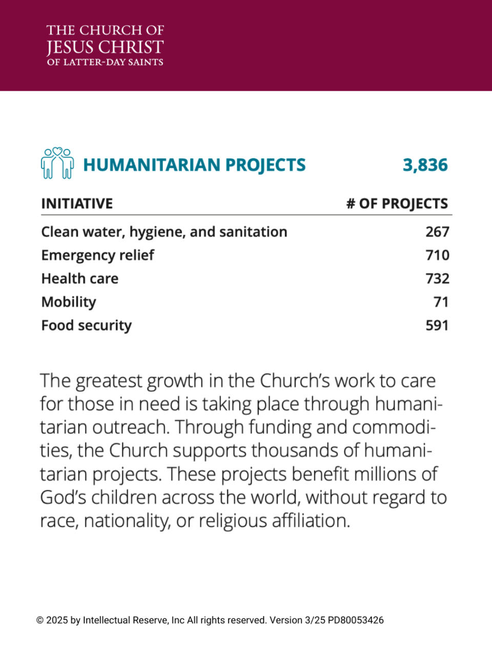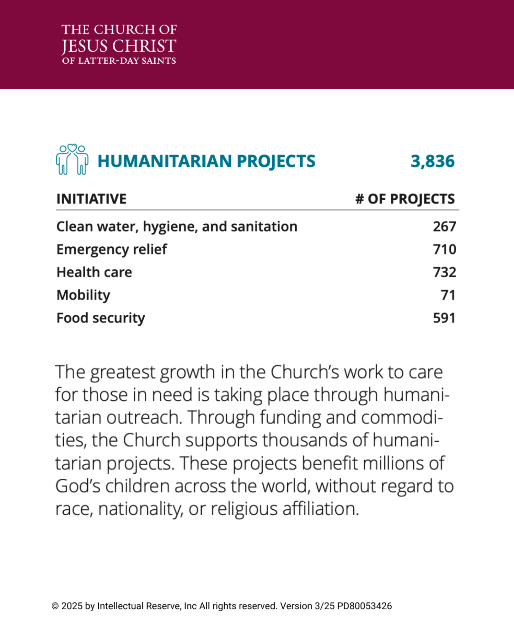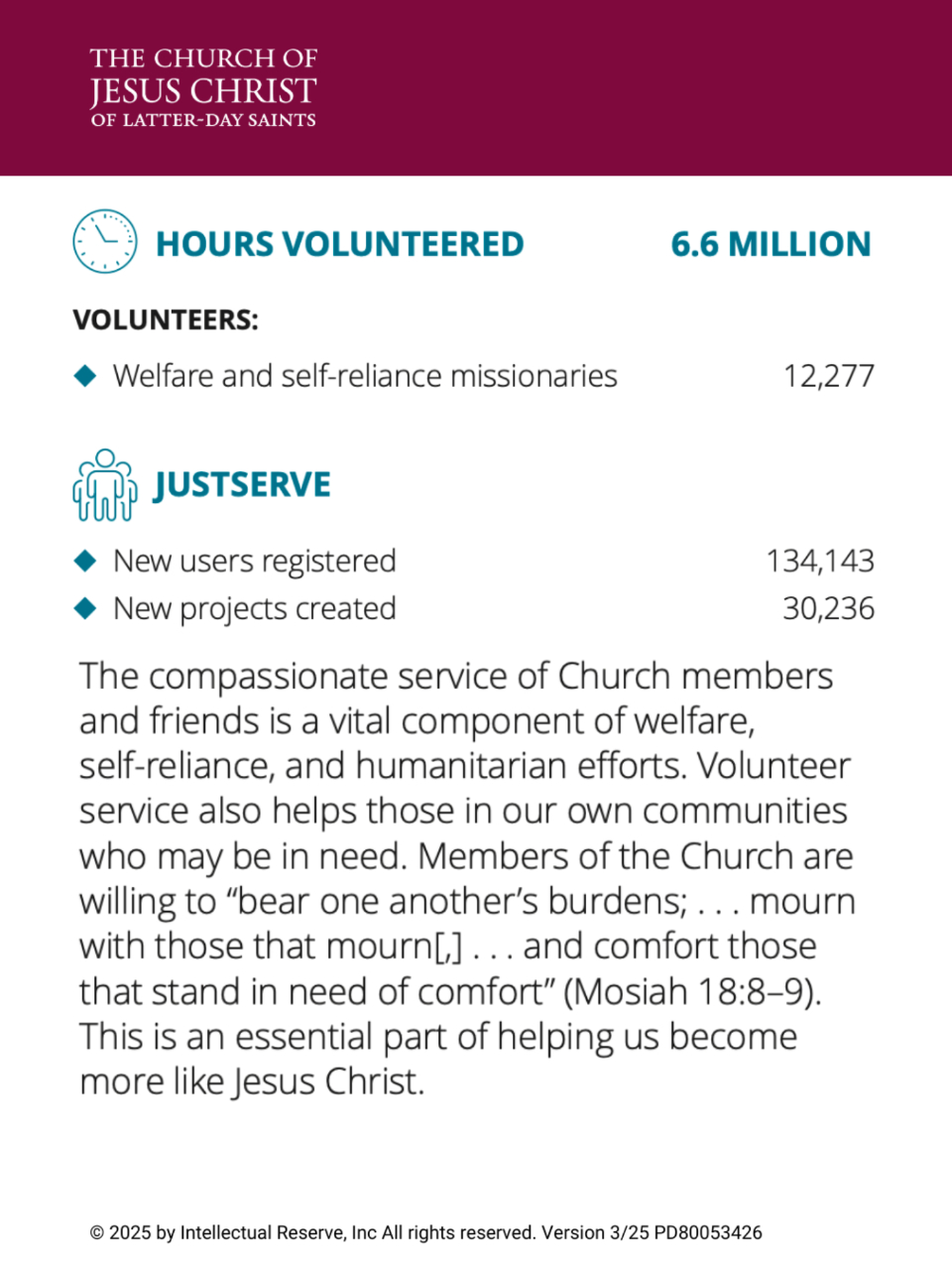 The 2024 “Caring for Those in Need” summary highlights the Church’s commitment to welfare, self-reliance, humanitarian aid, emergency relief, and volunteer service, with expenditures totaling US$1.45 billion. The Church provided assistance in 192 countries and territories, showing its global reach. This included 3,836 humanitarian projects. Church members volunteered 6.6 million hours of service at Church Welfare and Self-reliance facilities, in service missions, and in community service projects, demonstrating their dedication to caring for God’s children.