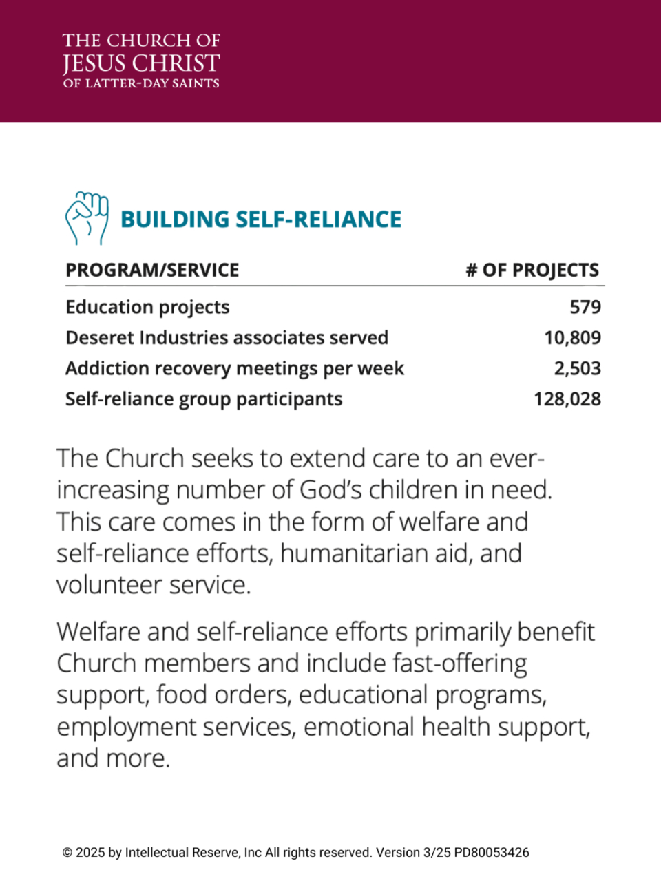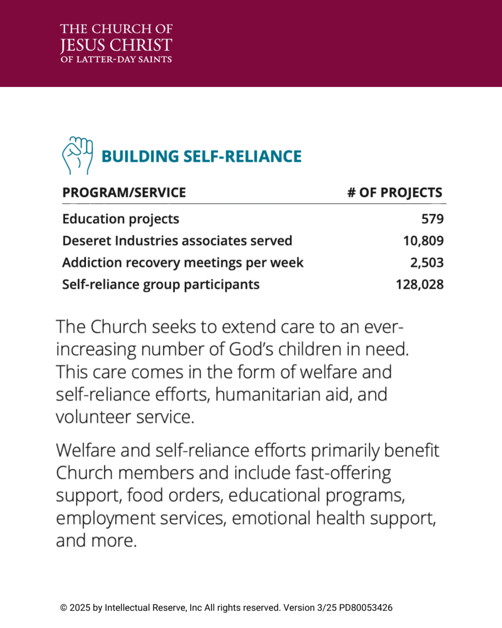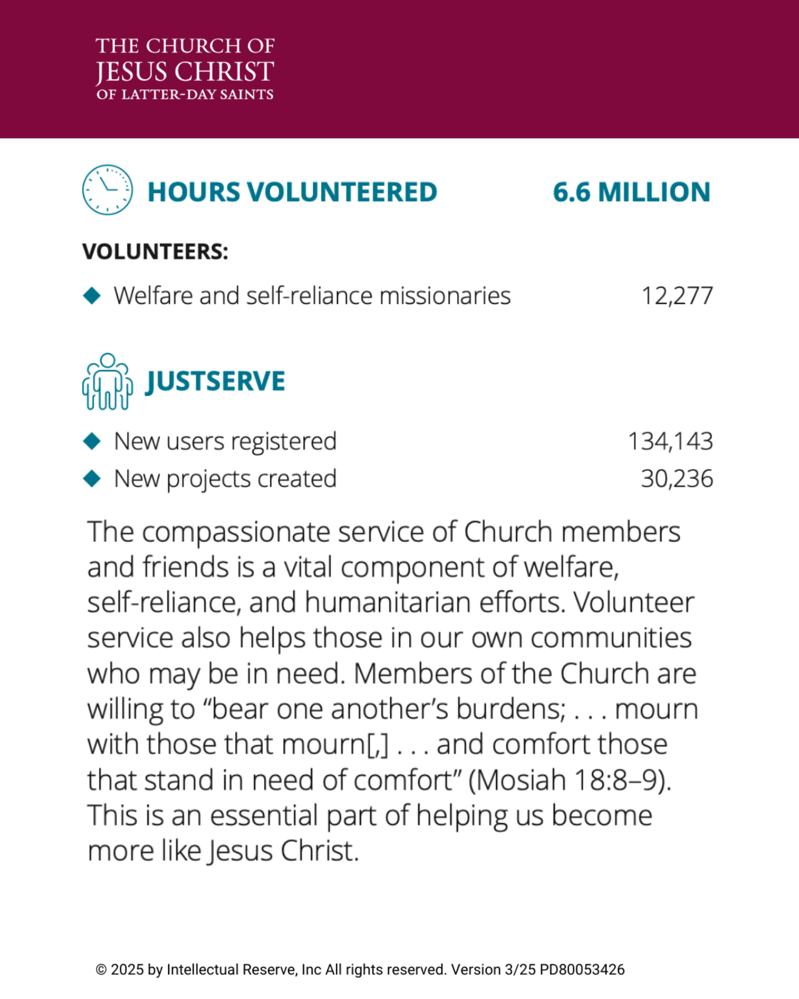 The 2024 “Caring for Those in Need” summary highlights the Church’s commitment to welfare, self-reliance, humanitarian aid, emergency relief, and volunteer service, with expenditures totaling US$1.45 billion. The Church provided assistance in 192 countries and territories, showing its global reach. This included 3,836 humanitarian projects. Church members volunteered 6.6 million hours of service at Church Welfare and Self-reliance facilities, in service missions, and in community service projects, demonstrating their dedication to caring for God’s children.