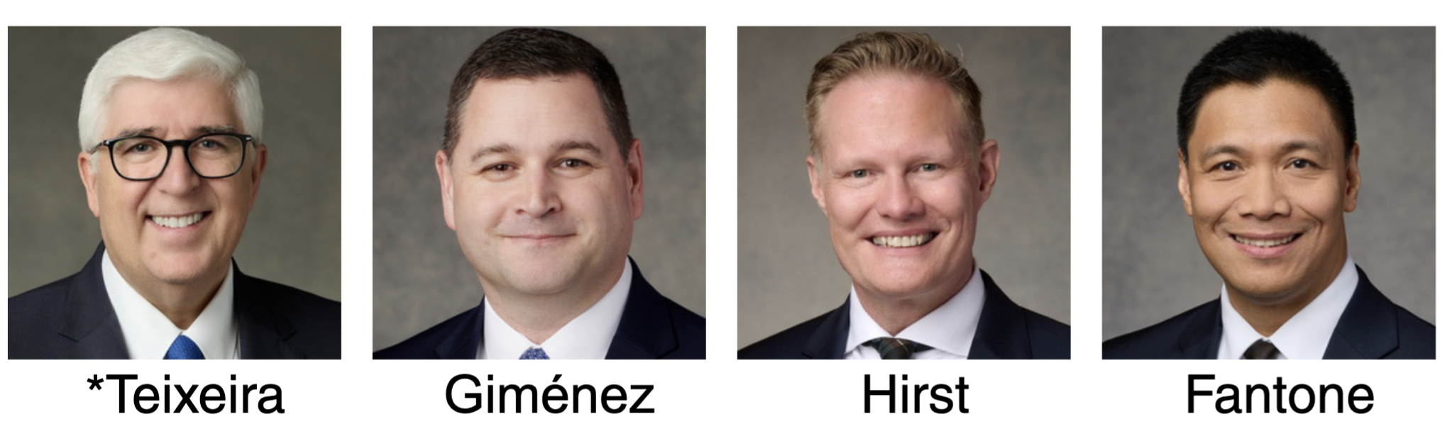 The United States Central Area Presidency for 2026–2027, from left to right: Elder José A. Teixeira, President; Elder Ricardo P. Giménez; Elder Karl D. Hirst; and Elder James O. Fantone.