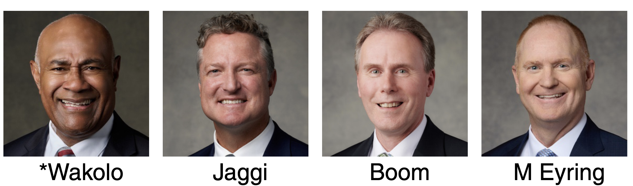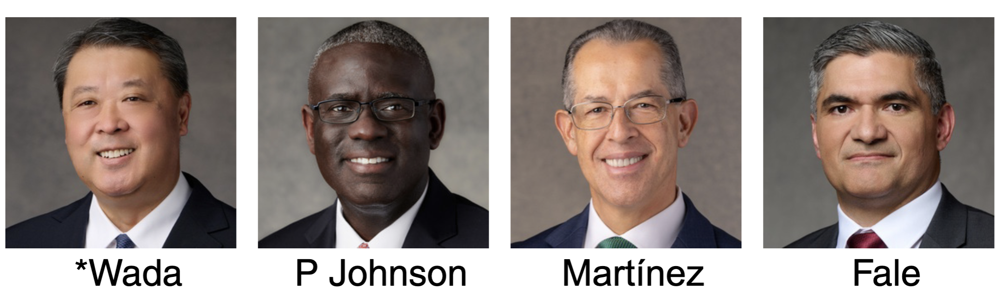 The United States West Area Presidency for 2026–2027, from left to right: Elder Takashi Wada, President; Elder Peter M. Johnson; Elder Hugo E. Martínez; and Elder Hutch U. Fale.