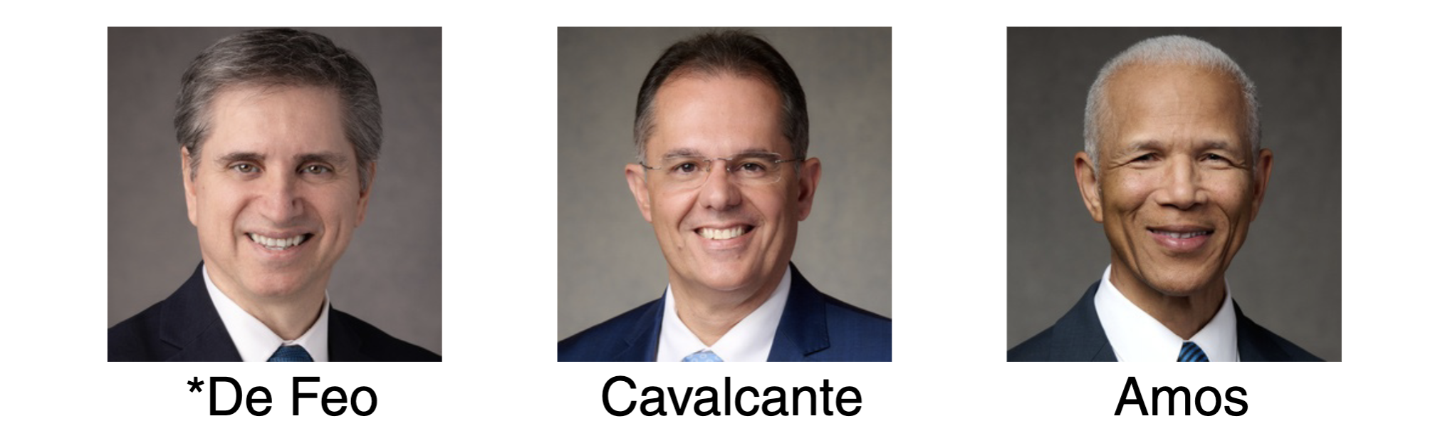 The United States Southeast Area Presidency for 2026–2027, from left to right: Elder Massimo De Feo, President; Elder Aroldo B. Cavalcante; and Elder John D. Amos.