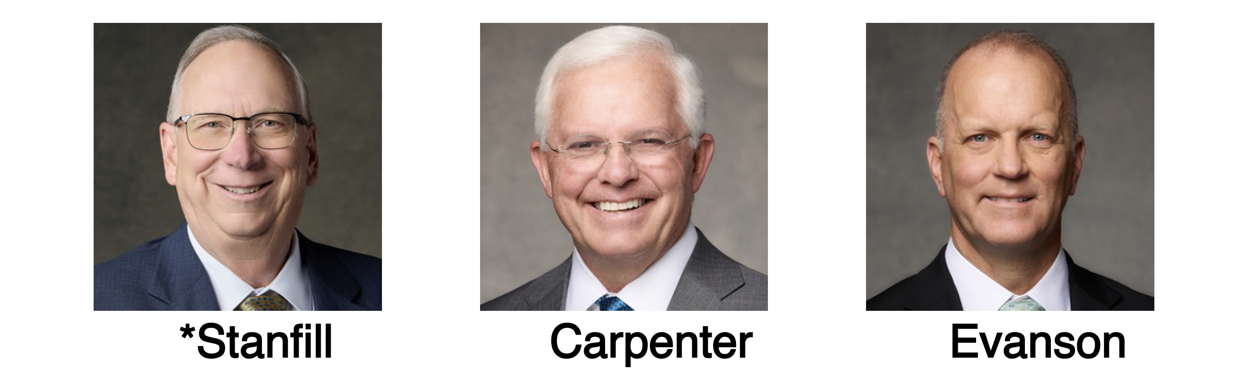 The Canada Area Presidency for 2026–2027, from left to right: Elder Vern P. Stanfill, President; Elder Matthew L. Carpenter; and Elder James E. Evanson.