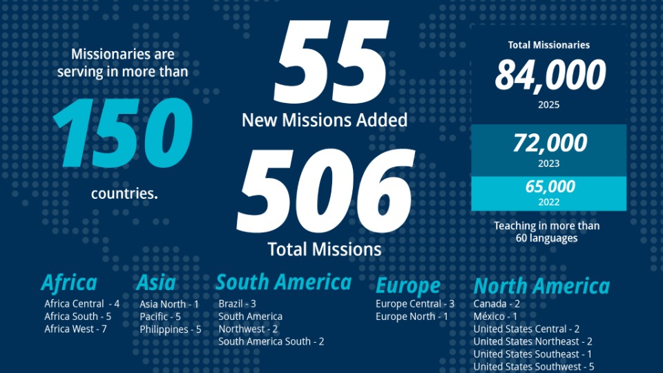 At a time when increasing numbers of young members of The Church of Jesus Christ of Latter-day Saints continue to choose to serve full-time missions, the Church is announcing plans to create an additional 55 missions, effective July 1, 2026. The new missions will help to accommodate a growing number of missionaries already called and will allow missionaries to better support the increasing number of congregations throughout the world.