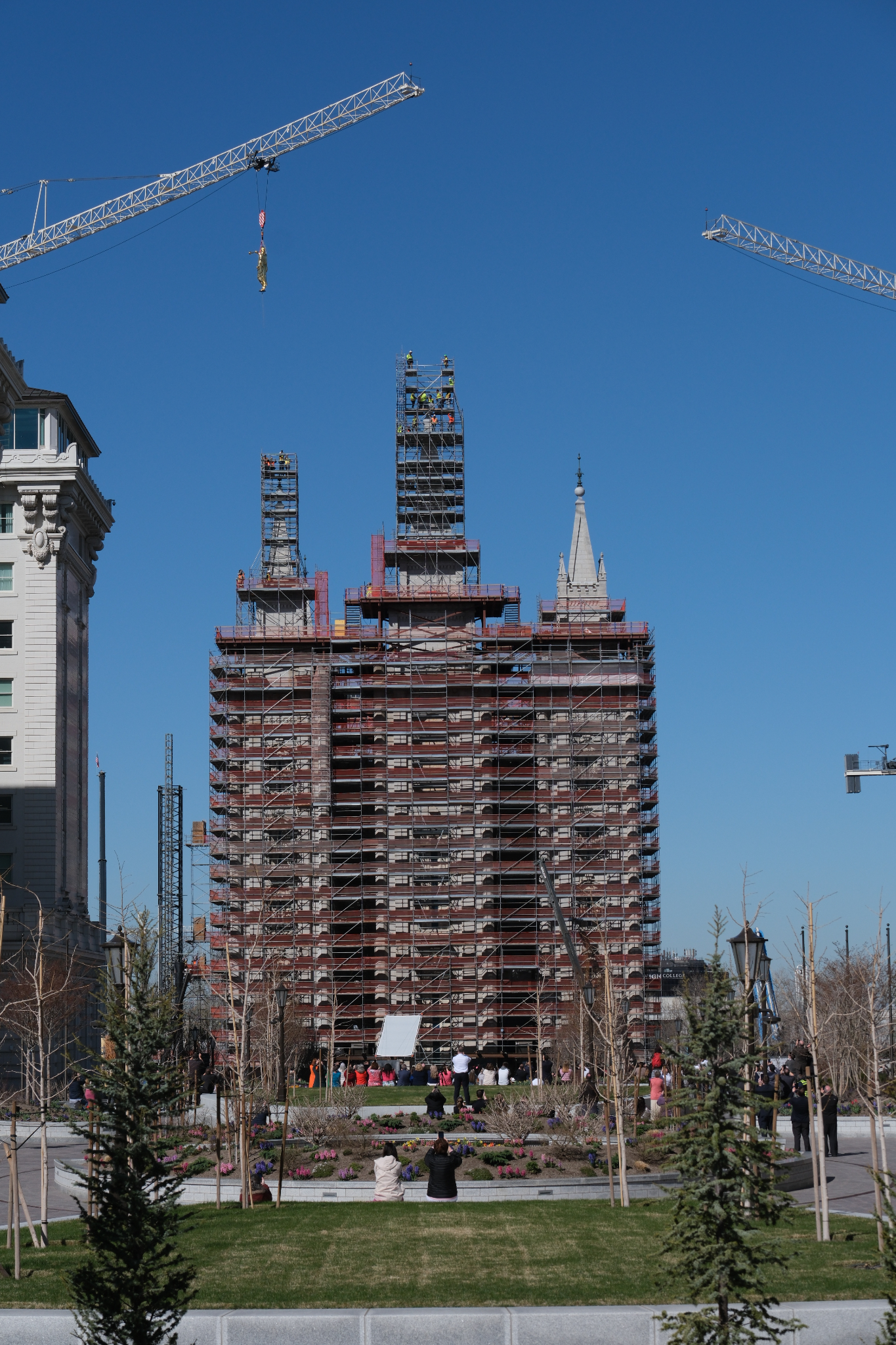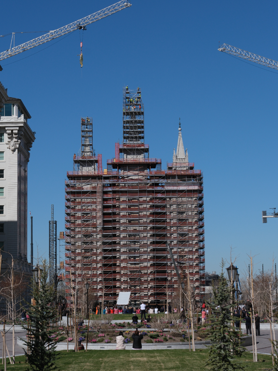 During a small gathering on Temple Square on the morning of Tuesday, April 2, 2024, the angel Moroni statue was returned to the top of the central east spire of the Salt Lake Temple. This house of the Lord has been undergoing a major seismic and foundational upgrade since the beginning of 2020.