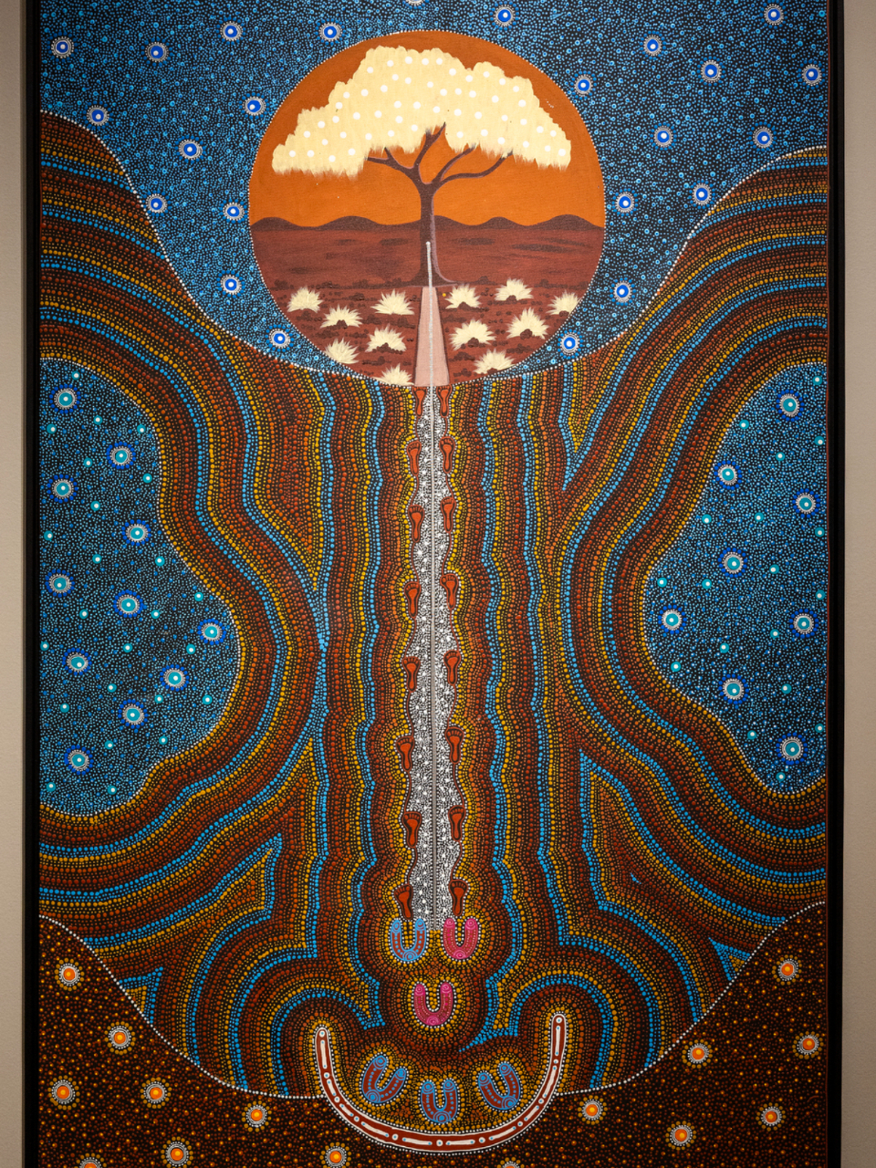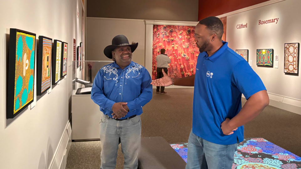 The exhibit features two types of paintings. The first is often called “dreamings,” which focuses on Aboriginal spirit traditions. The second is artistic renderings of the gospel of Jesus Christ.