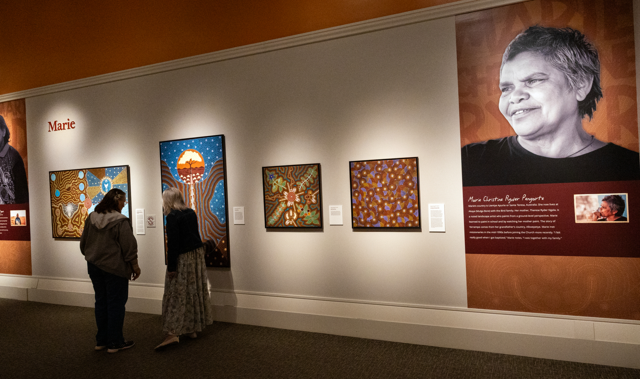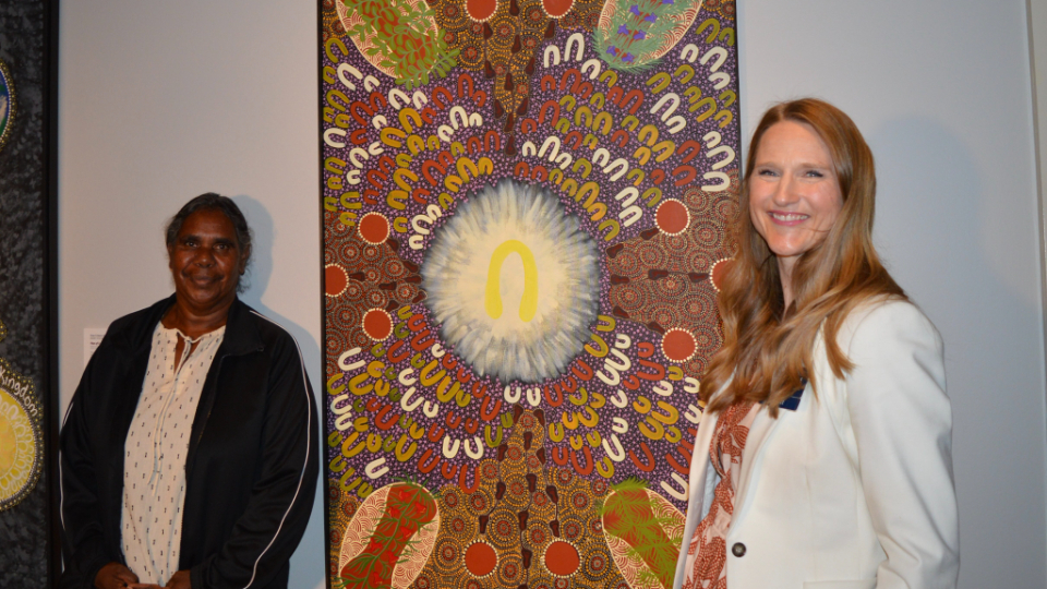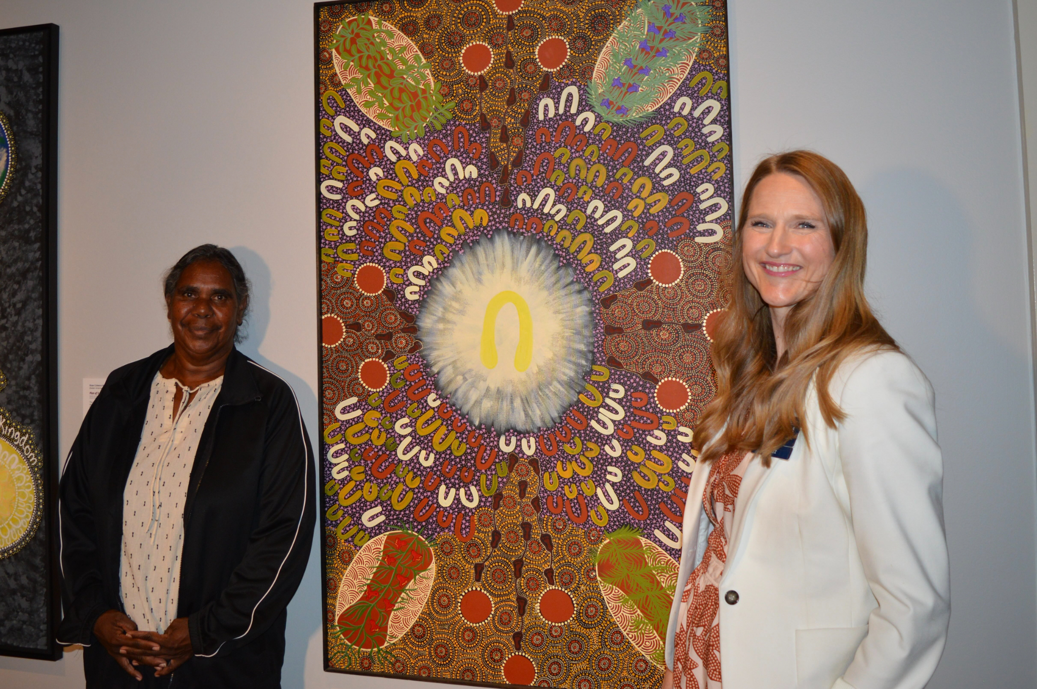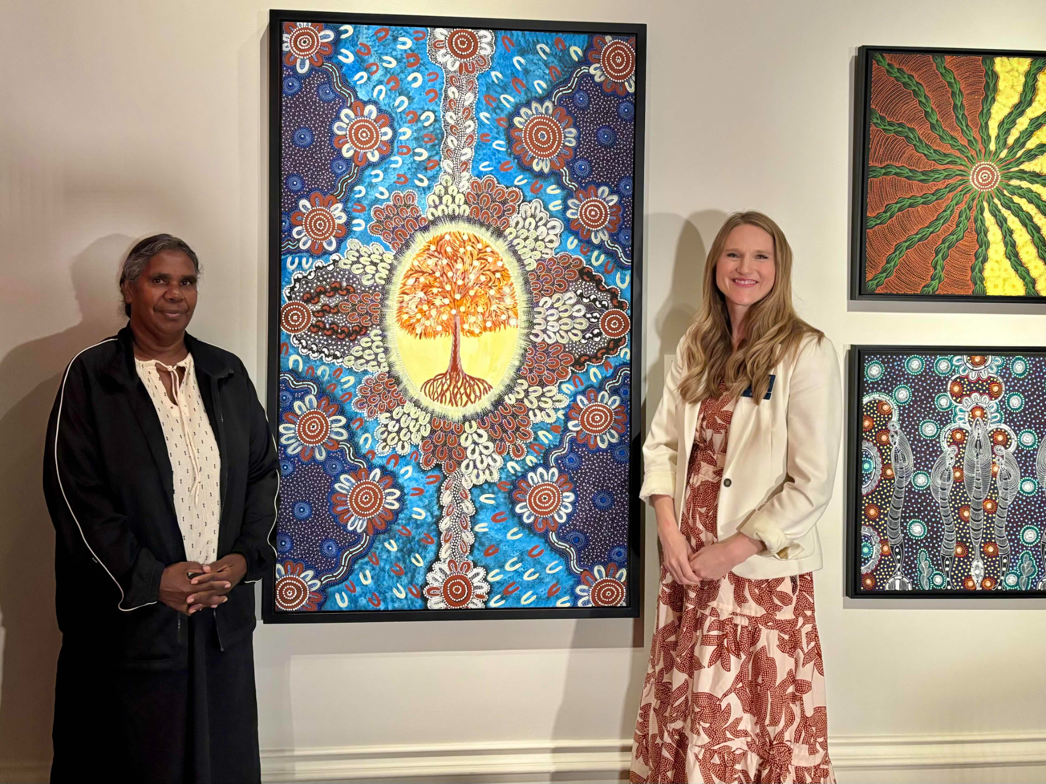 Colleen Wallace, left, stands with Church History Museum curator Laura Paulsen Howe in front of the "Tree of Life" painting featured in the new exhibit, “From Above: Aboriginal Australian Art from the Bird Family,” on March 26, 2026, at the Church History Museum in Salt Lake City.2026 by Intellectual Reserve, Inc. All rights reserved.About the Church History Museum