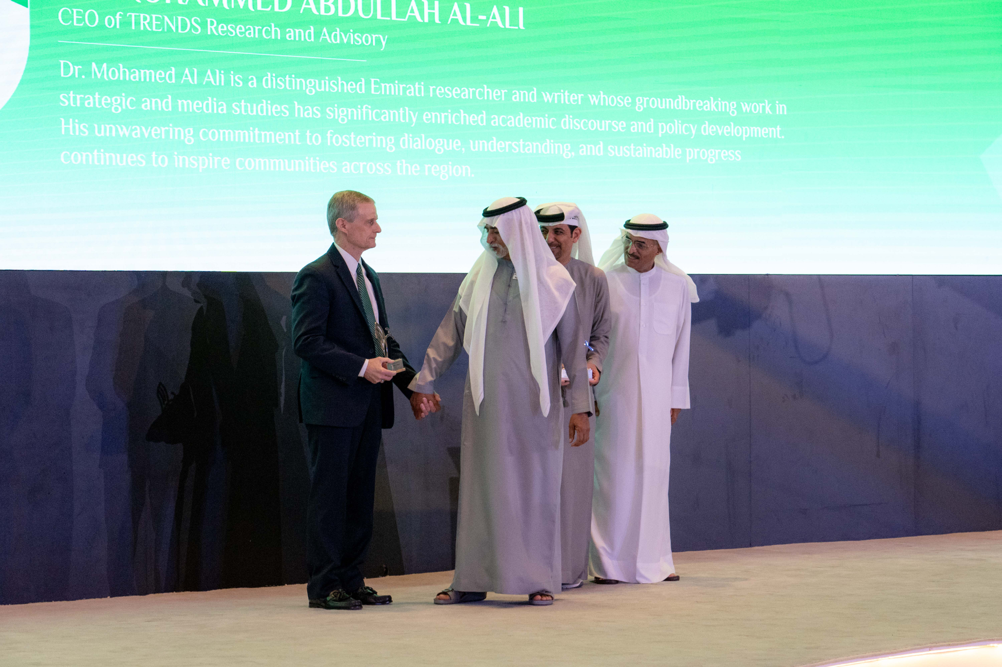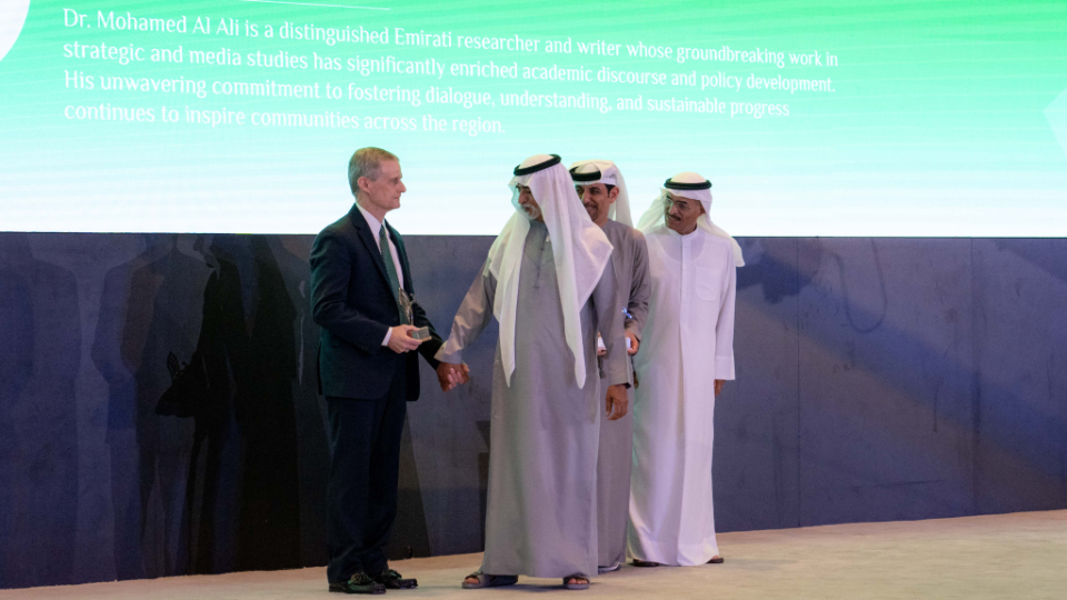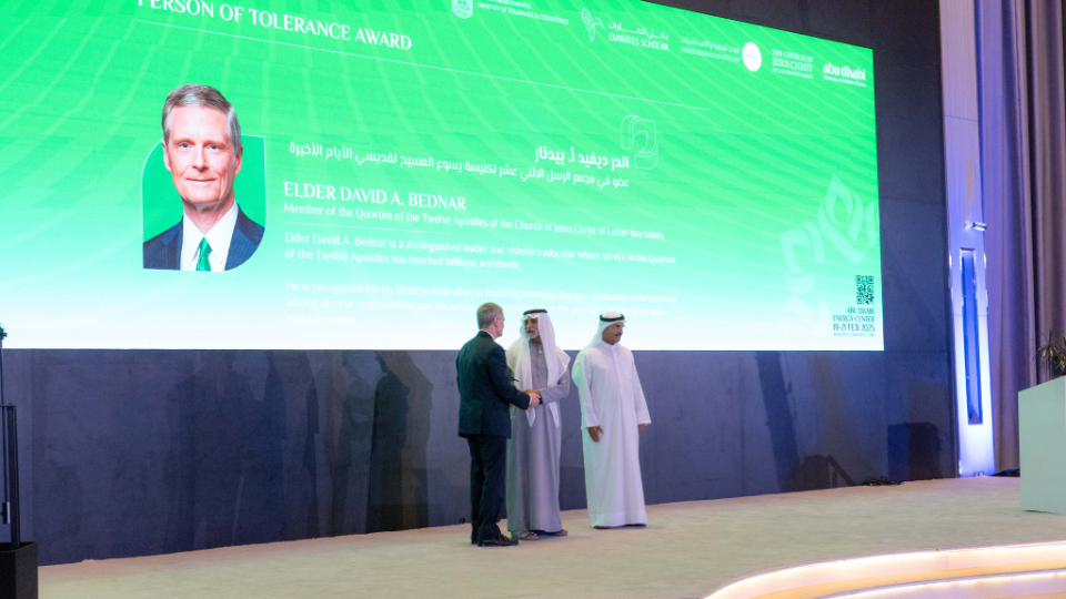 In addition to being a keynote speaker, Elder Bednar received the Tolerance Award on behalf of the Church during the opening ceremony. As the Apostle left the stage, His Excellency Sheikh Nahyan Mubarak Al Nahyan (the organizer of the conference) held his hand — an important symbol that the Sheikh holds Elder Bednar and the Church in high regard.