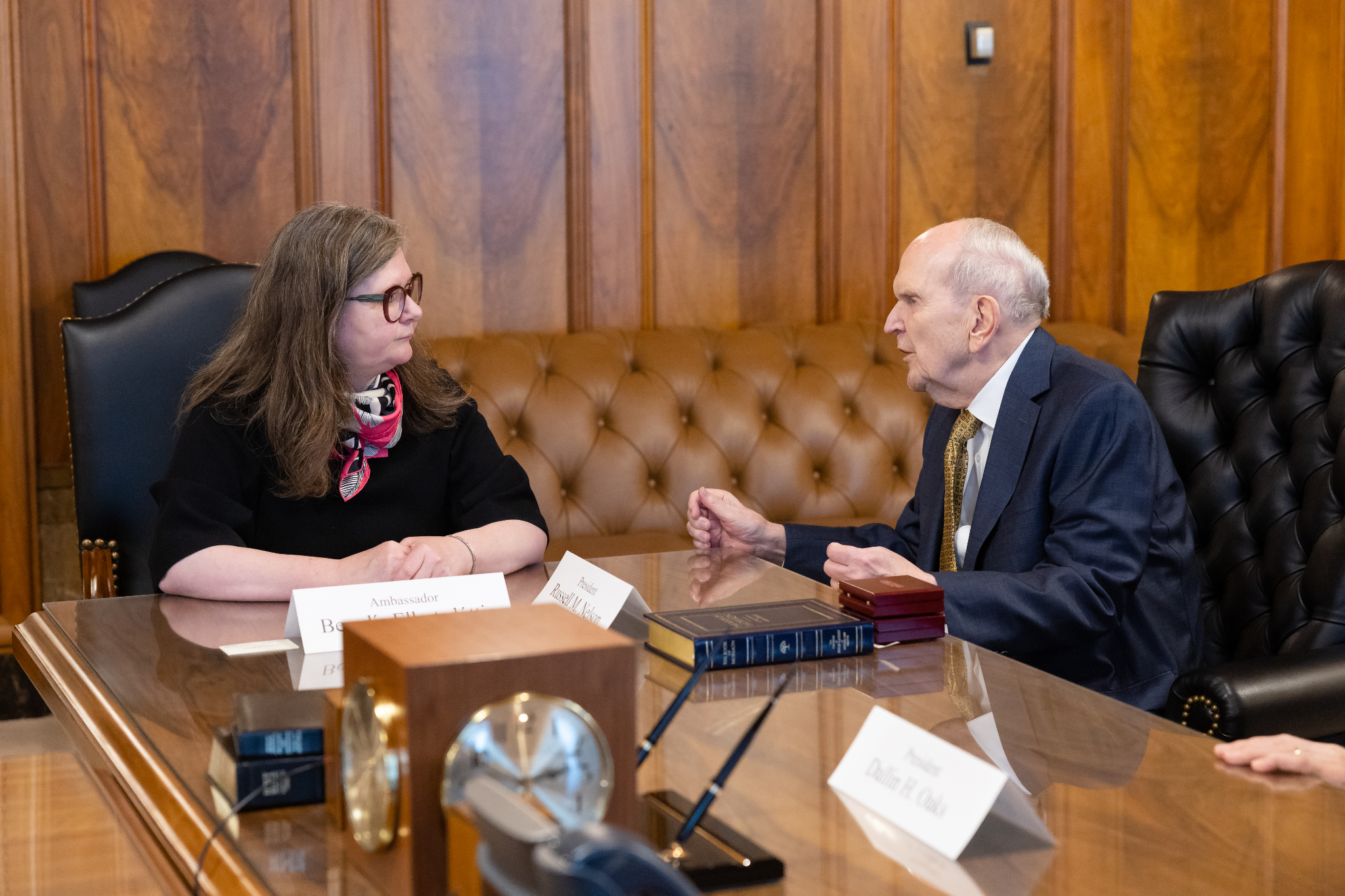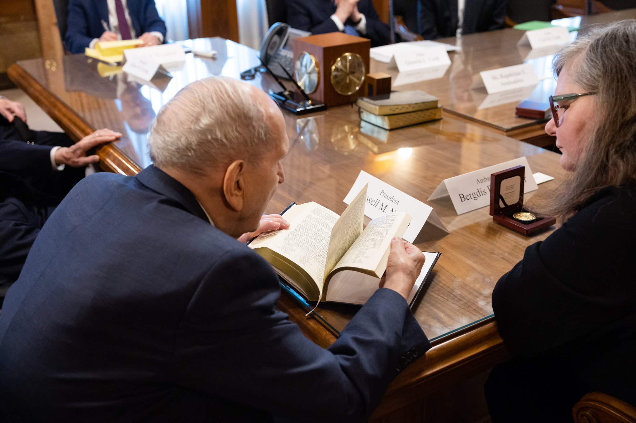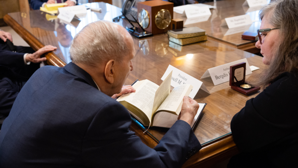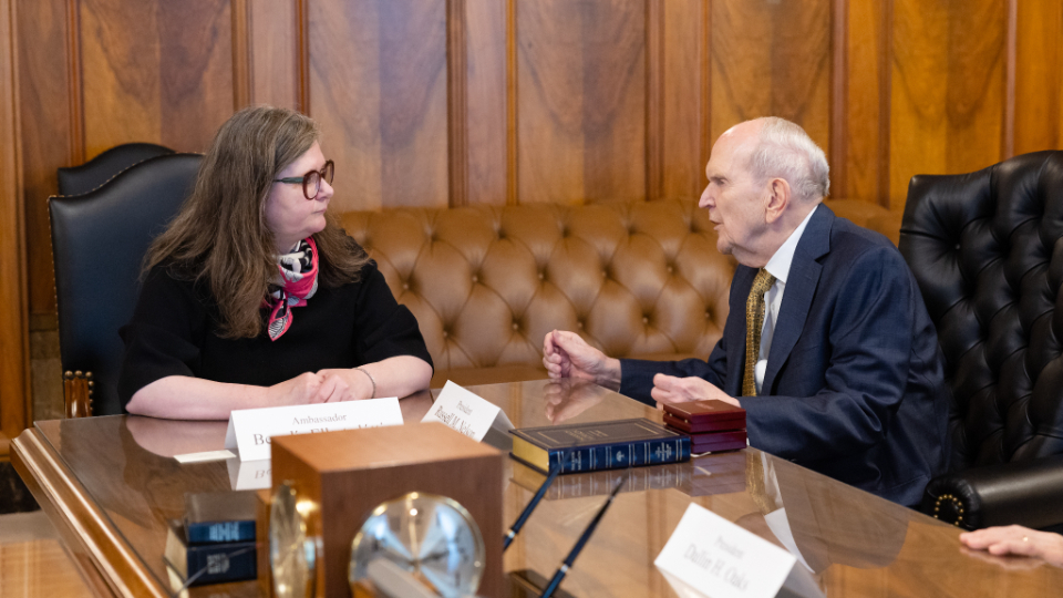On the afternoon of Thursday, January 18, 2024, Ellertsdóttir met with the First Presidency of the Church — President Russell M. Nelson, President Dallin H. Oaks and President Henry B. Eyring. Elder Quentin L. Cook of the Quorum of the Twelve Apostles and Elder Carl B. Cook of the Presidency of the Seventy also were in attendance.