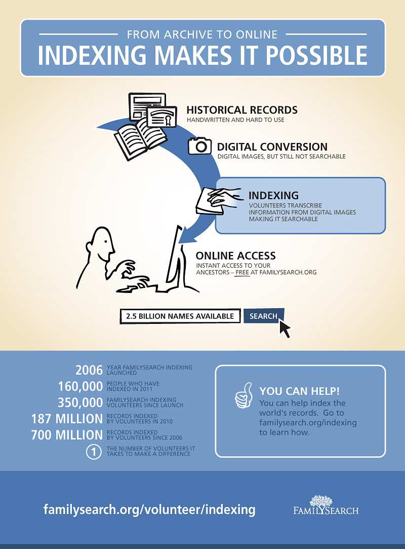 As records are indexed, they are made available to the public free of charge through the FamilySearch.org website, the renowned Family History Library in Salt Lake Cityand a network of more than 4,600 family history centers throughout the world. Some records are also published as browse able (but non-searchable) images. This year, FamilySearch will publish 380 million new digital images of genealogical importance on its website. These images are not truly useful to people, though, until they can be easily searched, and why the FamilySearch indexing program is so important.