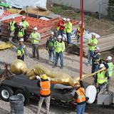 The addition will bring the height of the renovated temple to just under 190 feet. The statue is made of fiberglass coated with gold leaf, supported by a steel structure and weighs nearly 800 pounds.