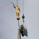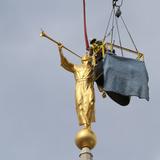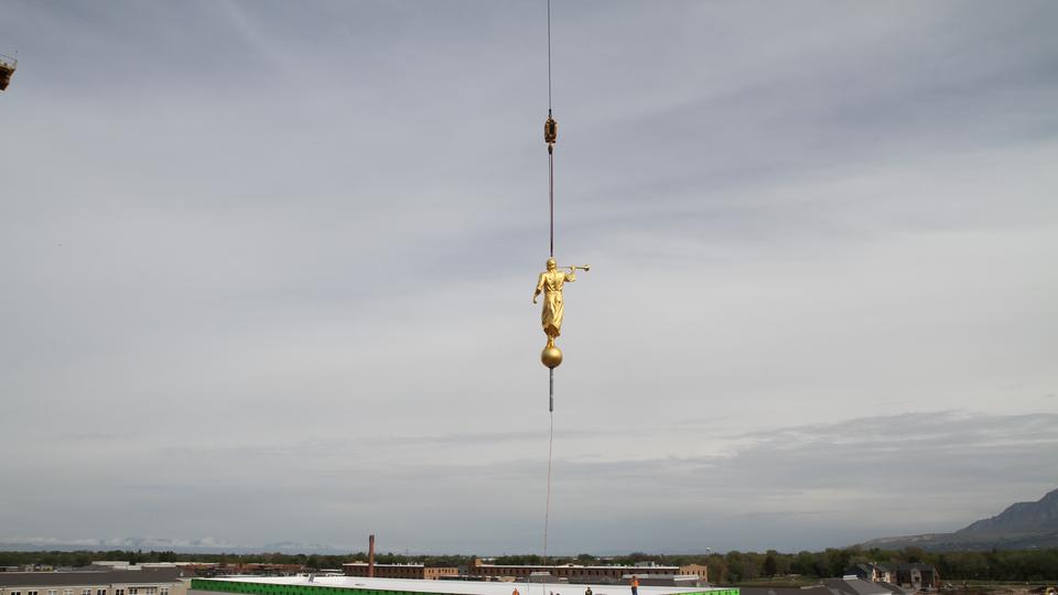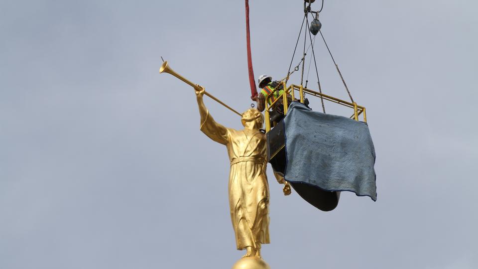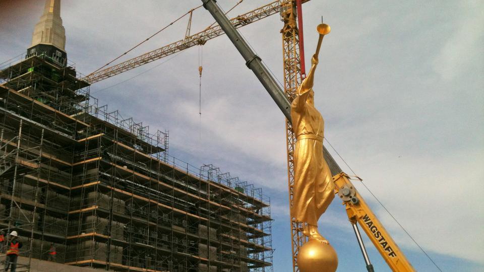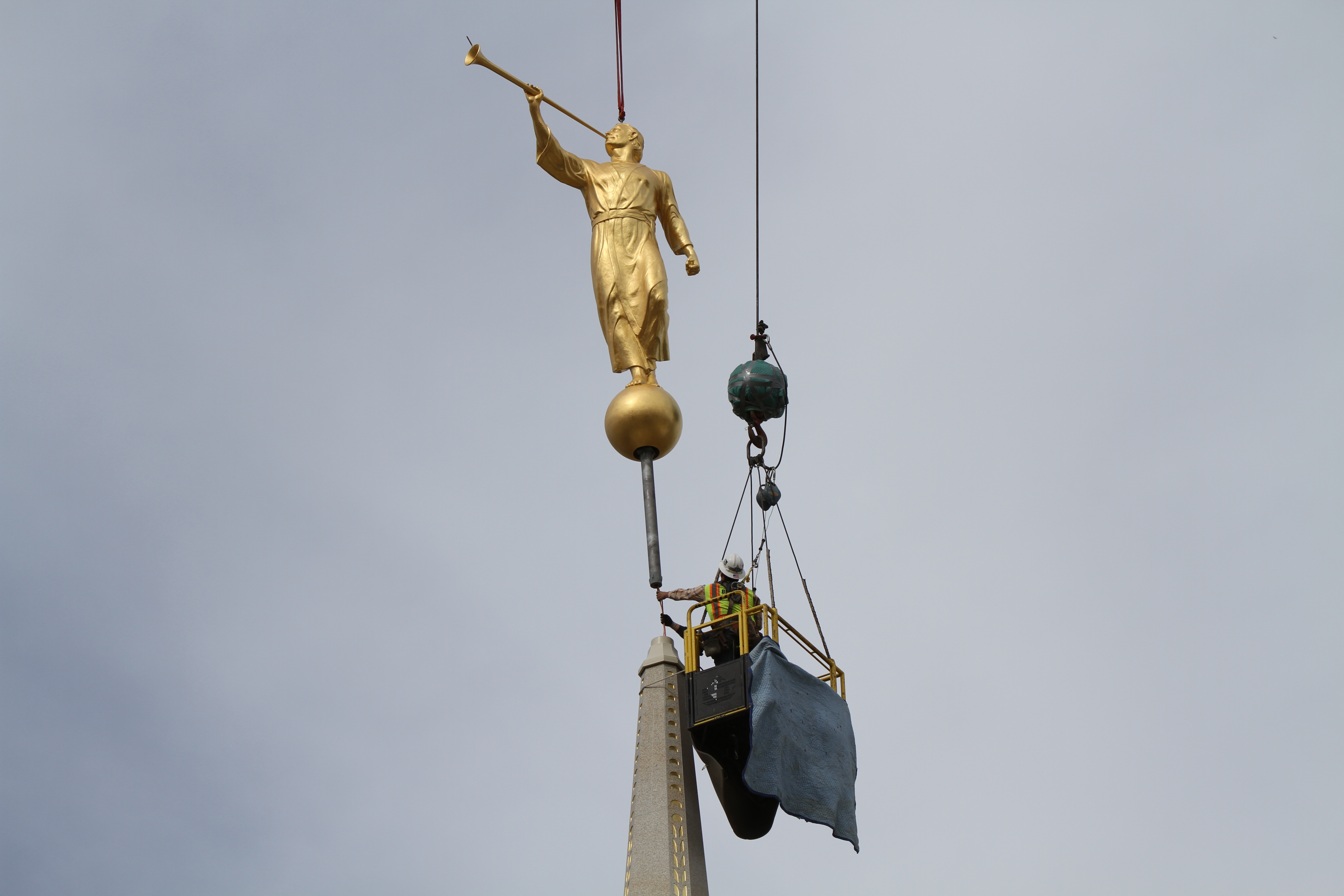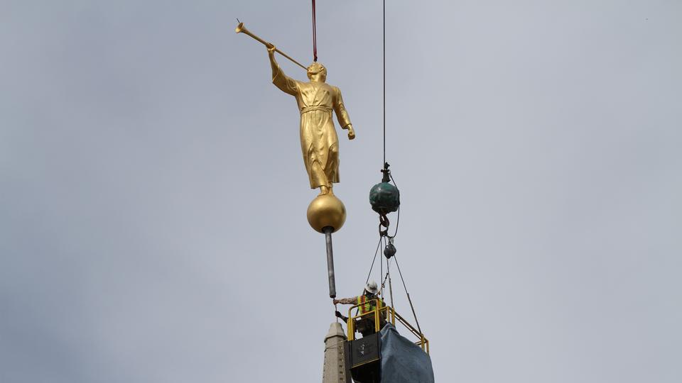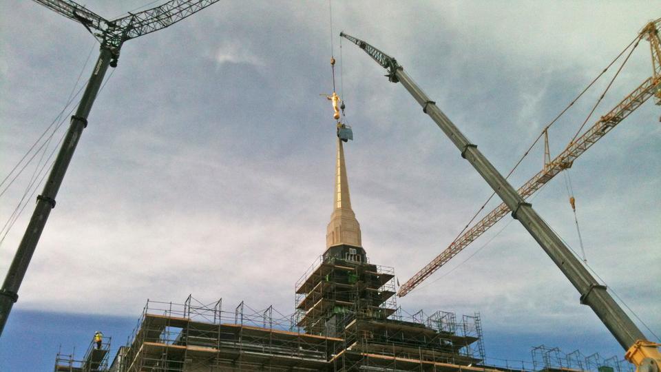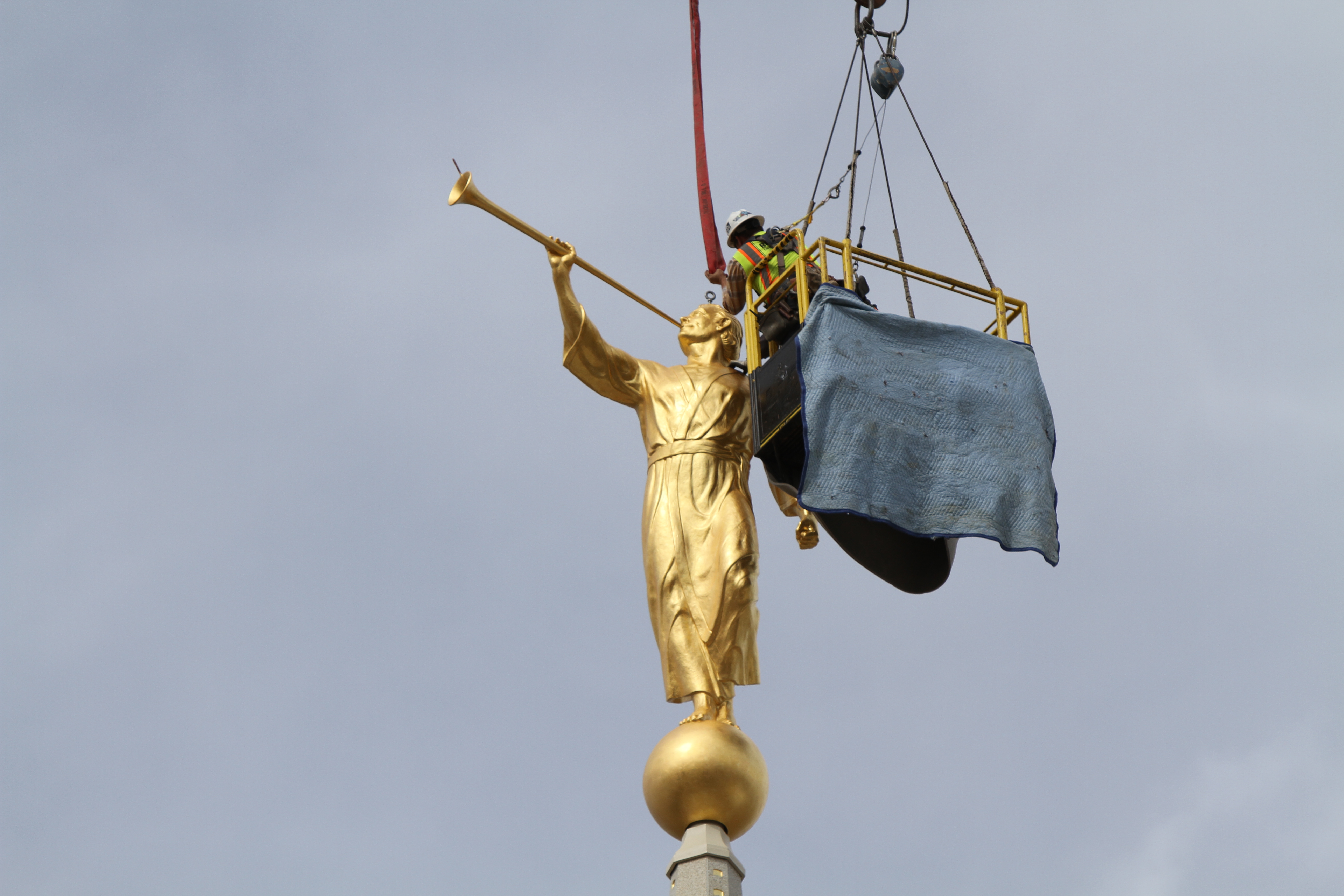 As renovation of the Ogden Utah Temple continues, construction crews placed an angel Moroni statue atop the new temple spire Tuesday morning. The 14-foot, 2-inch figure is the same statue that topped the temple before it was closed. The statue was removed at the beginning of the project and completely reconditioned.