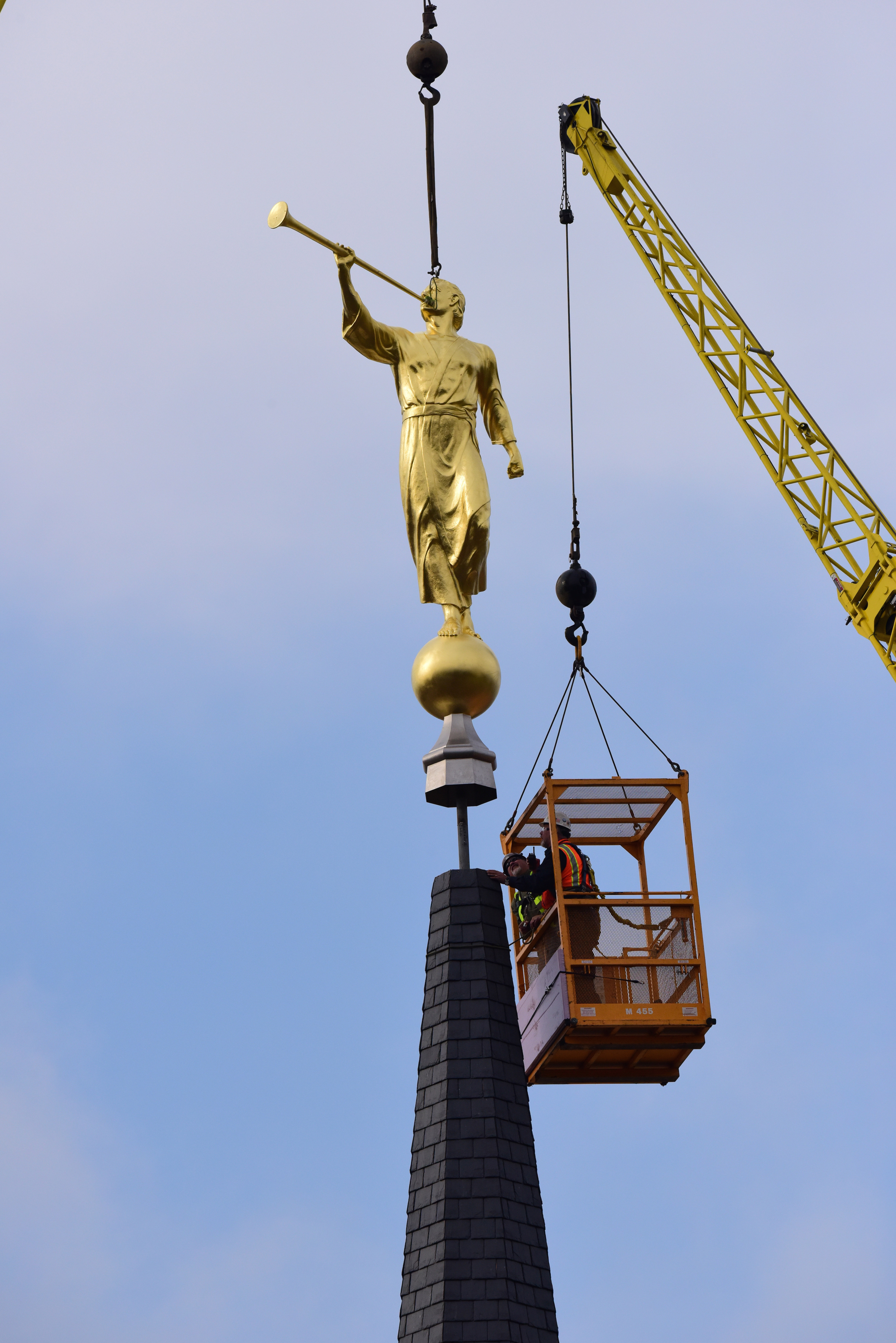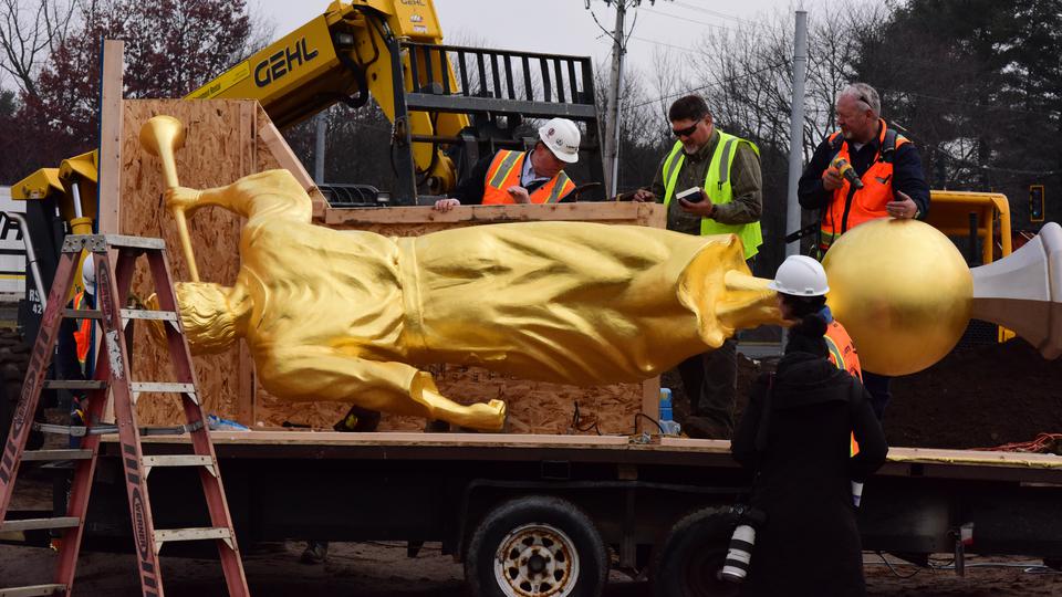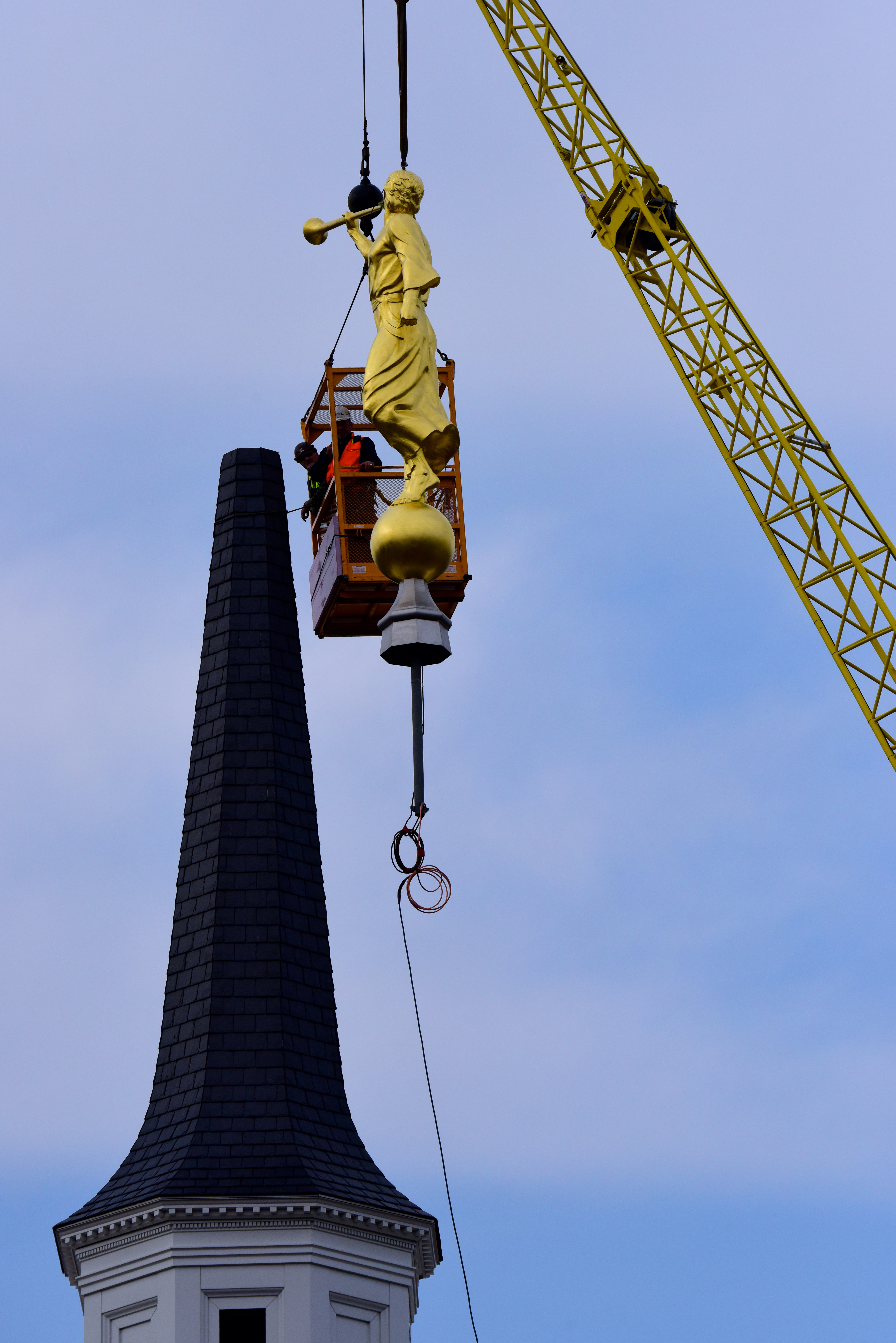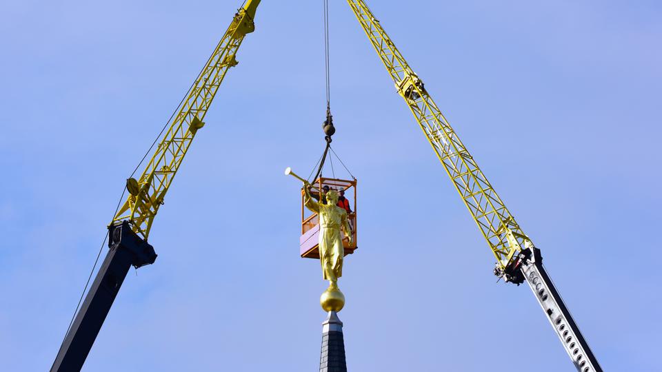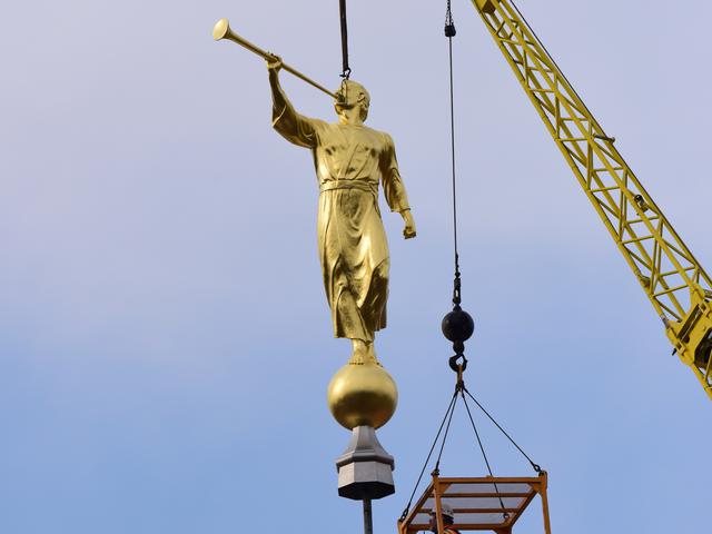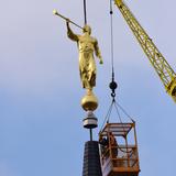 See a video of the angel Moroni statue placed on the spire of the temple.