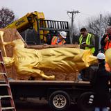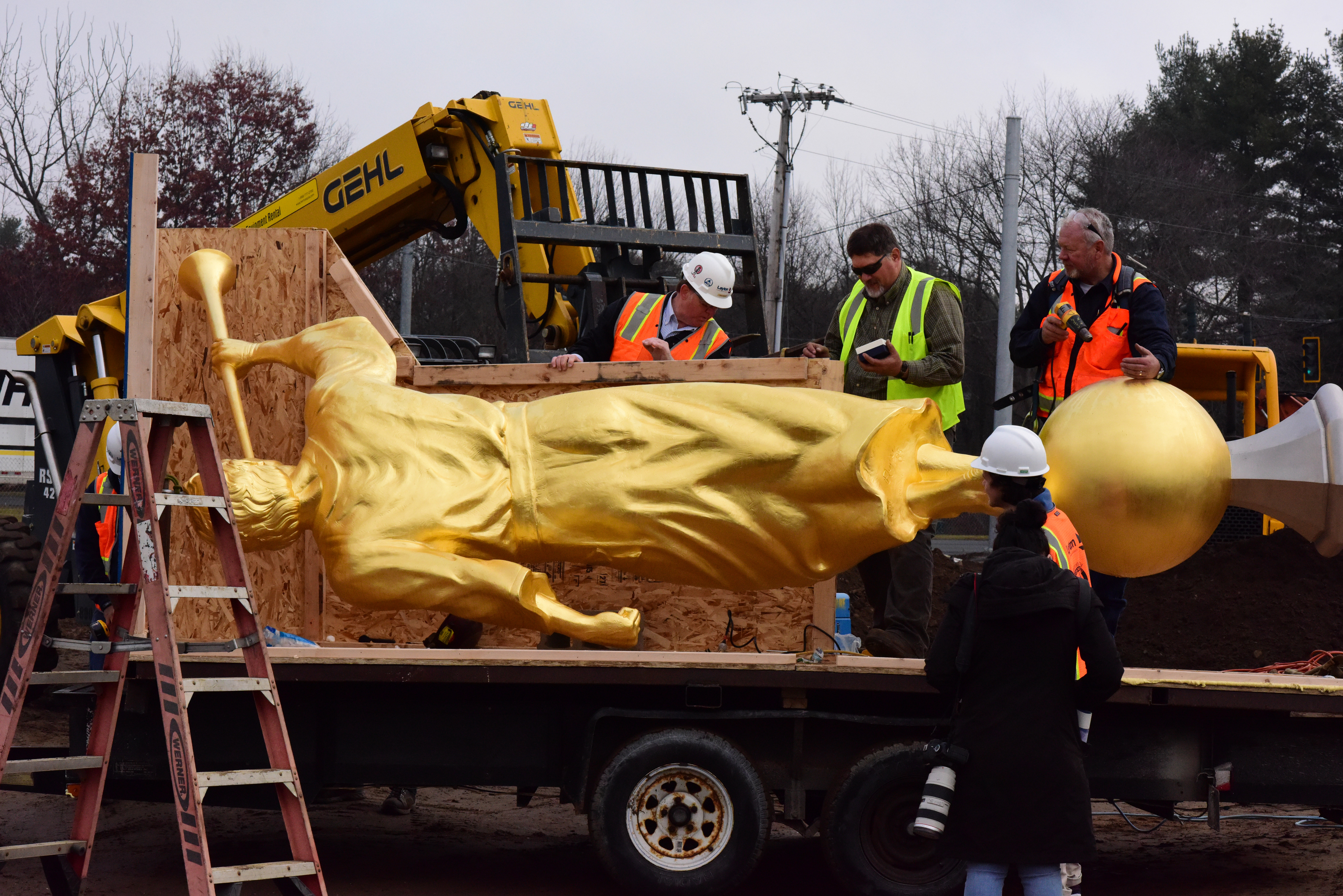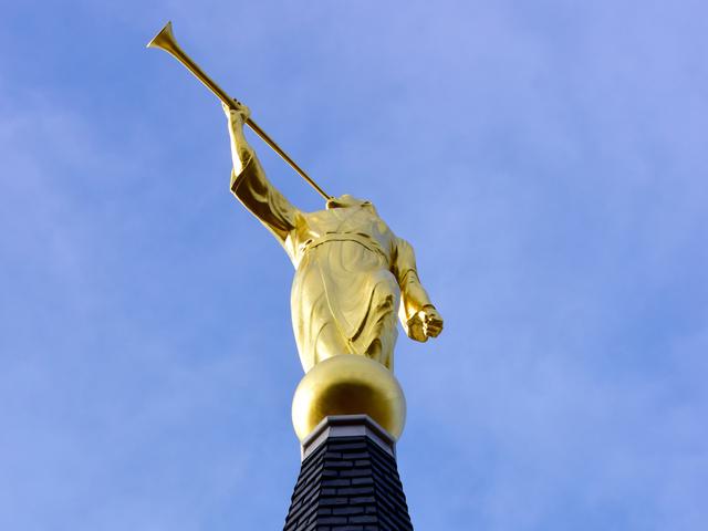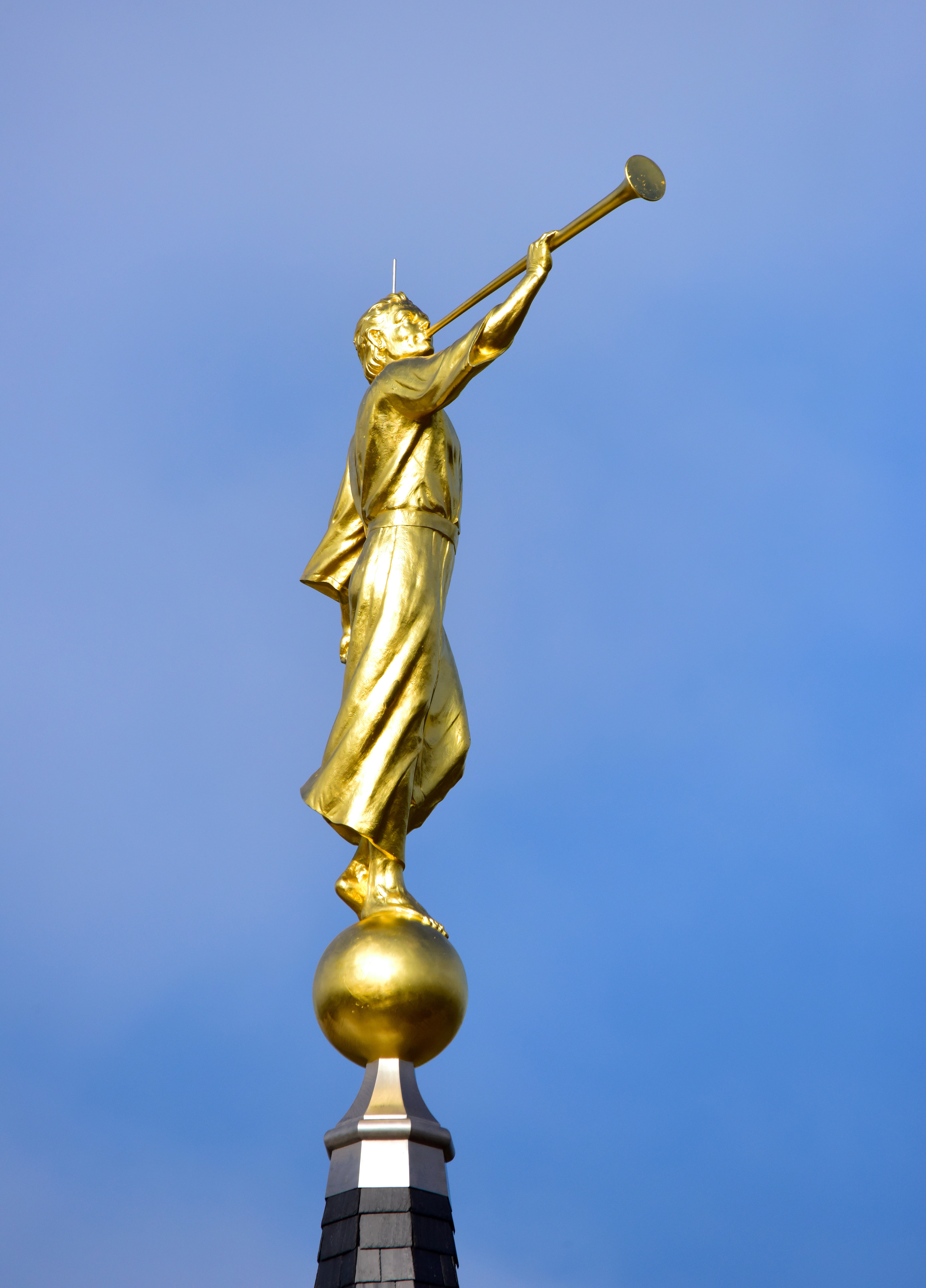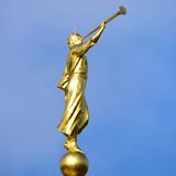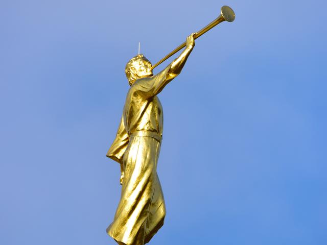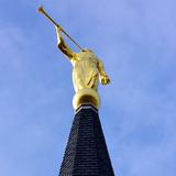 As the statue was being maneuvered out of its crate by a crane the gold leaf statue started swinging back and forth. Portia Corbett, president of the Farmington Historical Society and not a member of the Mormon faith, said, “Look at the way his trumpet is sounding to the world.”