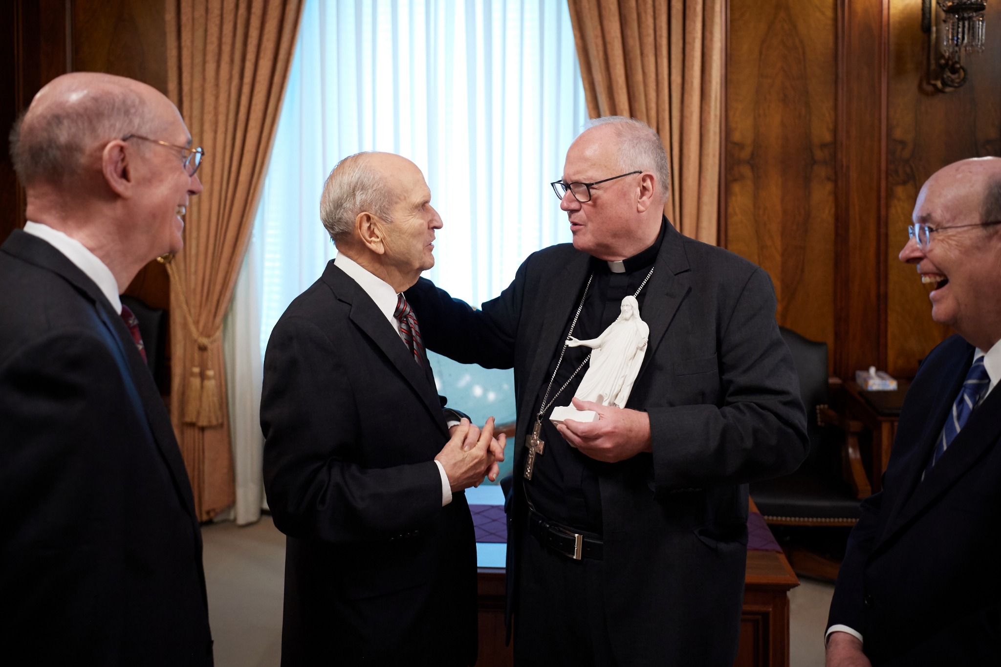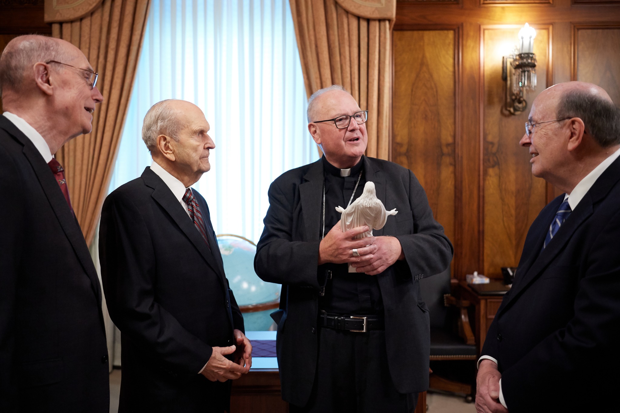 On Monday, His Eminence met Church President Russell M. Nelson for the first time at the Church Administration Building. During their meeting, President Nelson presented Cardinal Dolan with a statue of the Christus. The archbishop also met Acting President of the Quorum of the Twelve Apostles, M. Russell Ballard and President Henry B. Eyring, second counselor in the First Presidency.