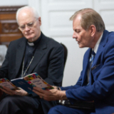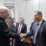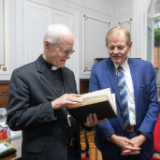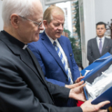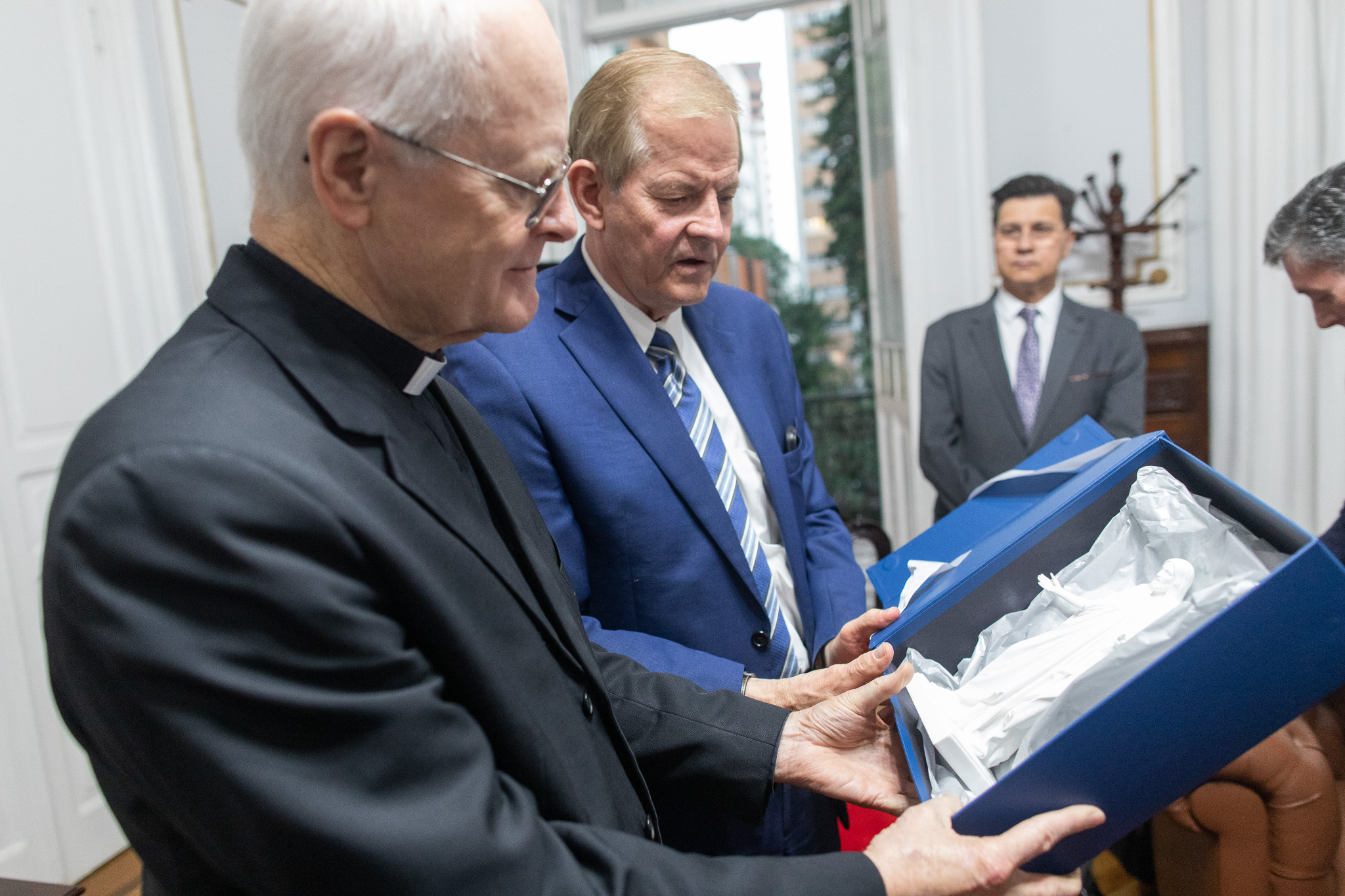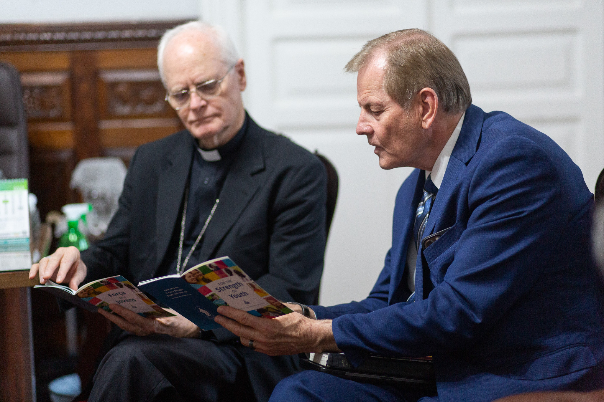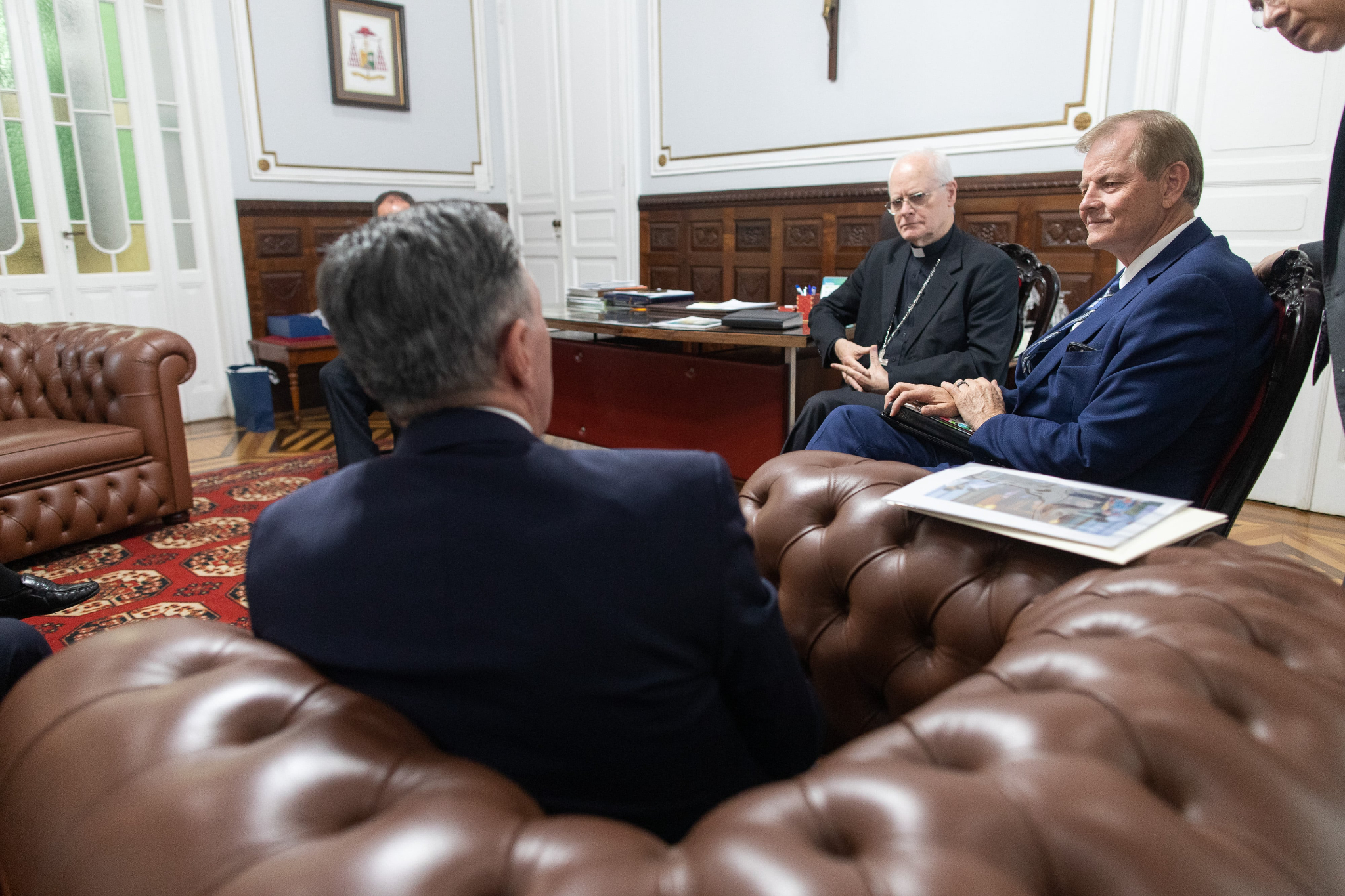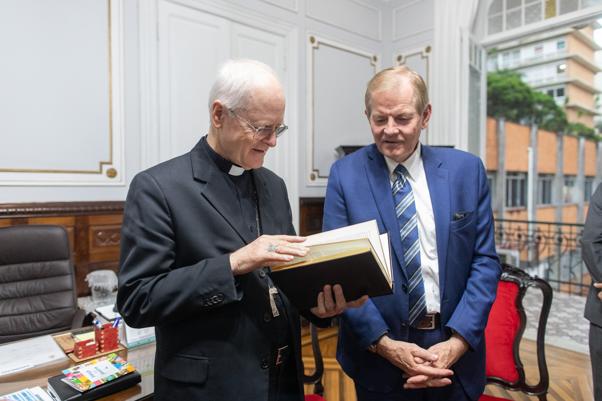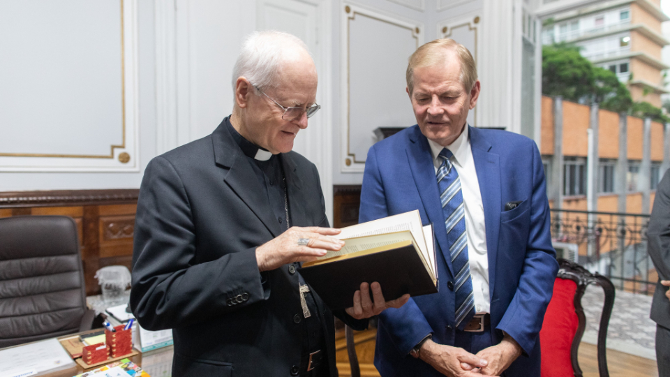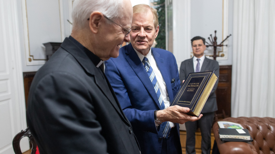 Cardinal Scherer and Elder Stevenson discussed serving the poor and needy. The Catholic Church and the Church of Jesus Christ have a significant humanitarian presence in São Paulo and throughout Brazil, along with opportunities for joint action. Elder Stevenson presented Cardinal Scherer with an engraved copy of the Book of Mormon and a small Christus statue.