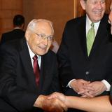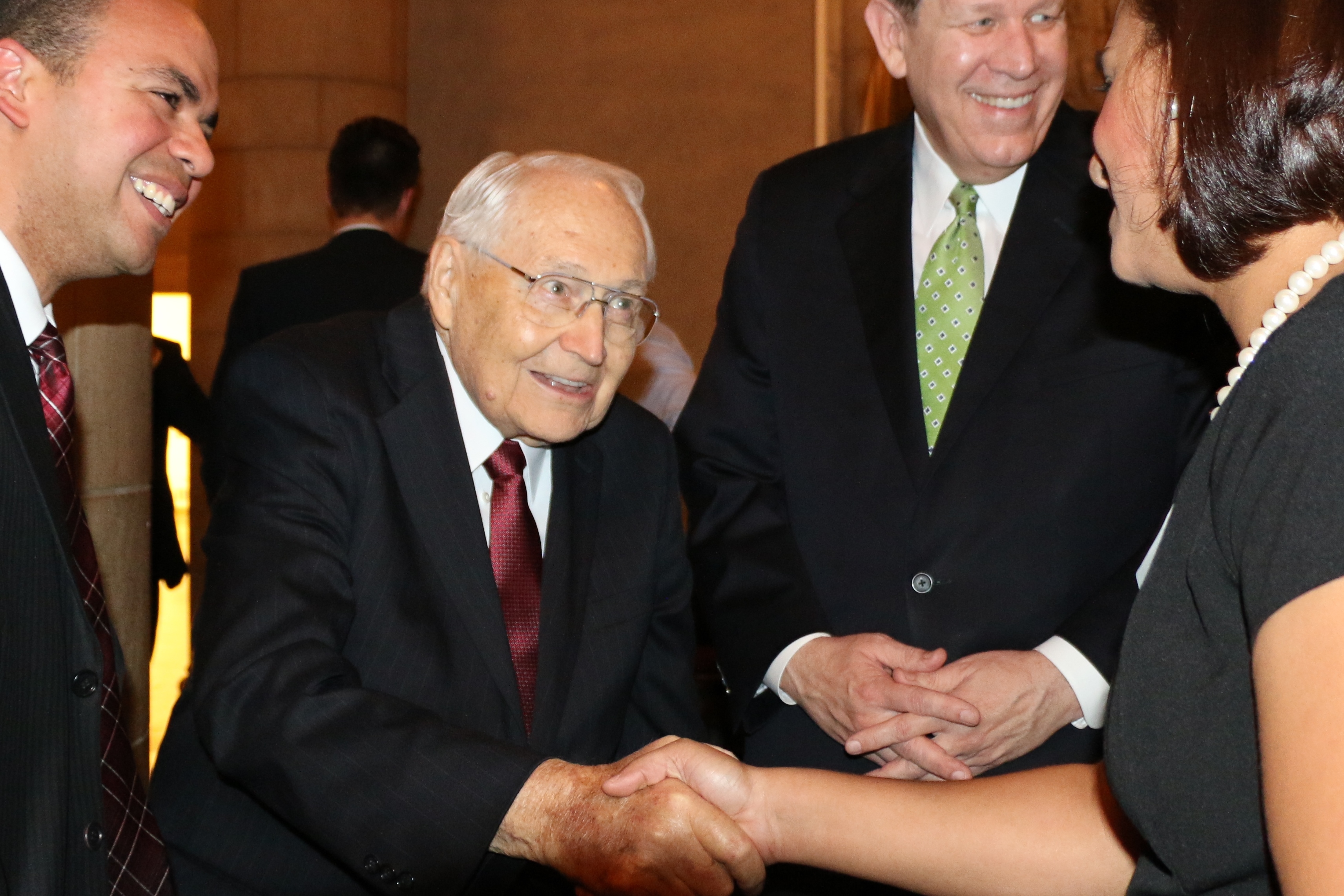 - Elder L. Tom Perry and Elder Donald L. Hallstrom visit with members of the New York LDS Professional Association, 14 October 2014