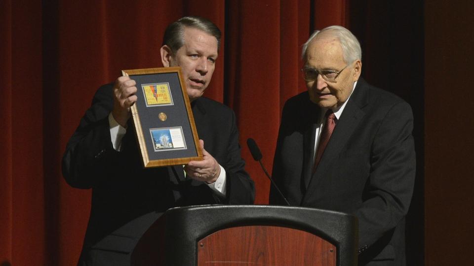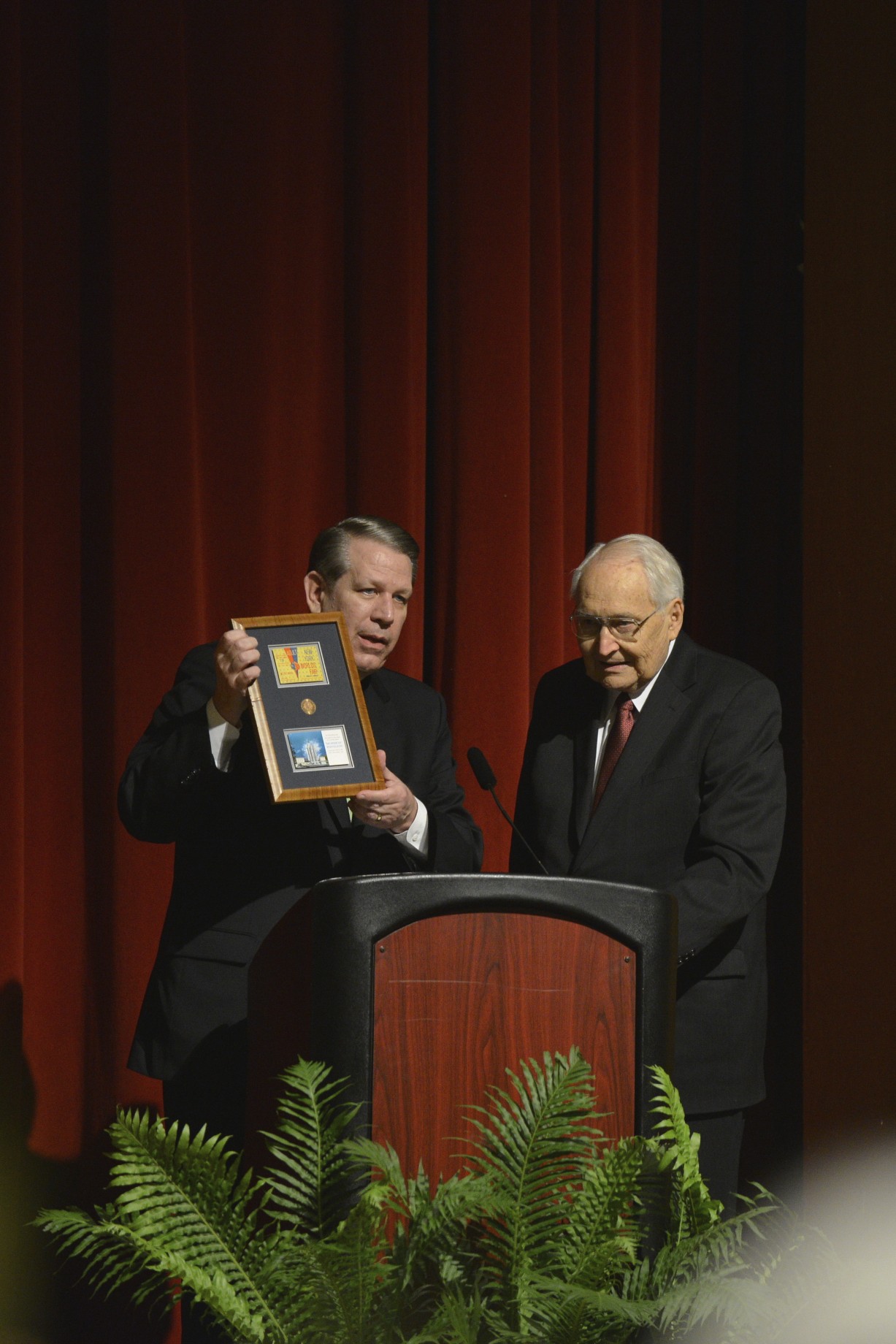 - Elder L. Tom Perry receives a memento at the 50 year anniversary of the 1964 New York World’s Fair, 14 October 2014
