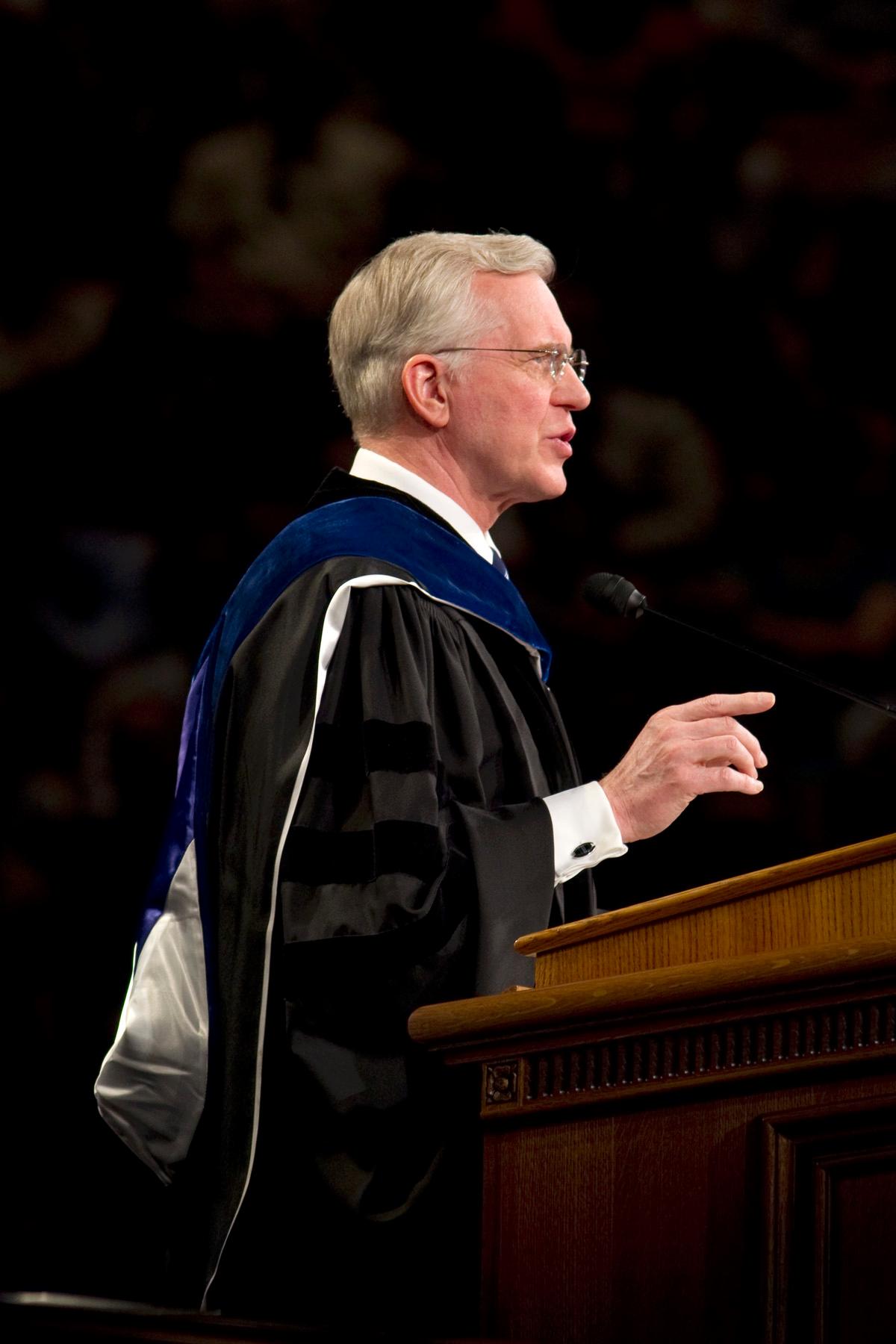 Elder D. Todd Christofferson, a member of the Quorum of the Twelve Apostles of The Church of Jesus Christ of Latter-day Saints, spoke to graduates on 22 April inside the Marriott Center on the campus of Brigham Young University.