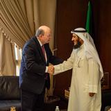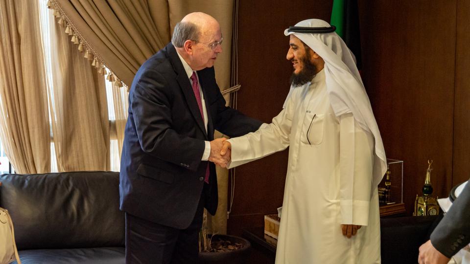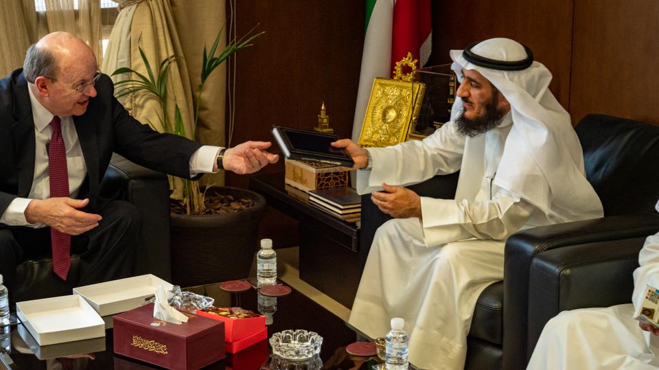 Elder Cook gave Mr. Fareed a leather-bound Book of Mormon in Arabic and a small pewter pioneer handcart statue. Bishop Terry Harradine, leader of the Church’s Kuwait congregation, gave the government leader a hardbound copy of volume one of “Saints,” signed by each member of the congregation.