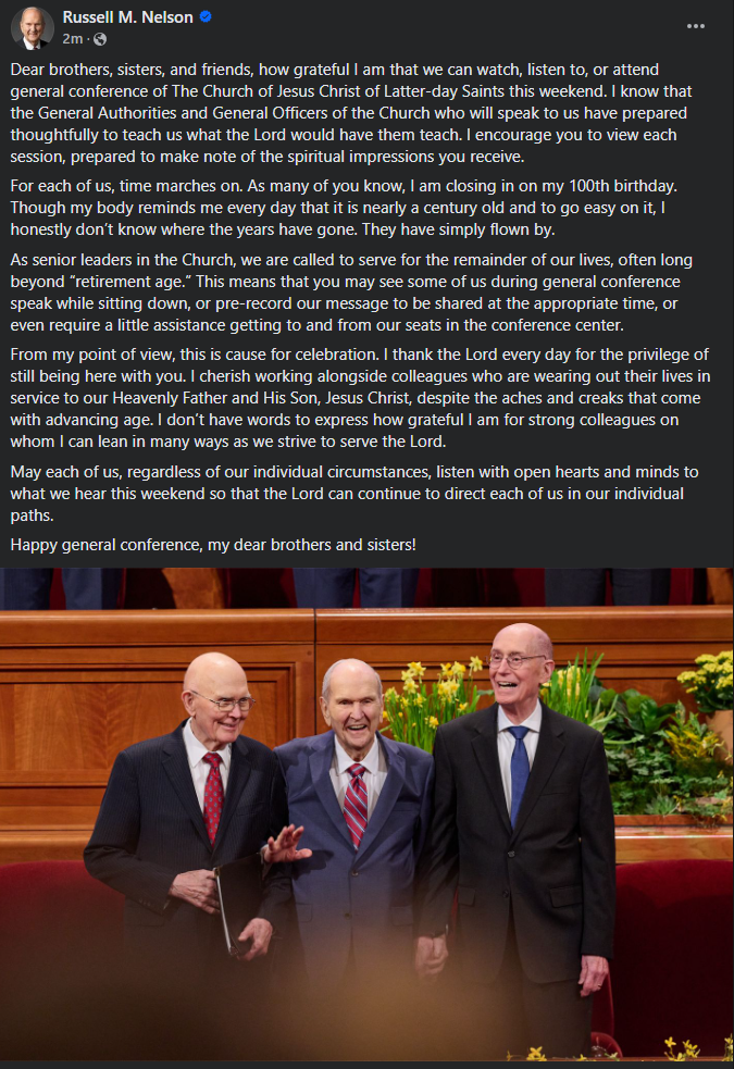 President Russell M. Nelson of The Church of Jesus Christ of Latter-day Saints shared the following message on his social channels today, April 4, 2024.