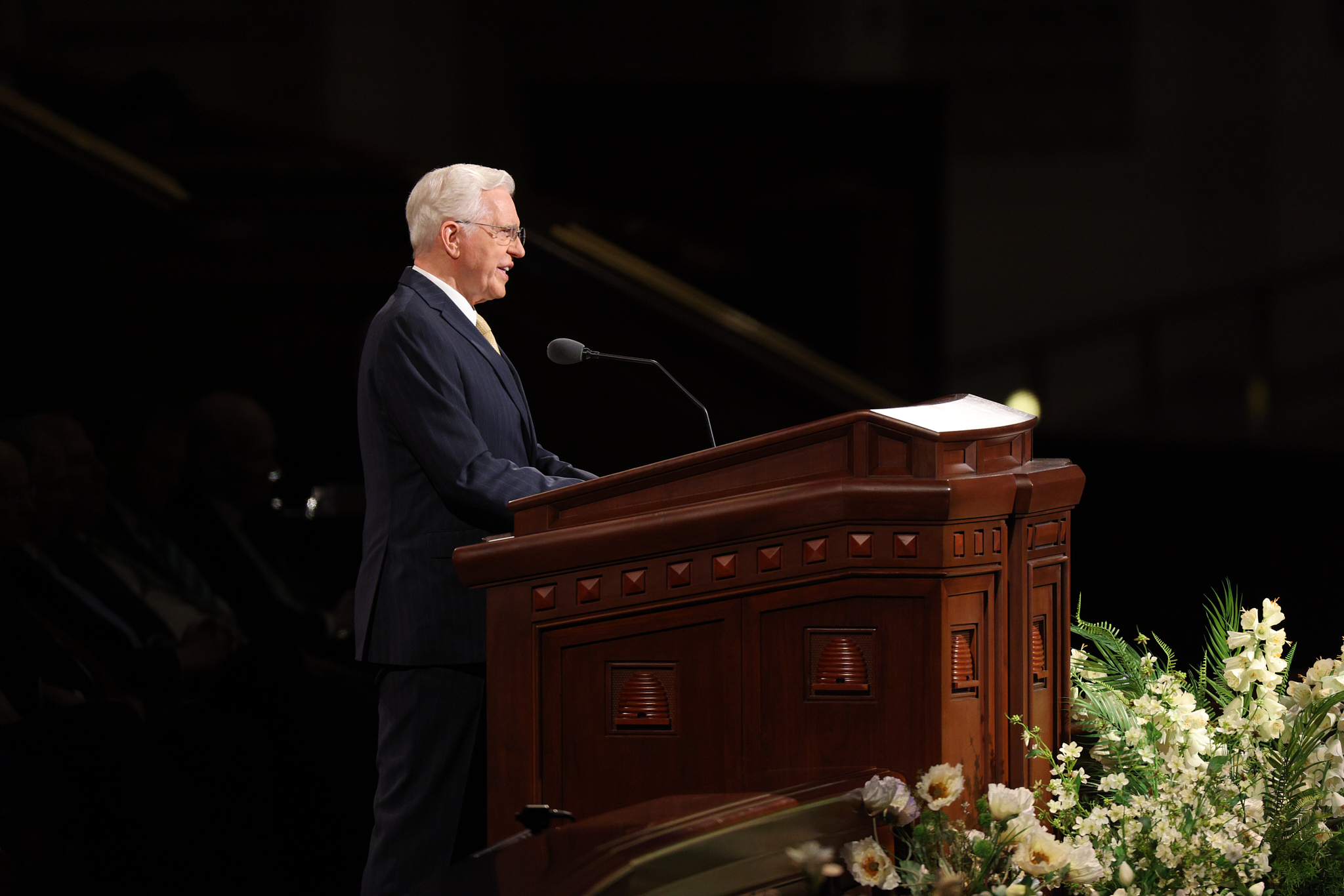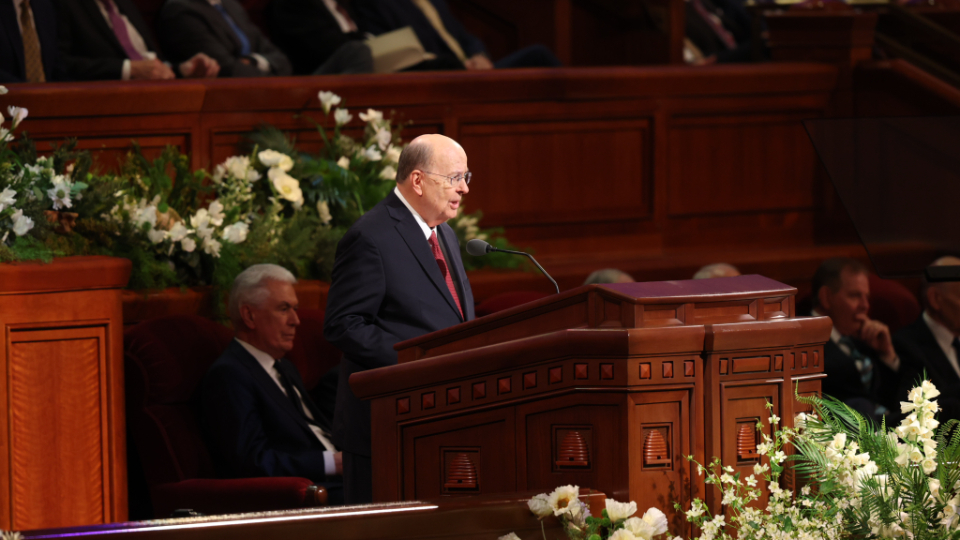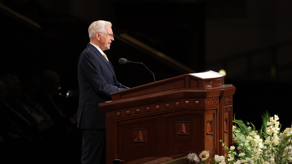 President Dallin H. Oaks of the First Presidency delivers the final message in the Sunday afternoon session of general conference at the Conference Center in Salt Lake City, Utah, on April 5, 2026. 2026 by Intellectual Reserve, Inc. All rights reserved.“He knows us and loves each of us perfectly, and invites us to walk with Him, abide in Him, and follow His example of ministering to others one by one in charity and love,” he continued. “May we all demonstrate the pure love of Christ in our families, in our communities, and in all of our interchanges with God’s children.”