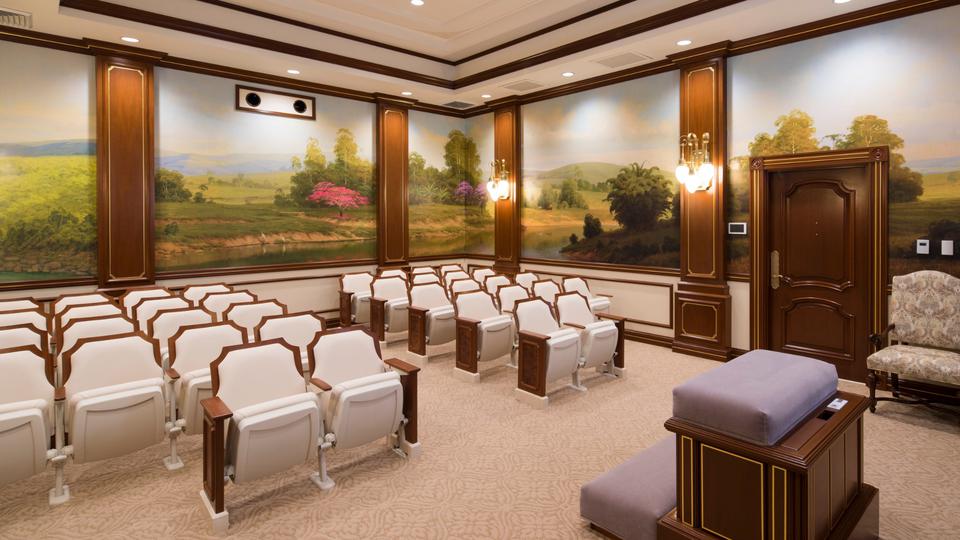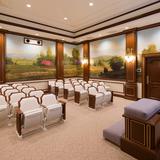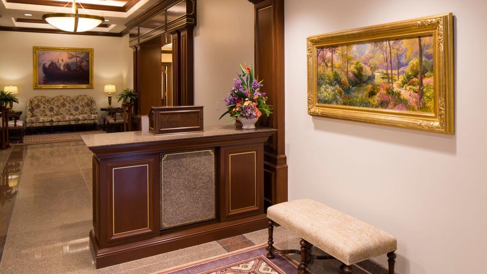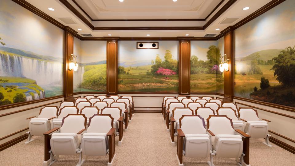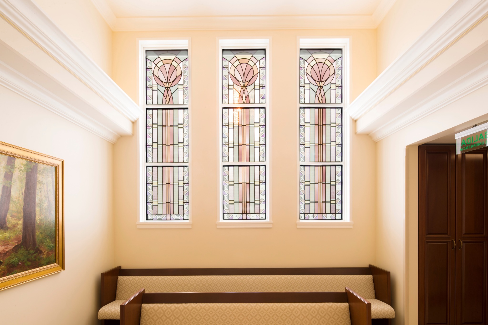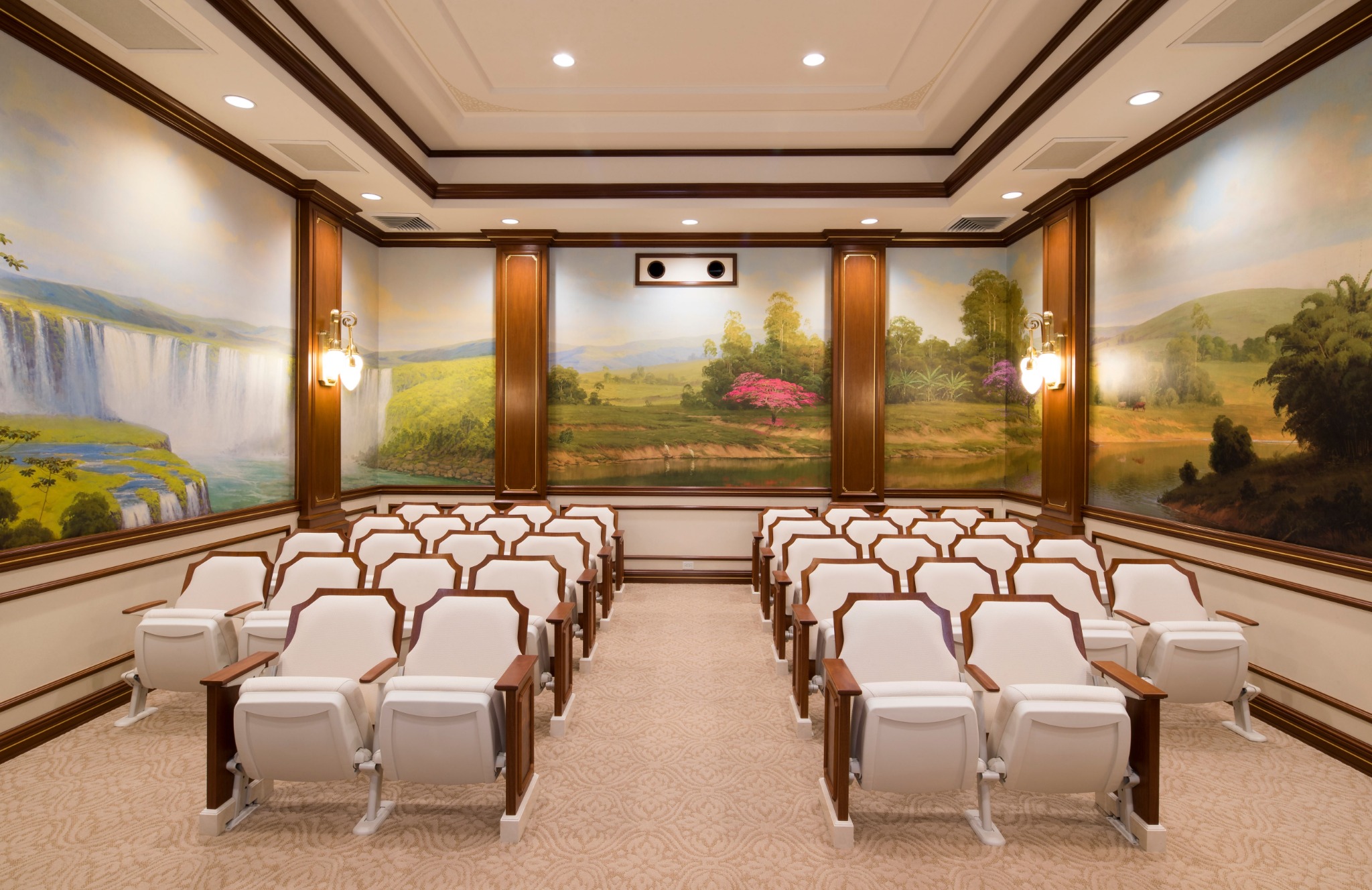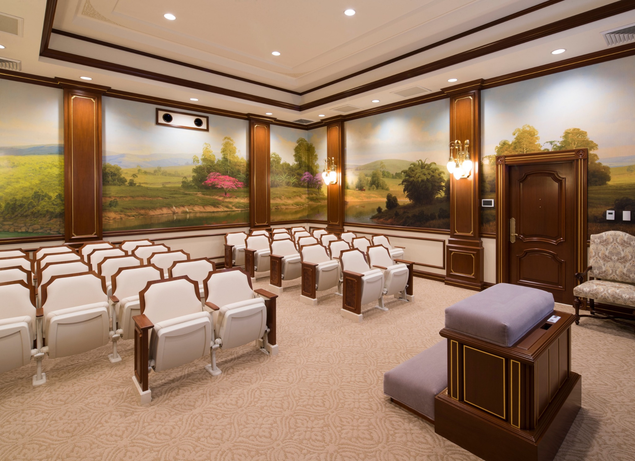 A stylized version of the Lapacho tree flower, which is the Paraguay National Tree and flower, was used as inspiration throughout the building from the lighting, to decorative paint and color scheme. The Lapacho flower is most commonly found in a lavender color, which was used in the temple’s fabrics, art glass and even stone. The Spanish Colonial furniture style was inspired by the early architecture and furniture of Paraguay, prior to their destruction during the Paraguayan War.