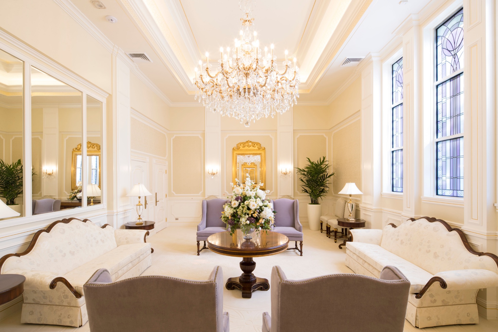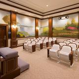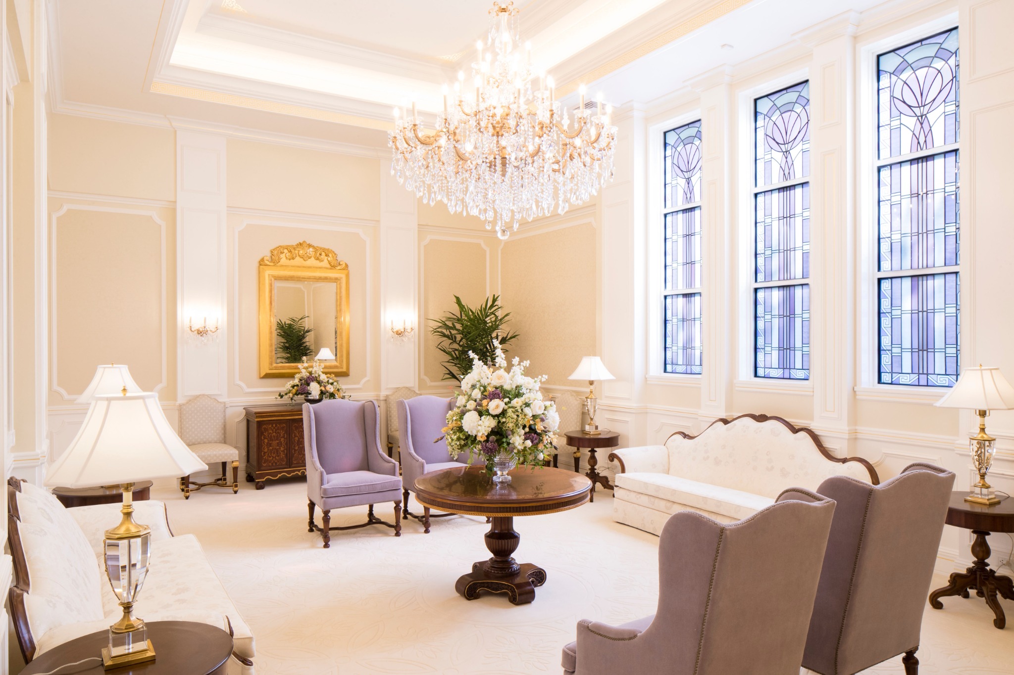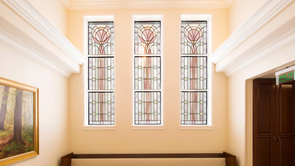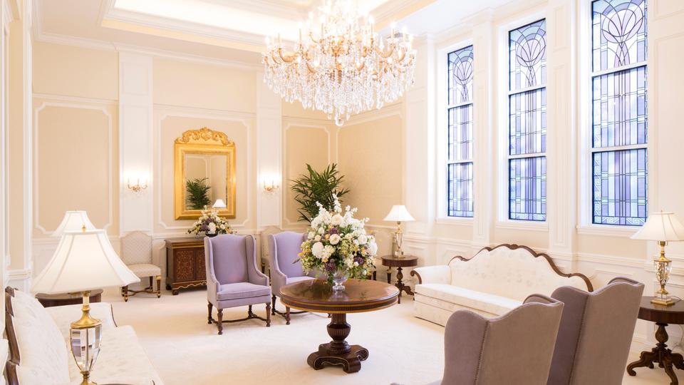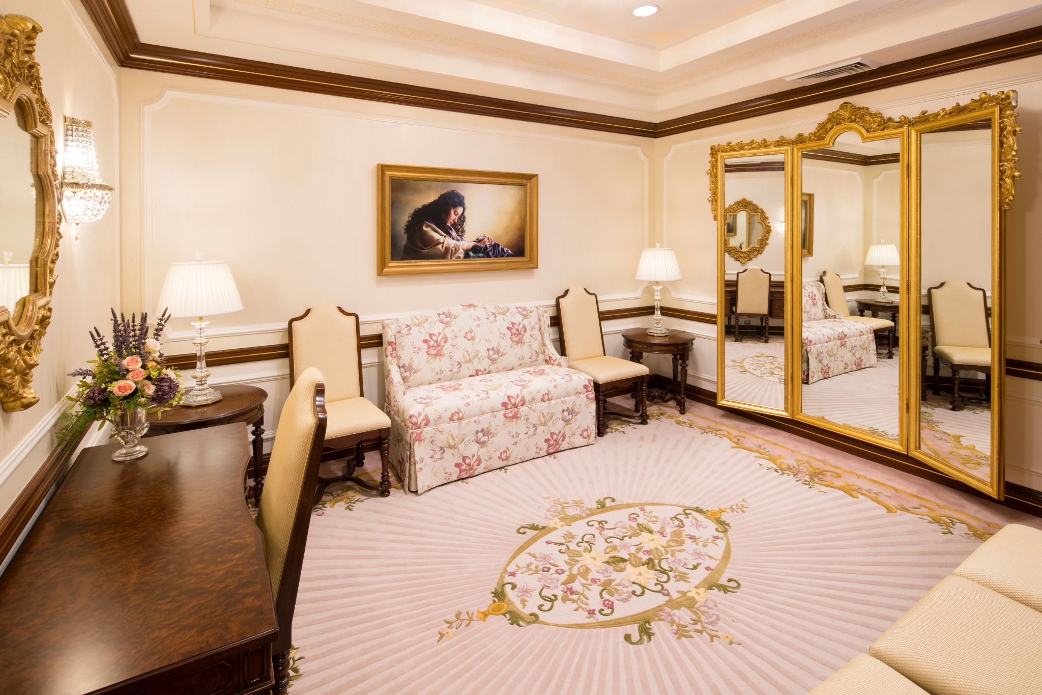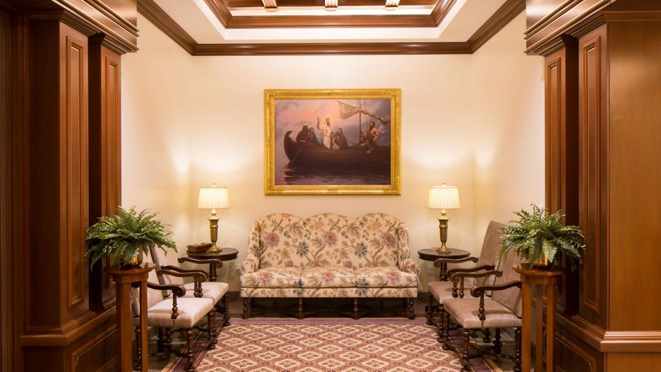 A stylized version of the Lapacho tree flower, which is the Paraguay National Tree and flower, was used as inspiration throughout the building from the lighting, to decorative paint and color scheme. The Lapacho flower is most commonly found in a lavender color, which was used in the temple’s fabrics, art glass and even stone. The Spanish Colonial furniture style was inspired by the early architecture and furniture of Paraguay, prior to their destruction during the Paraguayan War.