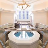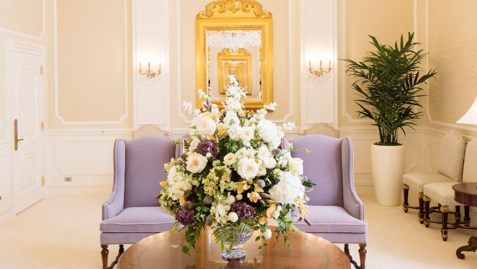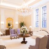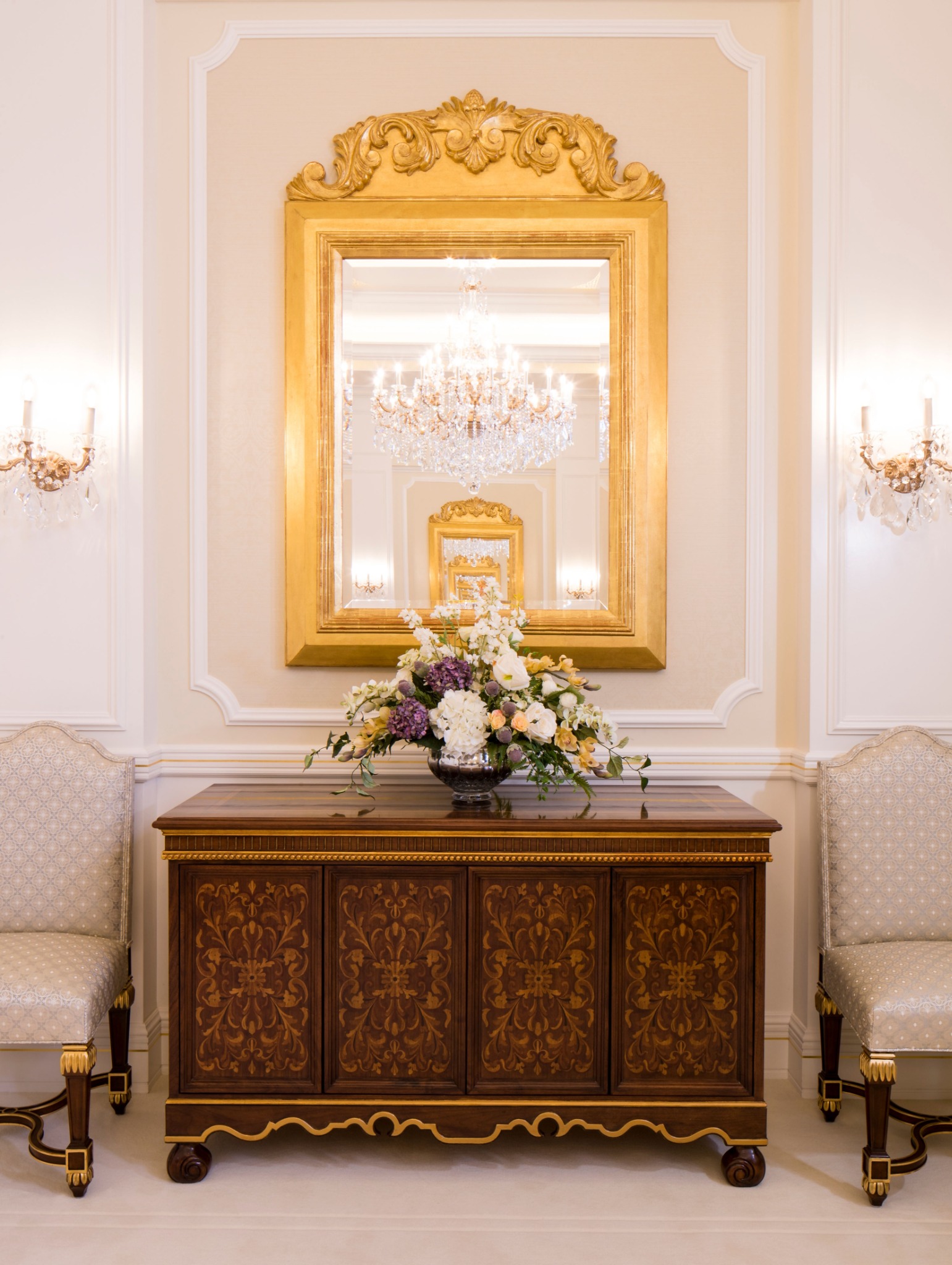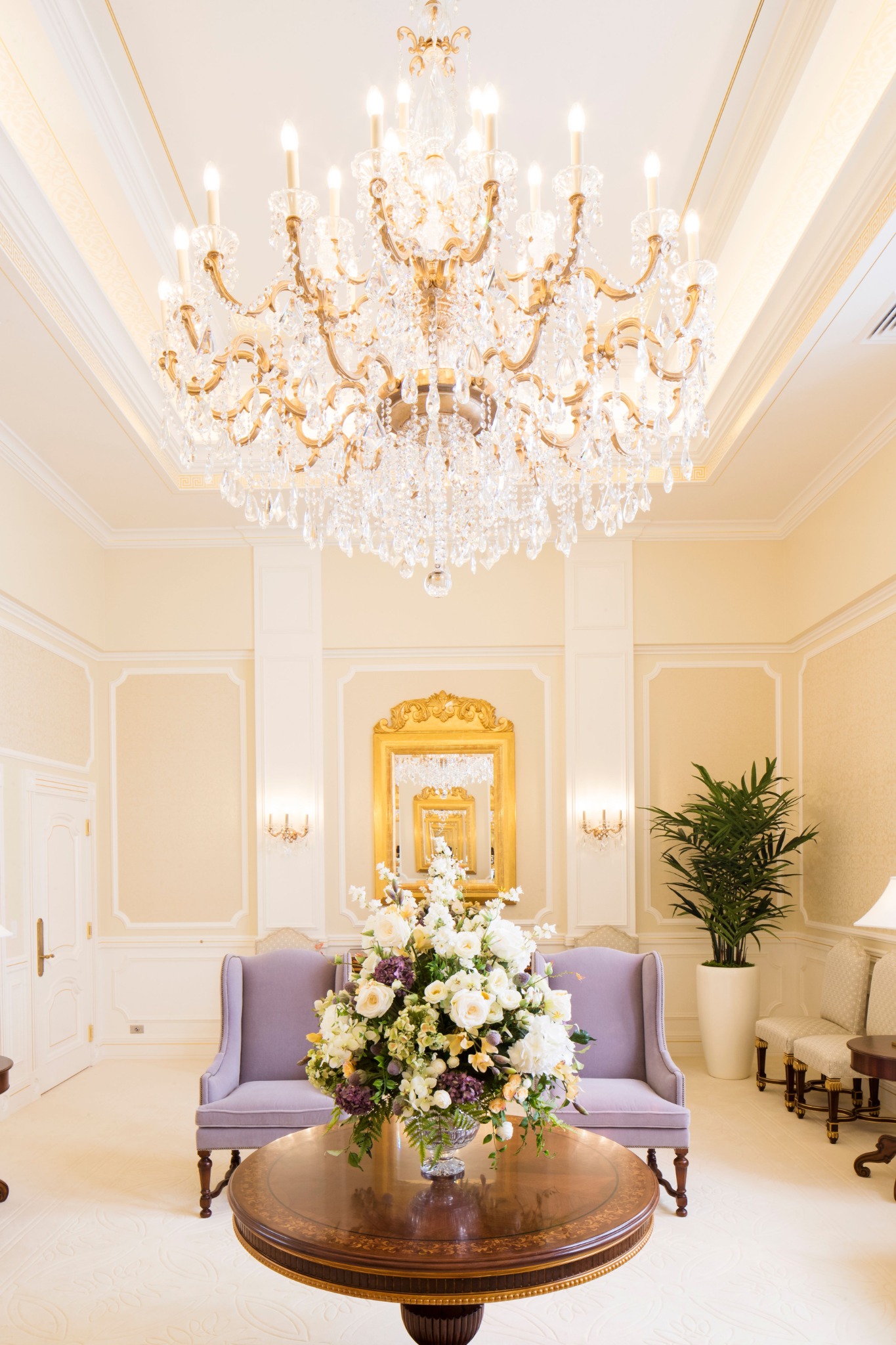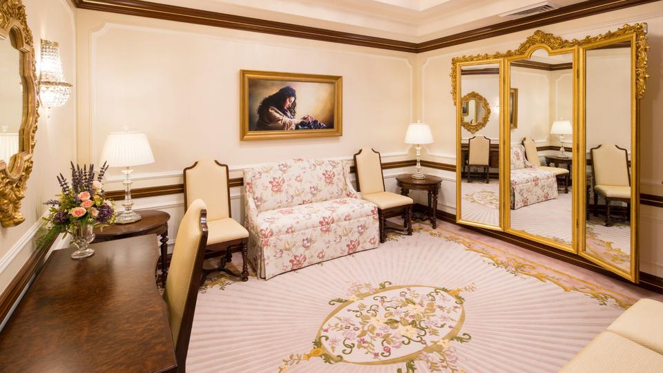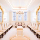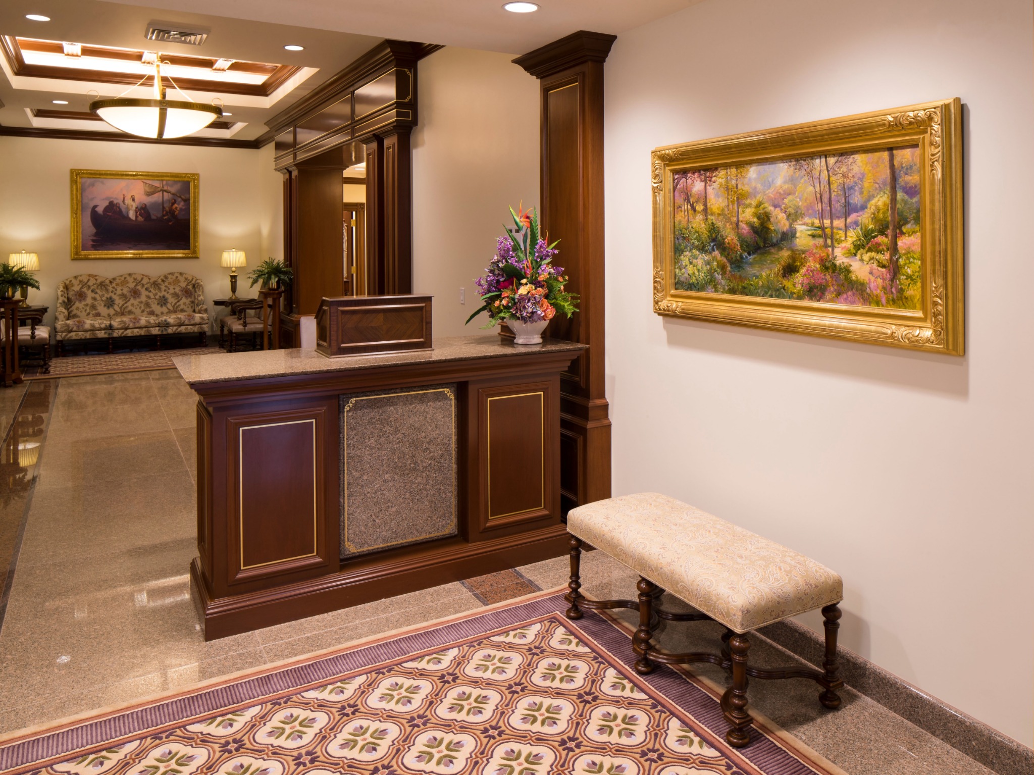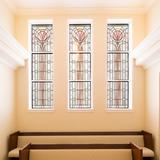 A stylized version of the Lapacho tree flower, which is the Paraguay National Tree and flower, was used as inspiration throughout the building from the lighting, to decorative paint and color scheme. The Lapacho flower is most commonly found in a lavender color, which was used in the temple’s fabrics, art glass and even stone. The Spanish Colonial furniture style was inspired by the early architecture and furniture of Paraguay, prior to their destruction during the Paraguayan War.