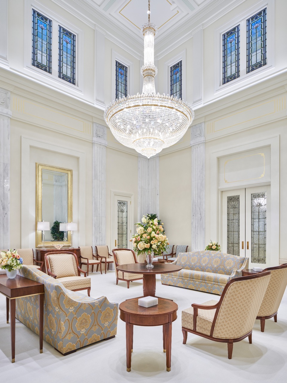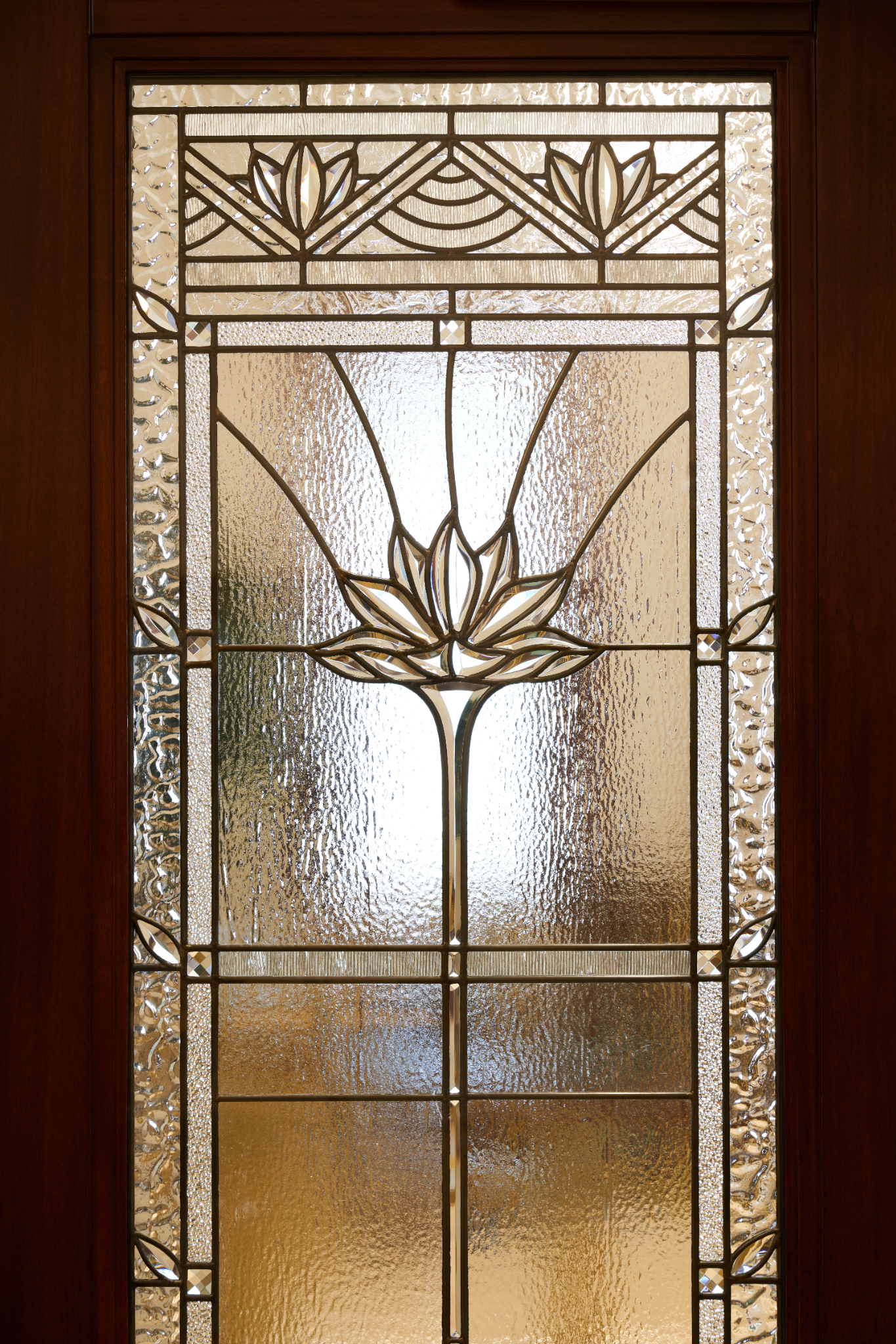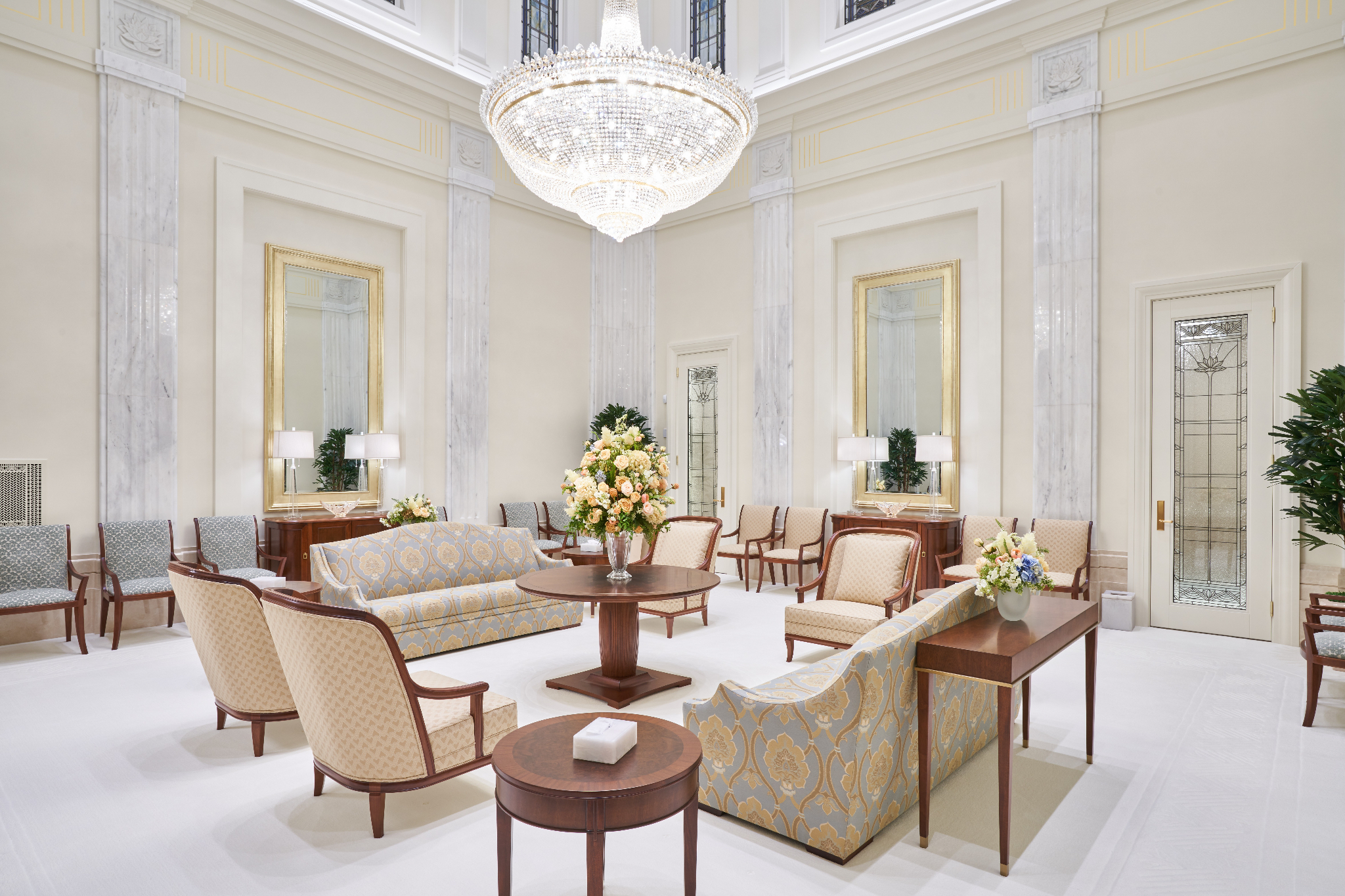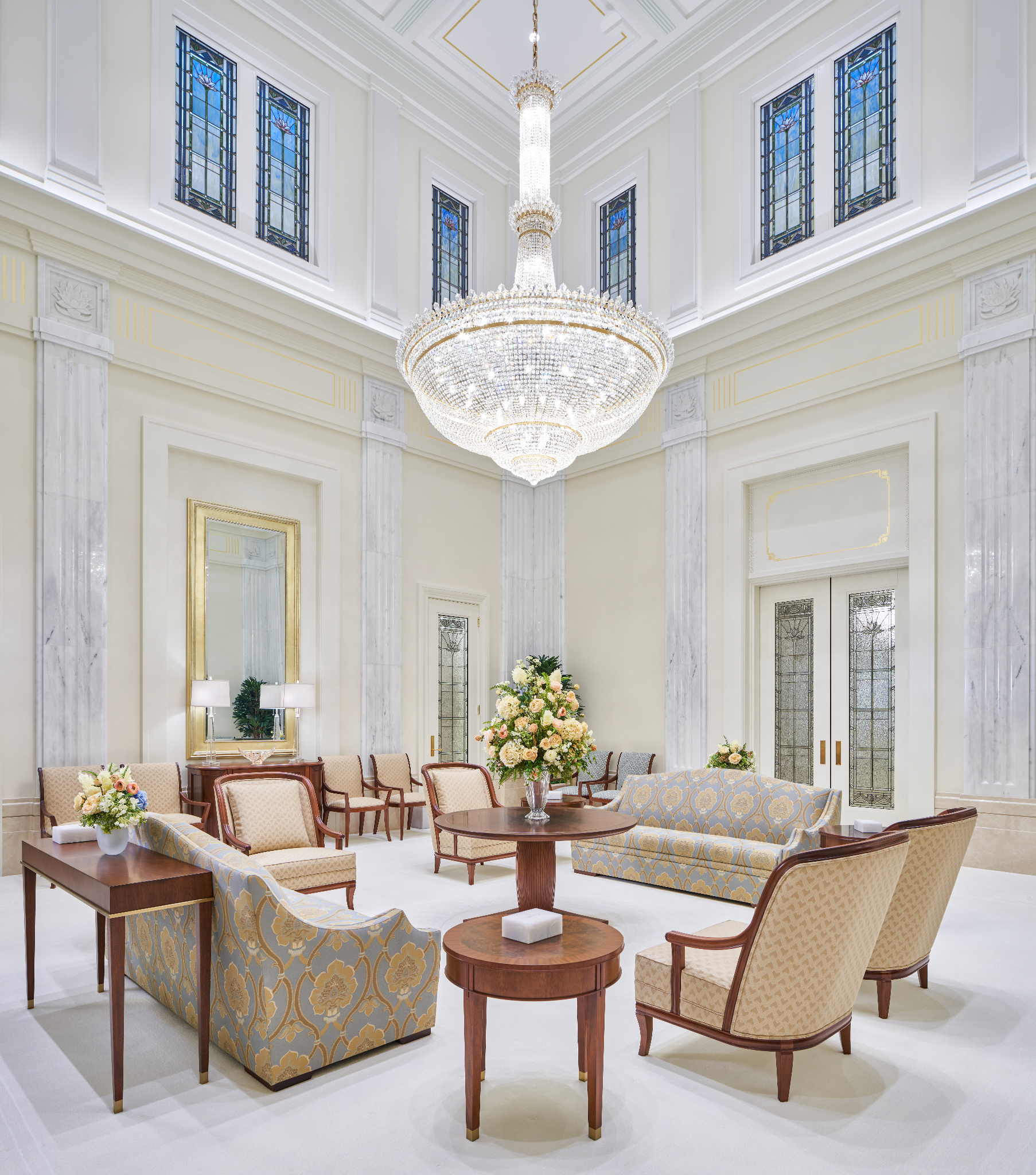 A local craftsman shaped carpet carvings in the celestial and sealing rooms, and the entry rugs’ colors and patterns follow the design of the art glass.