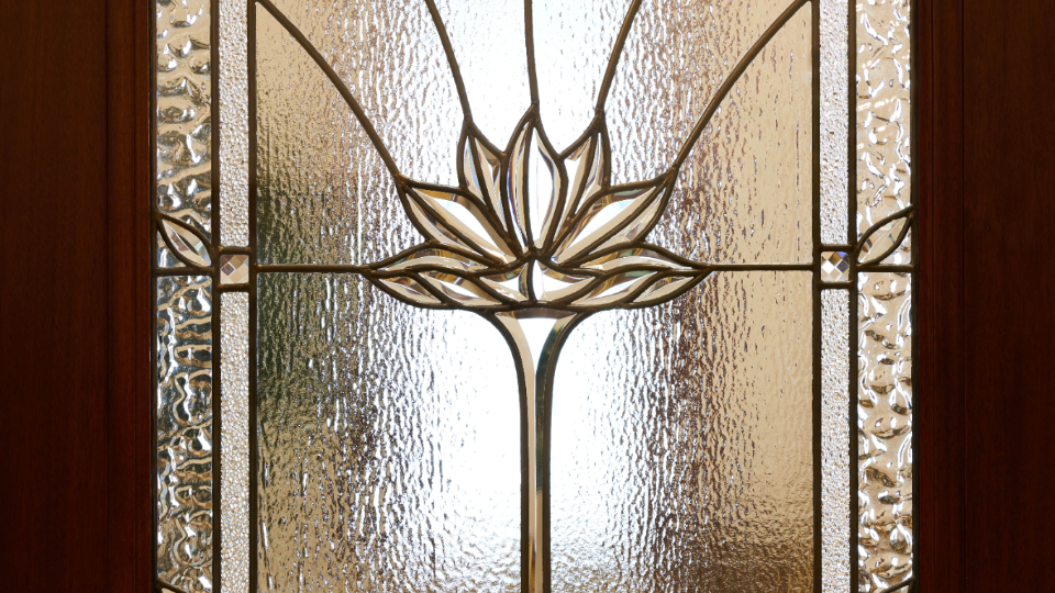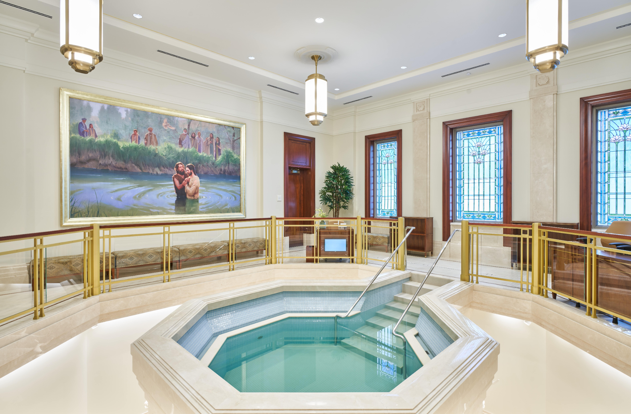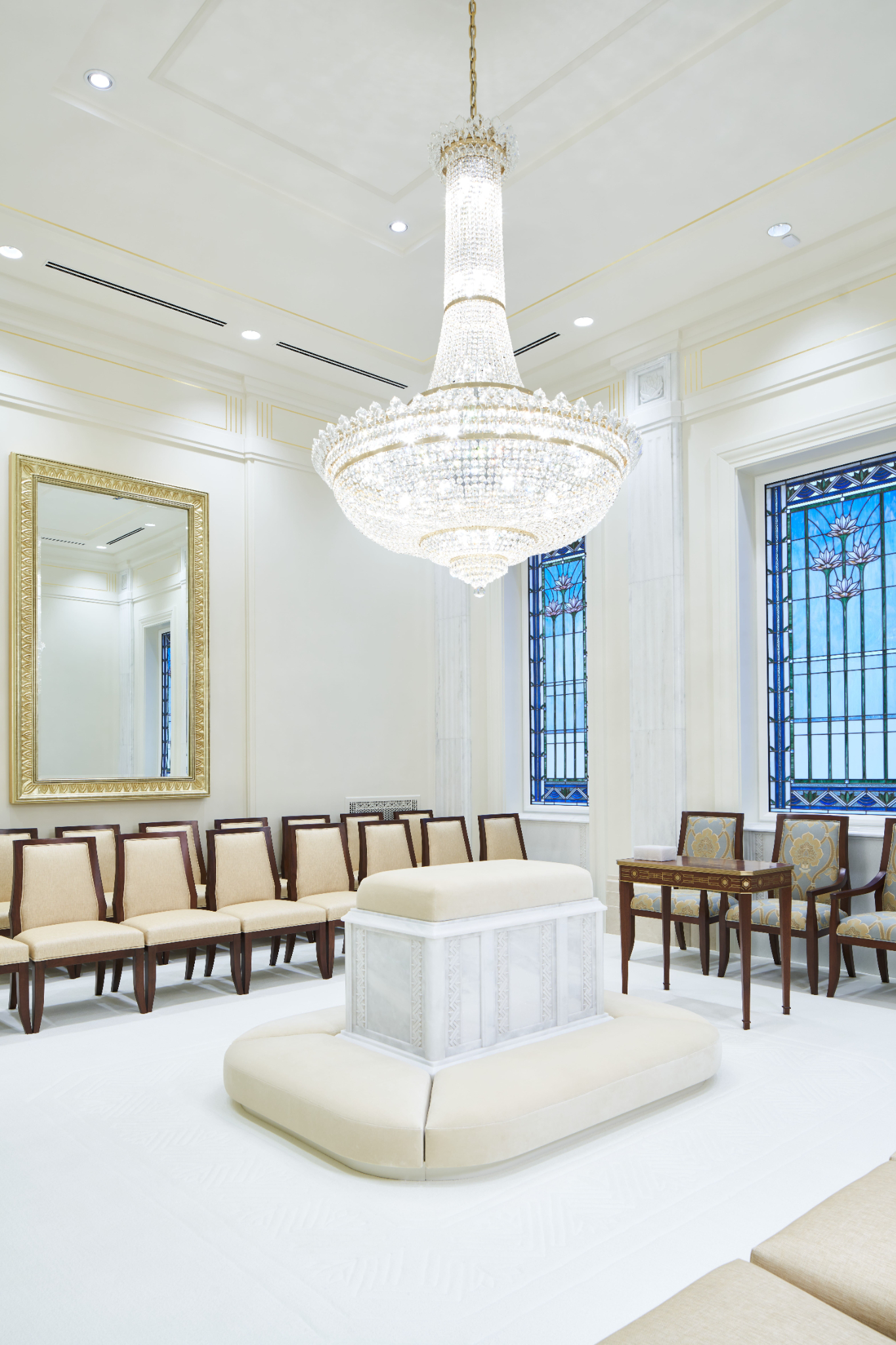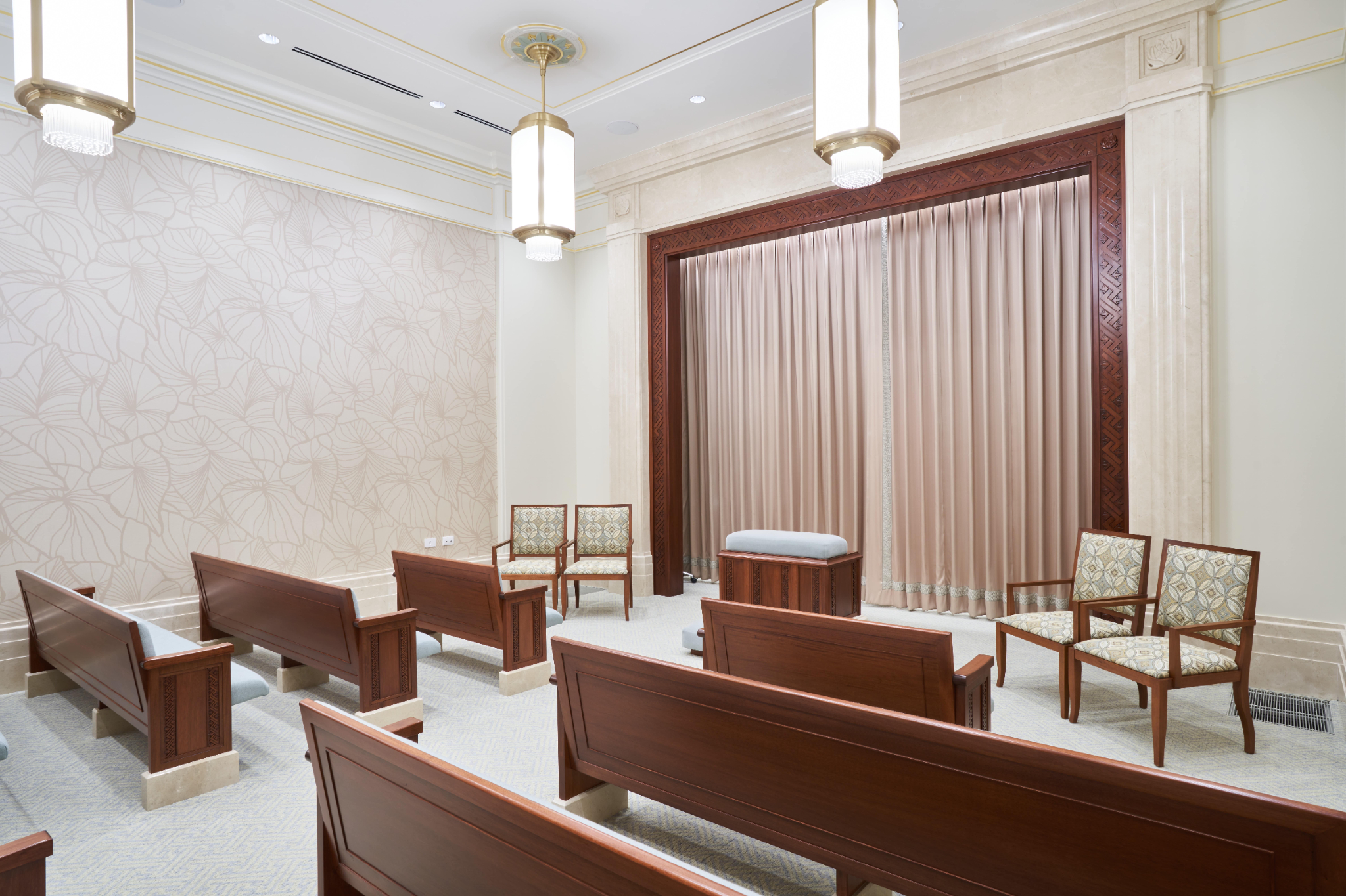 A medium brown native wood is used throughout the temple millwork and uses the same motif displayed on the exterior stone.