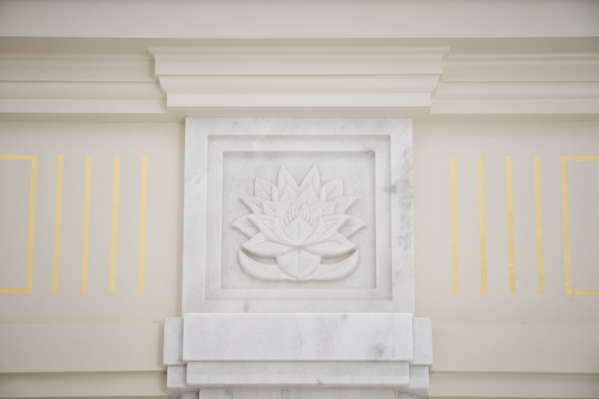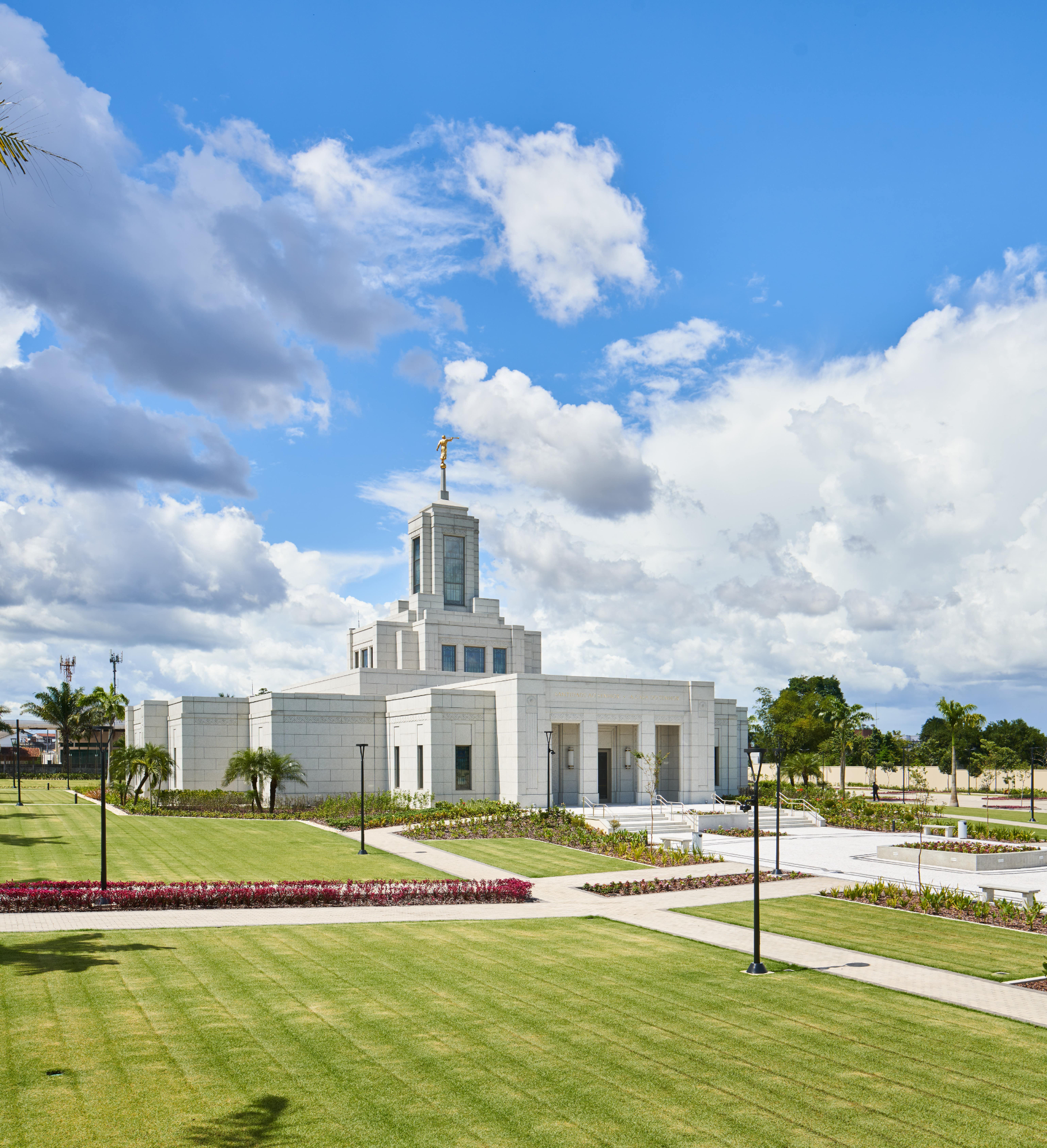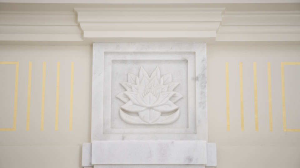 This single-story temple is clad in Brazilian granite, a feature in common with many other houses of the Lord in Brazil. Its soft, white appearance is a striking contrast to the beautiful green surroundings. The stylized motif found in the stone combines geometric elements inspired by local Marajoara indigenous pottery with the Victoria amazonica, a native water lily known for its beauty.