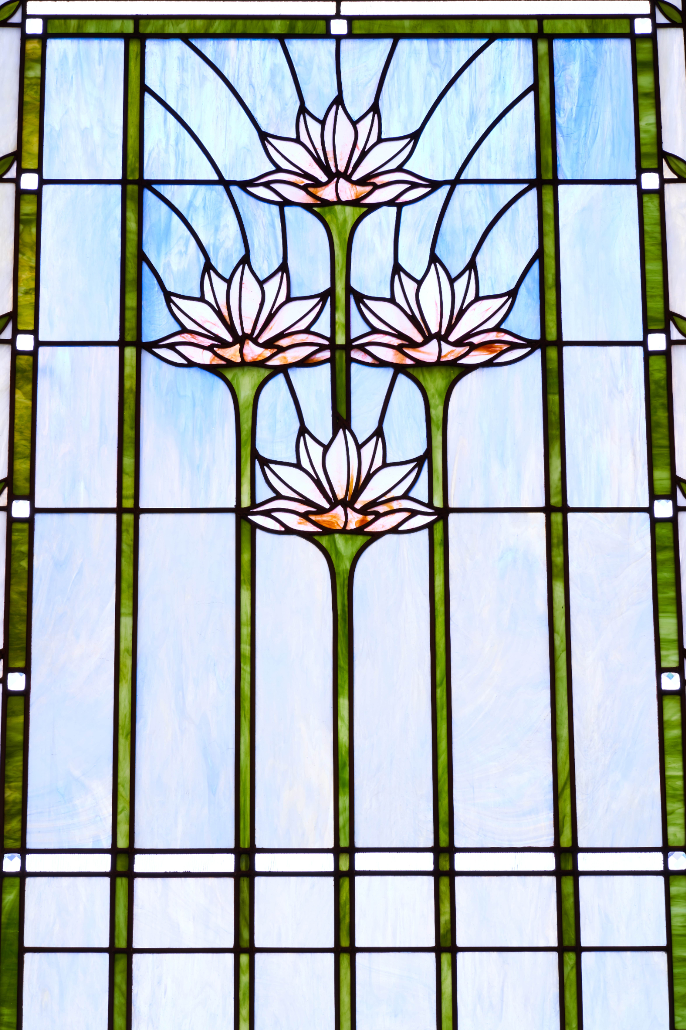 This water lily is also featured prominently in the art glass design. And the blue, green, yellow and pink color palette is a nod to the rainforest that covers much of the region. Brazilian landscape experts were consulted to identify which native species would best fit the design.