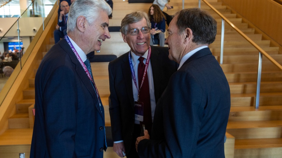 Presiding Bishop Gérald Caussé (left) greets Scott Anderson (middle), non-executive chairman of Zions Bank, and former Utah Gov. Gary Herbert (right) at “Crossroads of the World,” an international trade summit at the Zions Technology Center in Salt Lake City, on Wednesday, May 7, 2025.© 2025 by Intellectual Reserve, Inc. All rights reserved.Providing Service Opportunities