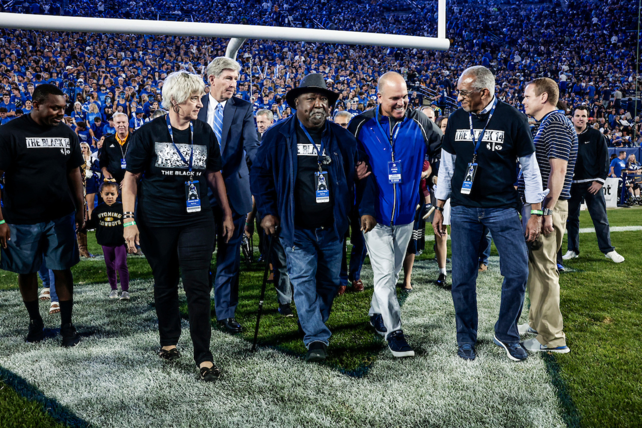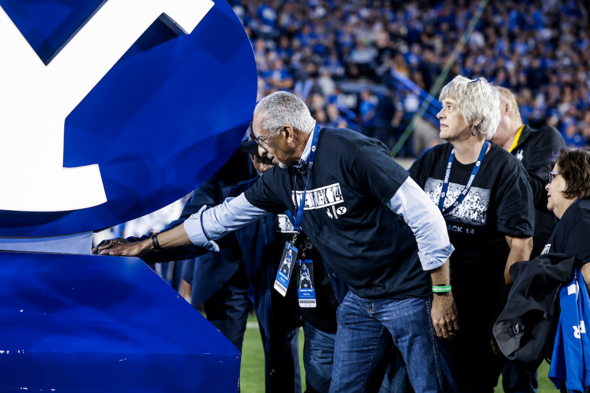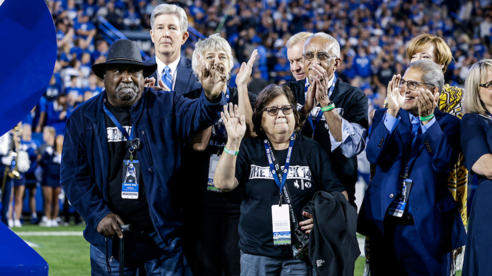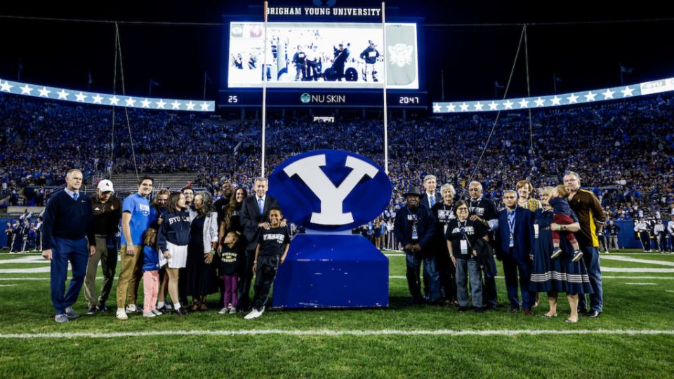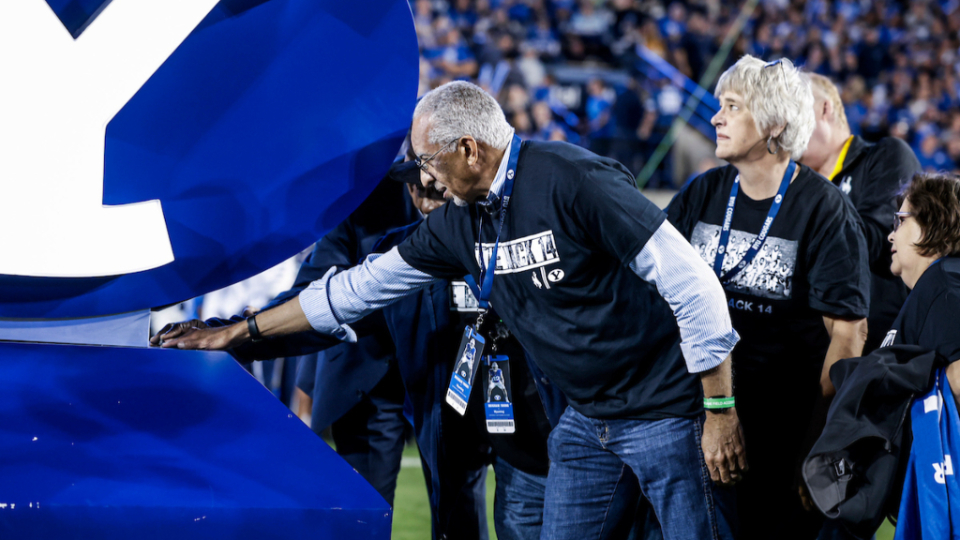 Mel Hamilton (far left) and John Griffin (middle) are honored prior to the BYU vs. Wyoming football game in Provo, Utah, on Saturday, September 24, 2022, for their philanthropic endeavors. They also ceremonially lit the large Y on the mountain above the football stadium.2022 by Intellectual Reserve, Inc. All rights reserved.At the end of Friday’s lunch, Elder Randall K. Bennett of the Church’s North America Central Area Presidency praised the Black 14 for their example of selflessness and hope.