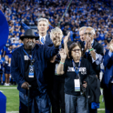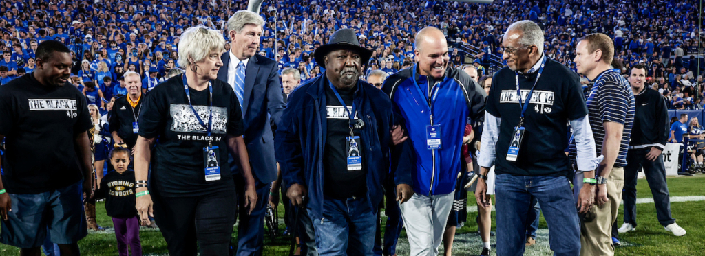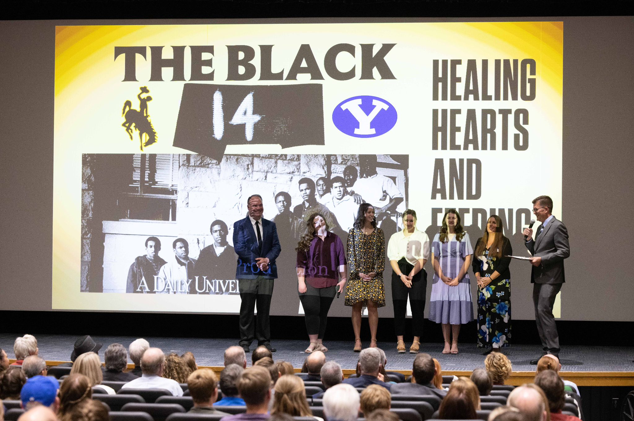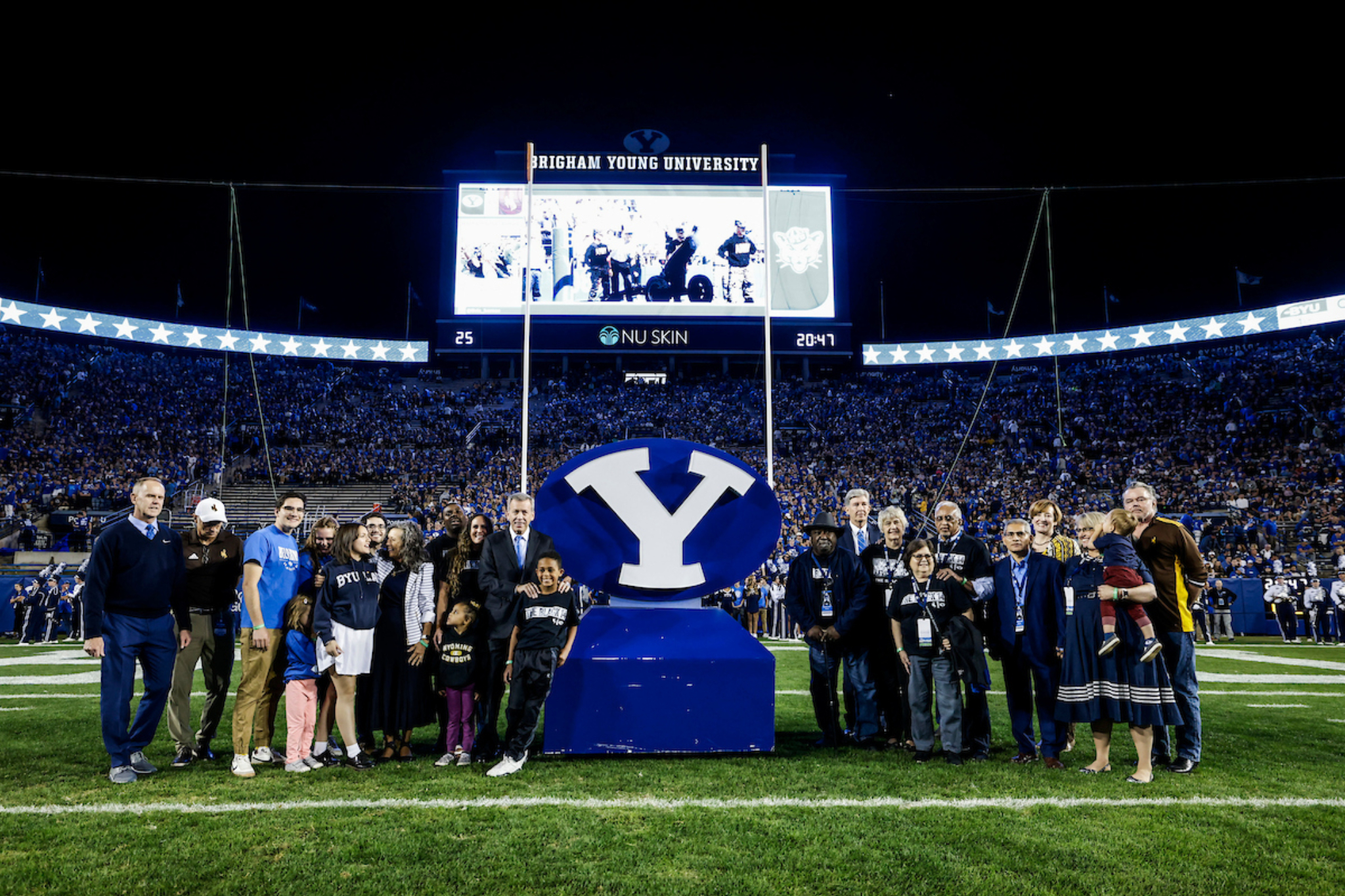 Mel Hamilton (far left) and John Griffin (middle) are honored prior to the BYU vs. Wyoming football game in Provo, Utah, on Saturday, September 24, 2022, for their philanthropic endeavors. They also ceremonially lit the large Y on the mountain above the football stadium.2022 by Intellectual Reserve, Inc. All rights reserved.At the end of Friday’s lunch, Elder Randall K. Bennett of the Church’s North America Central Area Presidency praised the Black 14 for their example of selflessness and hope.