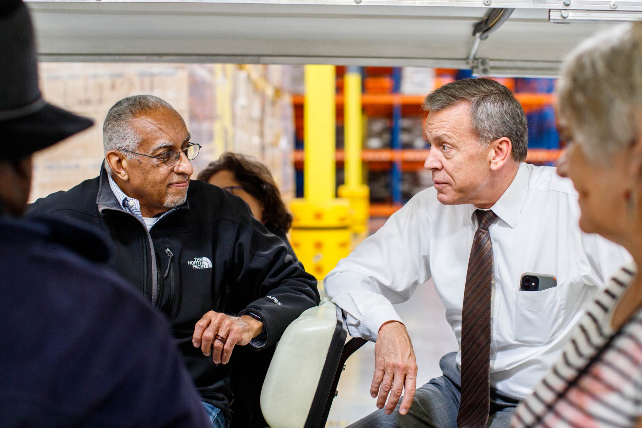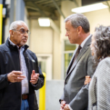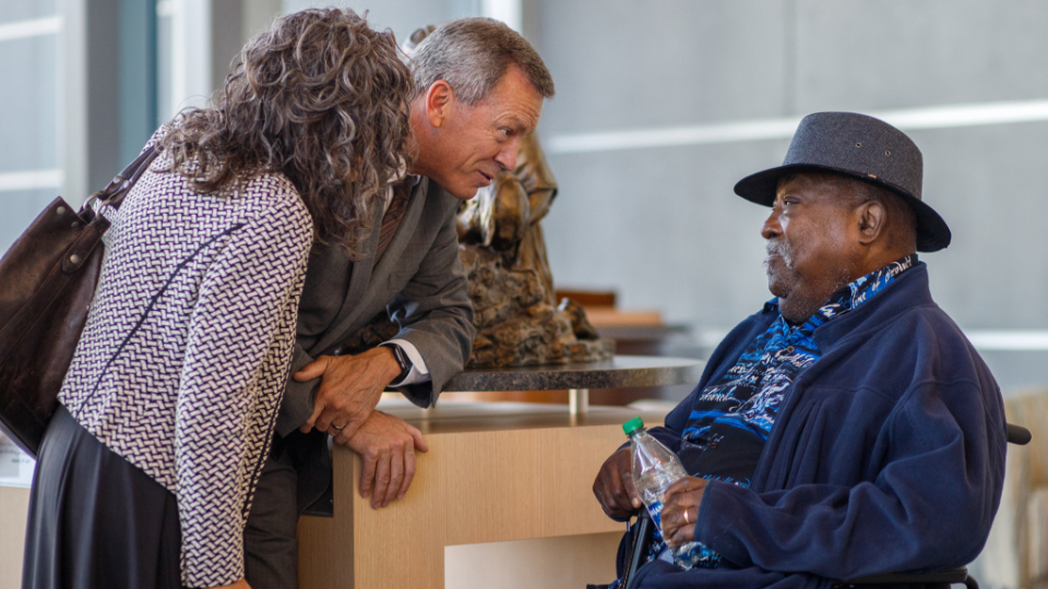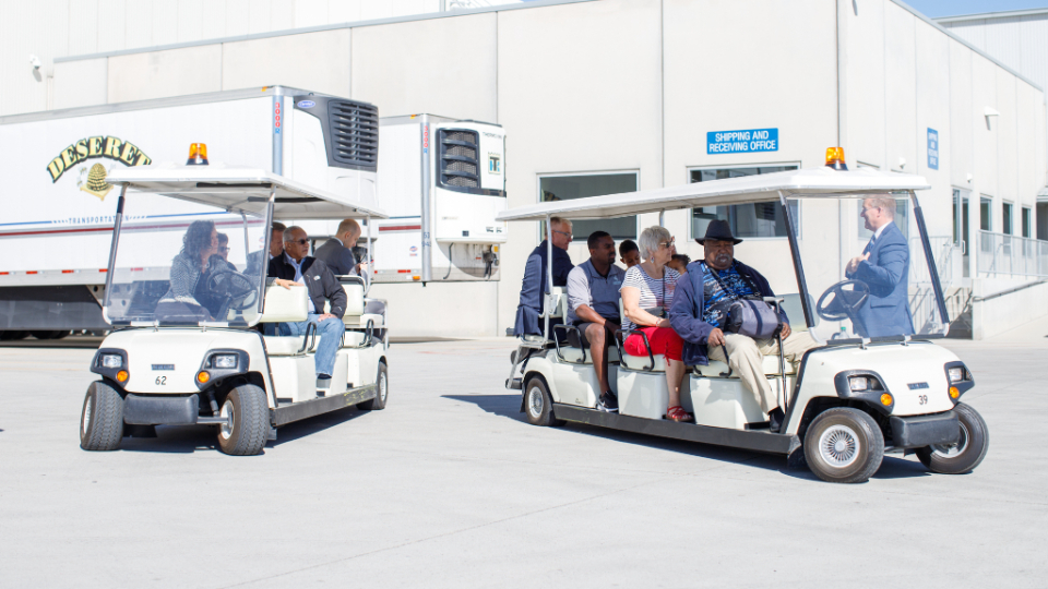 John Griffin (left) and Elder Randall K. Bennett (right) of the Seventy talk near the end of a tour of the Bishops’ Central Storehouse in Salt Lake City on Friday, September 23, 2022.2022 by Intellectual Reserve, Inc. All rights reserved.In addition to their visit to Church Headquarters (which included a tour of the 13-acre Bishops’ Central Storehouse and a lunch in the Joseph Smith Memorial Building), Griffin and Hamilton spent Friday and Saturday at BYU. Friday night they took part in a Q&A after the premiere of a student-produced documentary called “The Black 14: Healing Hearts and Feeding Souls.” And Saturday night, prior to the BYU vs. UW football game, the duo was honored for their philanthropic endeavors before ceremonially lighting the large Y on the mountain above the football stadium in Provo.