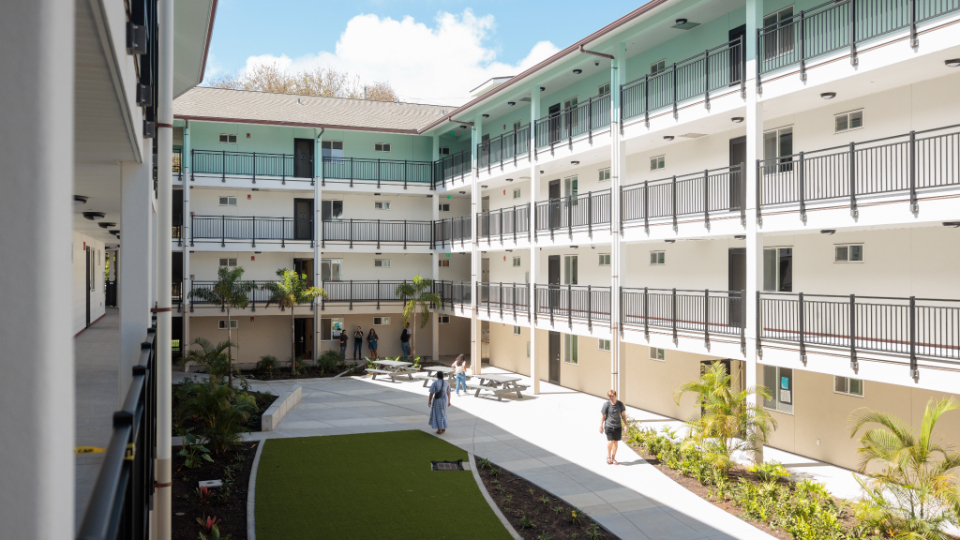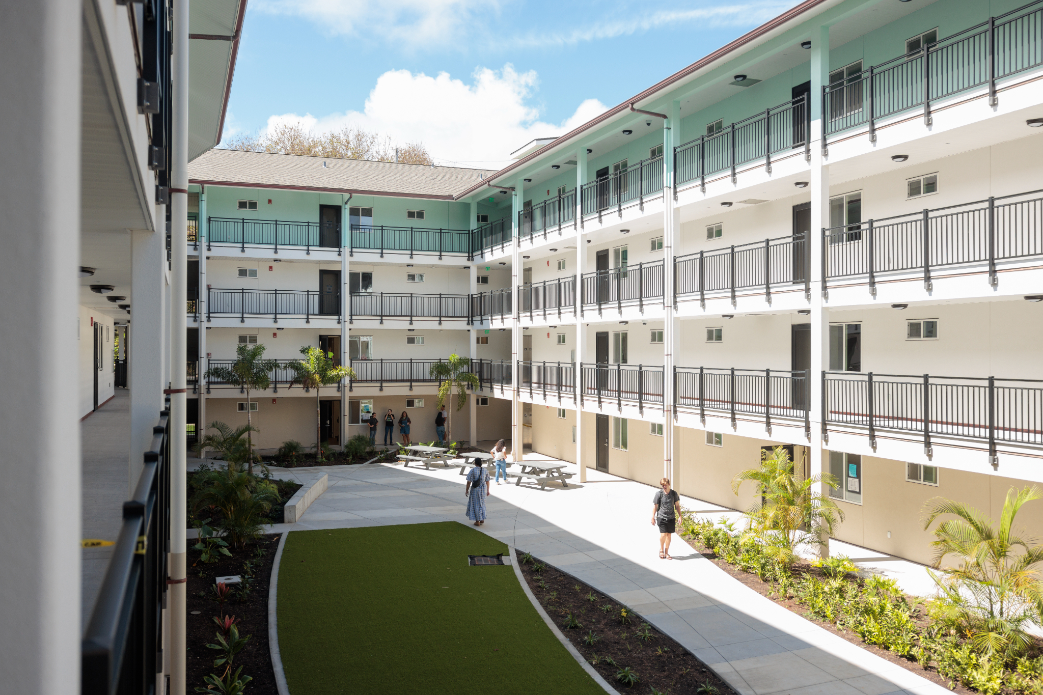 New student housing is designed to maximize natural ventilation, reducing the need for air conditioning. Additionally, the campus is being outfitted with low-flow water fixtures, smart irrigation controllers, and LED lights with occupancy sensors.
