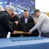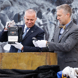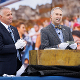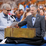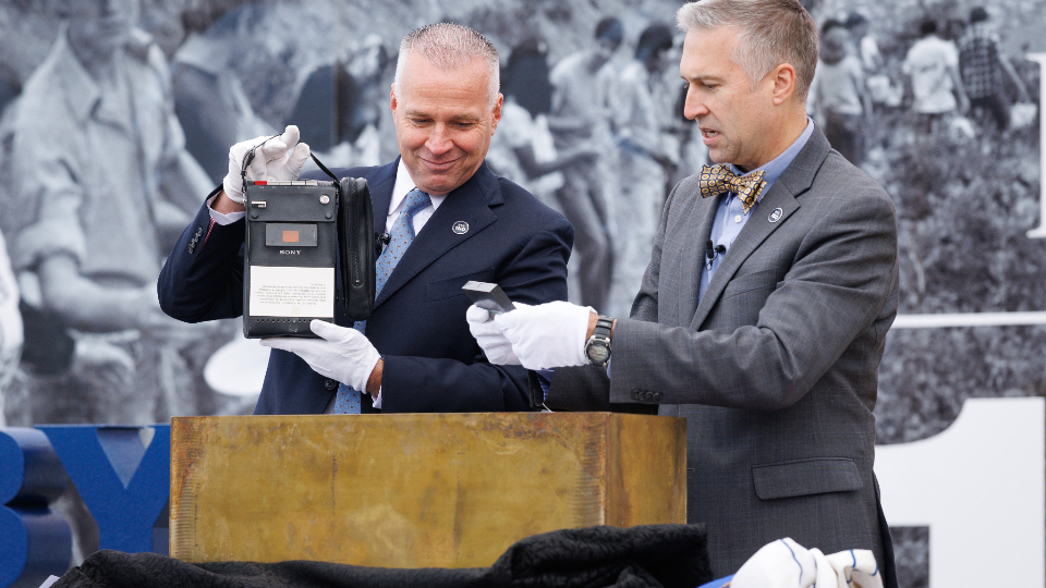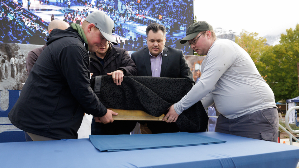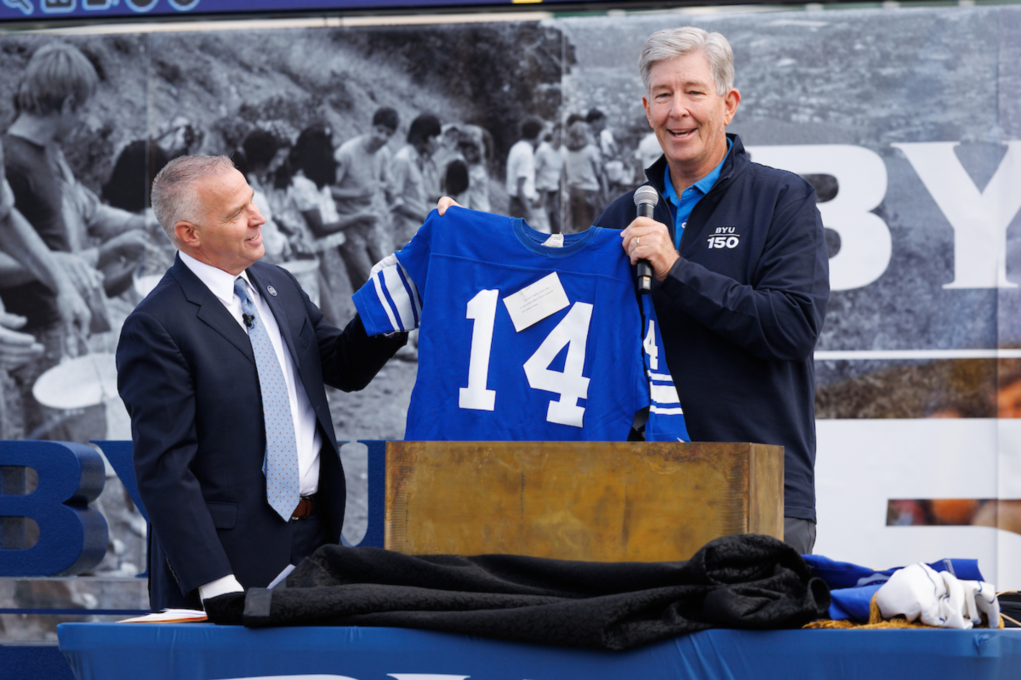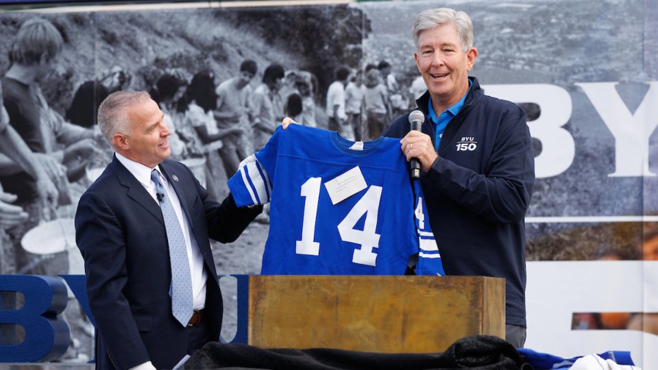 Brigham Young University President C. Shane Reese (left) and Elder Gifford Nielsen, a former BYU quarterback and NFL player and an Emeritus General Authority for The Church of Jesus Christ of Latter-day Saints, present Gifford's retired #14 football jersey during an unveiling of a 50-year-old time capsule, part of the university's 150th anniversary celebrations, on Thursday, October 16, 2025, in Provo, Utah. Photo courtesy of BYU Photo.All rights reserved.All of the time capsule’s contents will later be displayed around campus for visitors to explore.