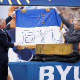 Gifford Nielsen, a former BYU quarterback and NFL player who is an Emeritus General Authority for the Church, pulled from the capsule the #14 football jersey he wore in the 70s. “The impact of the university, and the message that the university sends throughout the world is absolutely remarkable to me,” he said.