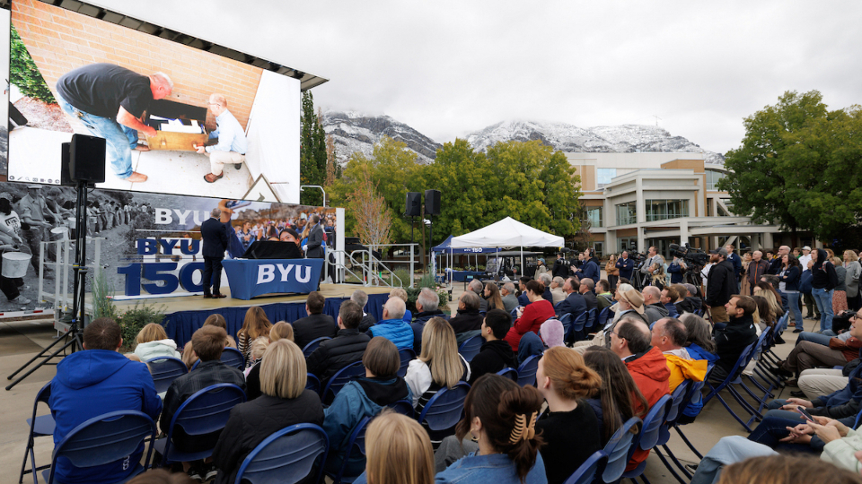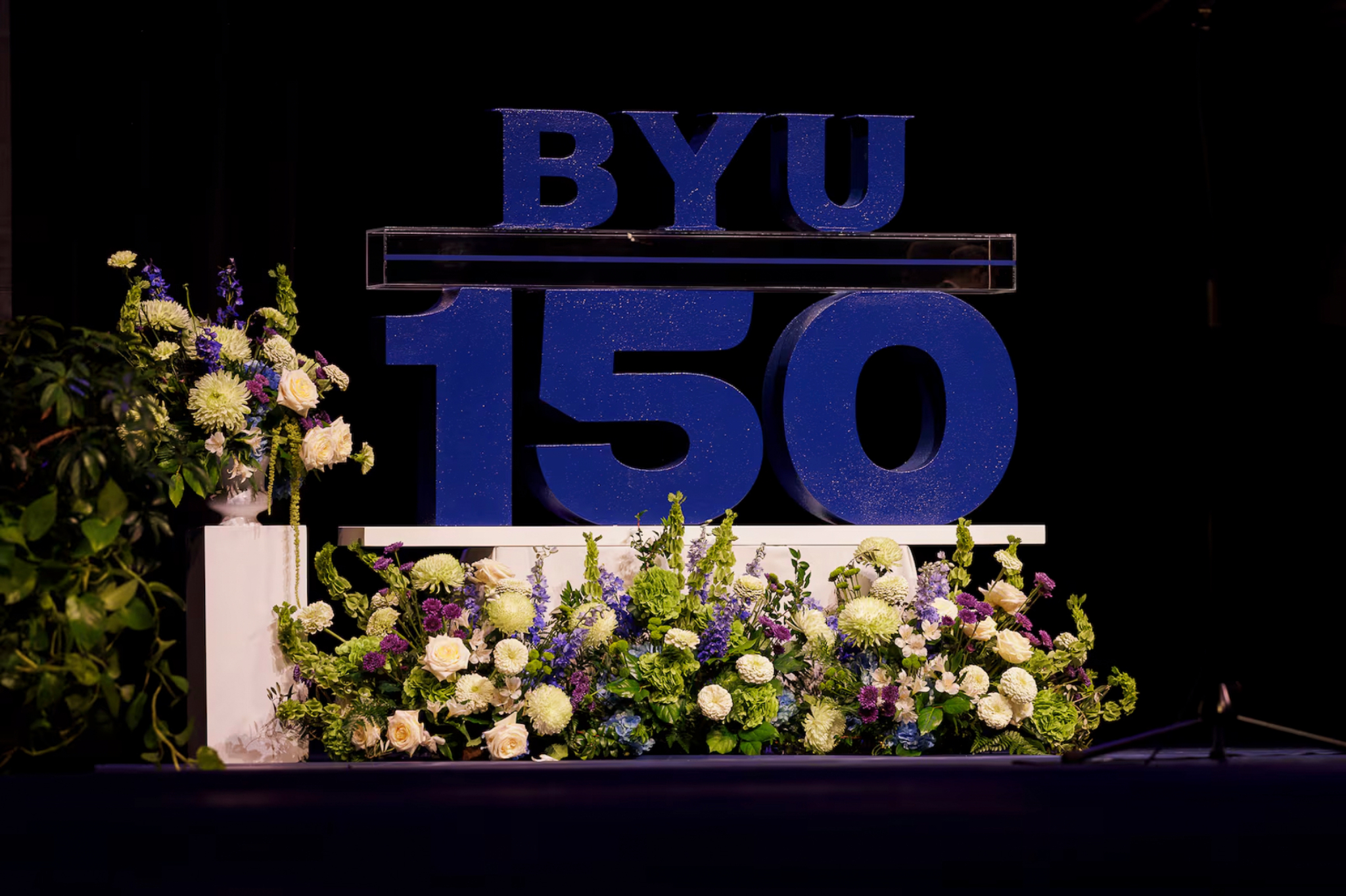A sign recognizes BYU's 150th anniversary. BYU President C. Shane Reese outlined a few of the upcoming events celebrating the milestone during his remarks as part of 2025 University Conference on Monday, August 25, 2025. Photo courtesy of BYU Photo.All rights reserved.Participants are encouraged to track their hours in the BYU 150 Passport app to earn prizes as they reach service hour benchmarks and participate in an interactive scavenger hunt of BYU-themed activities.