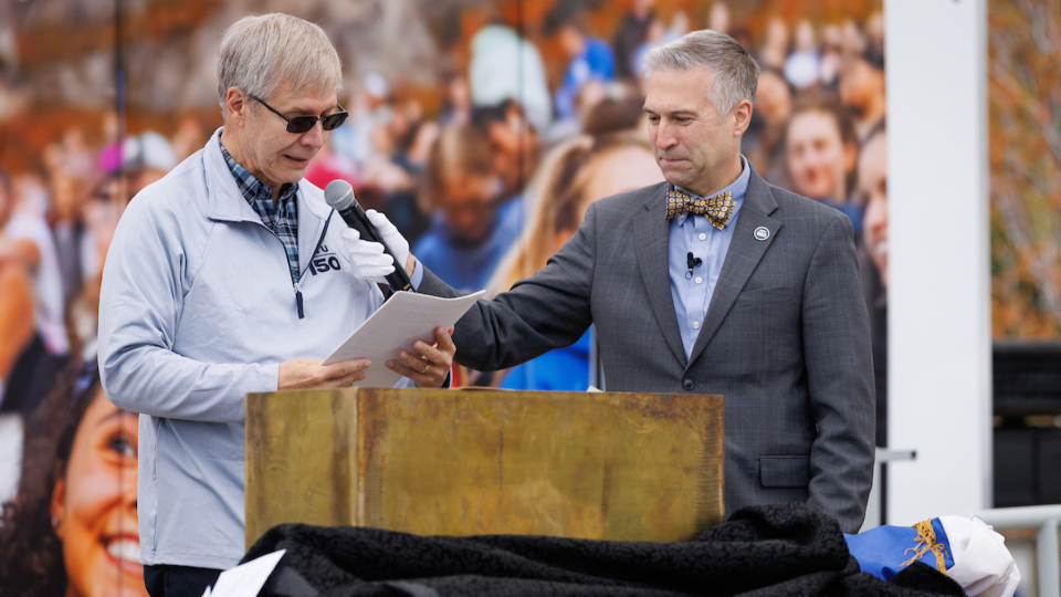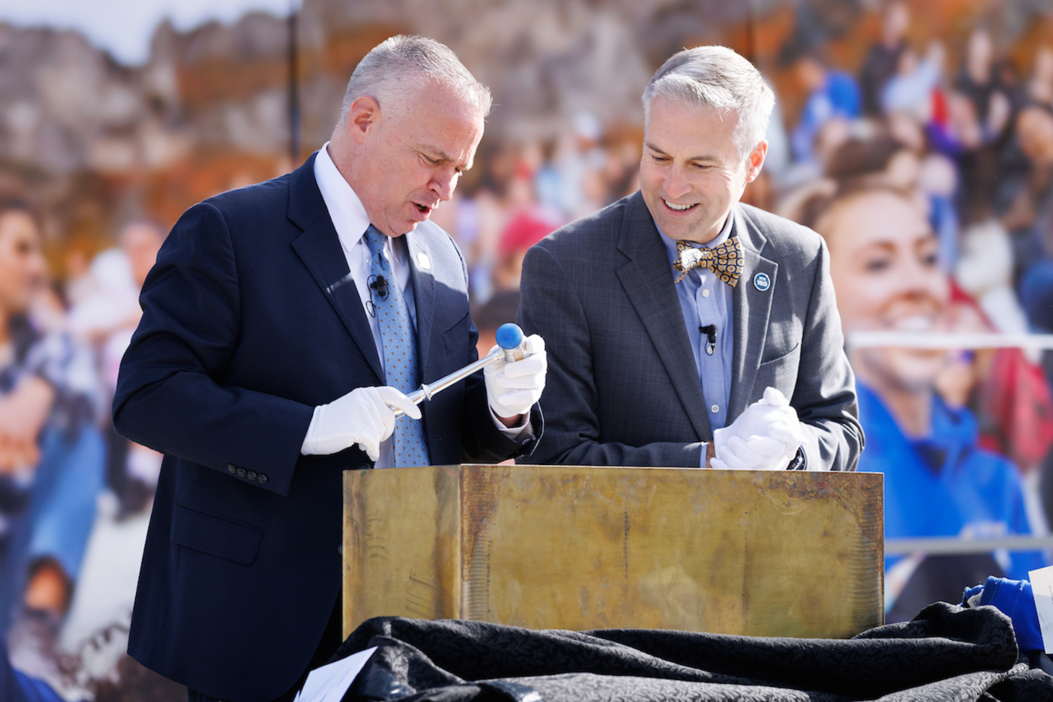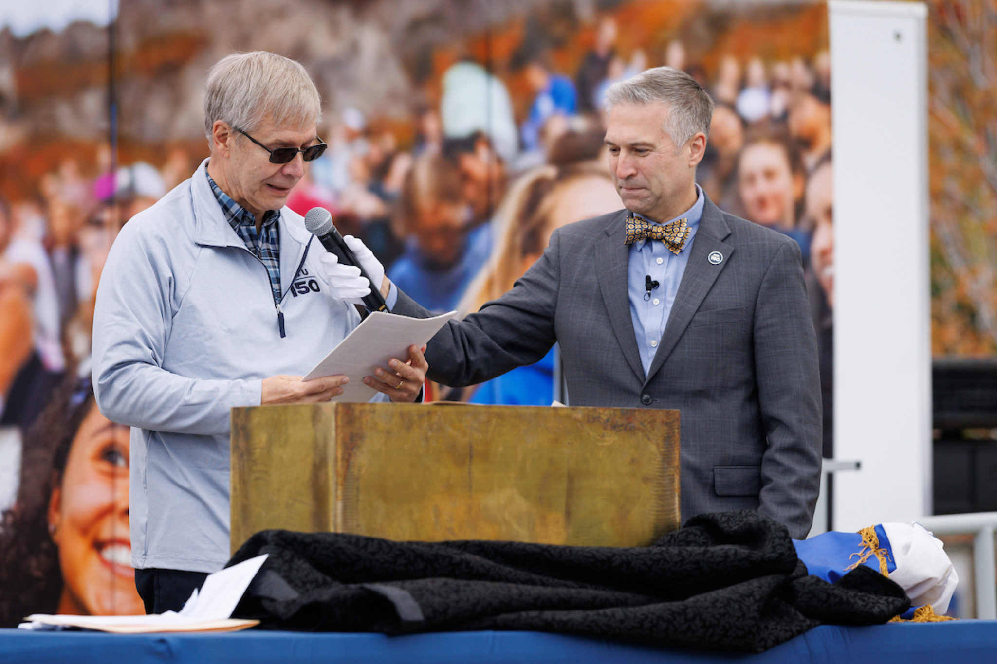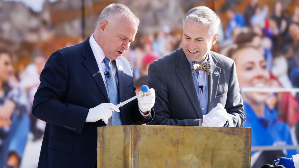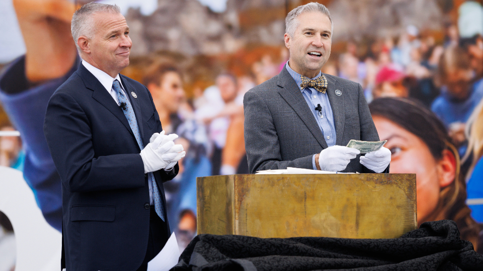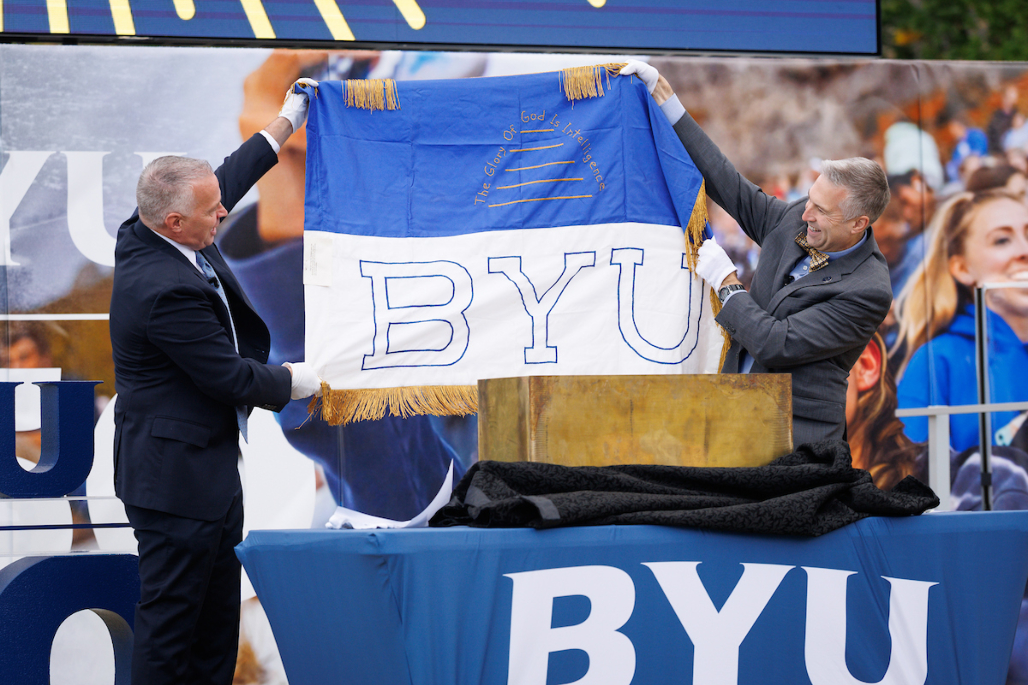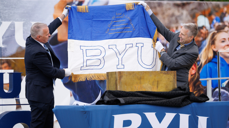 Brigham Young University President Shane C. Reese and University Librarian Rick Anderson hold up the BYU centennial flag, designed under the direction of then-BYU president and current President of The Church of Jesus Christ of Latter-day Saints, President Dallin H. Oaks, during the unveiling of a 50-year-old time capsule, part of the university's 150th anniversary celebrations, on Thursday, October 16, 2025. Photo courtesy of BYU Photo.All rights reserved.During the unveiling ceremony, Vance Campbell read a letter he wrote as a student in 1975 that was included in the capsule. “BYU shines greatly,” he read, and listed some of the progress of the day, such as a new J. Reuben Clark Law School and a construction project to double the size of the library.