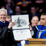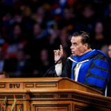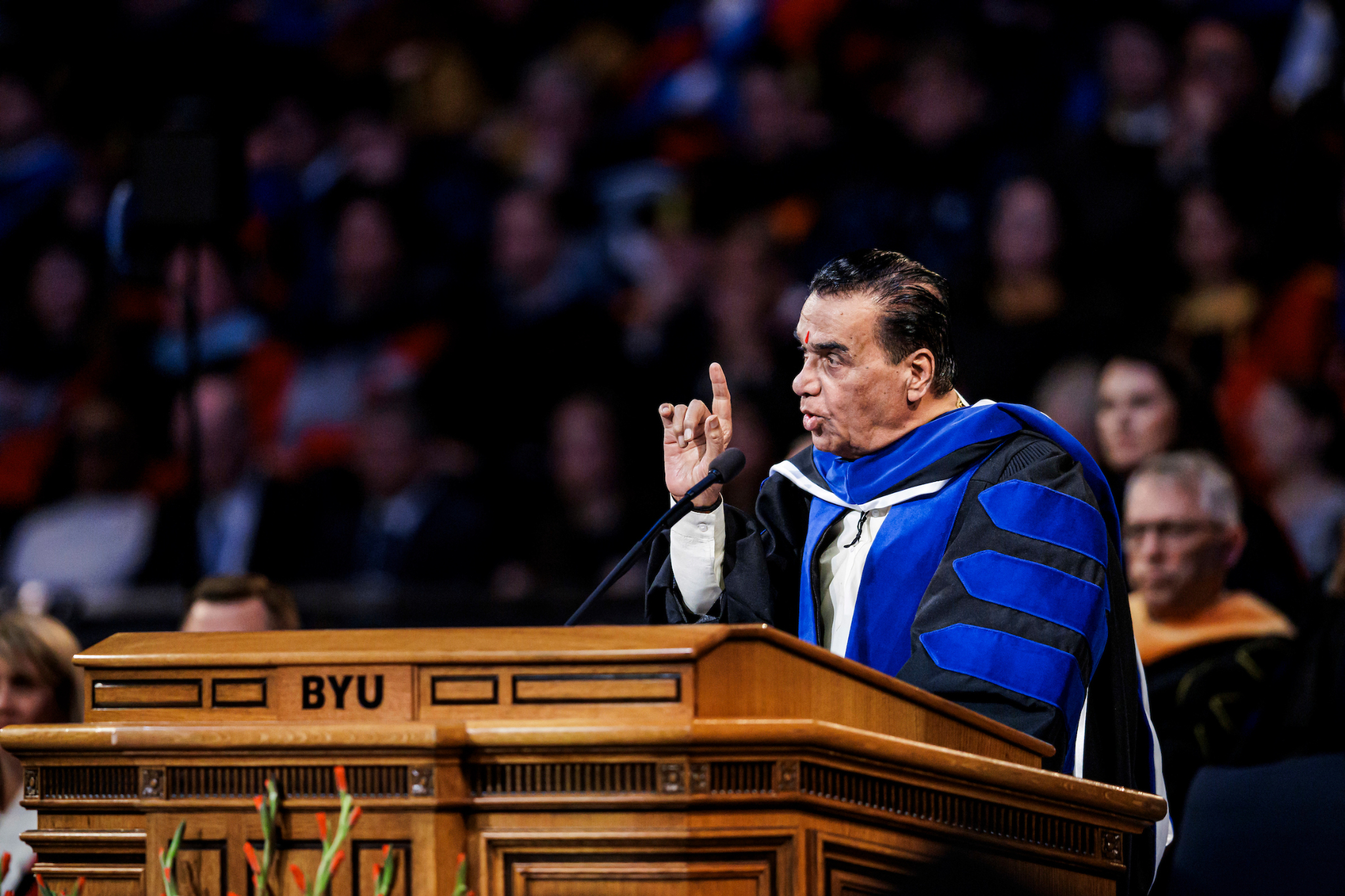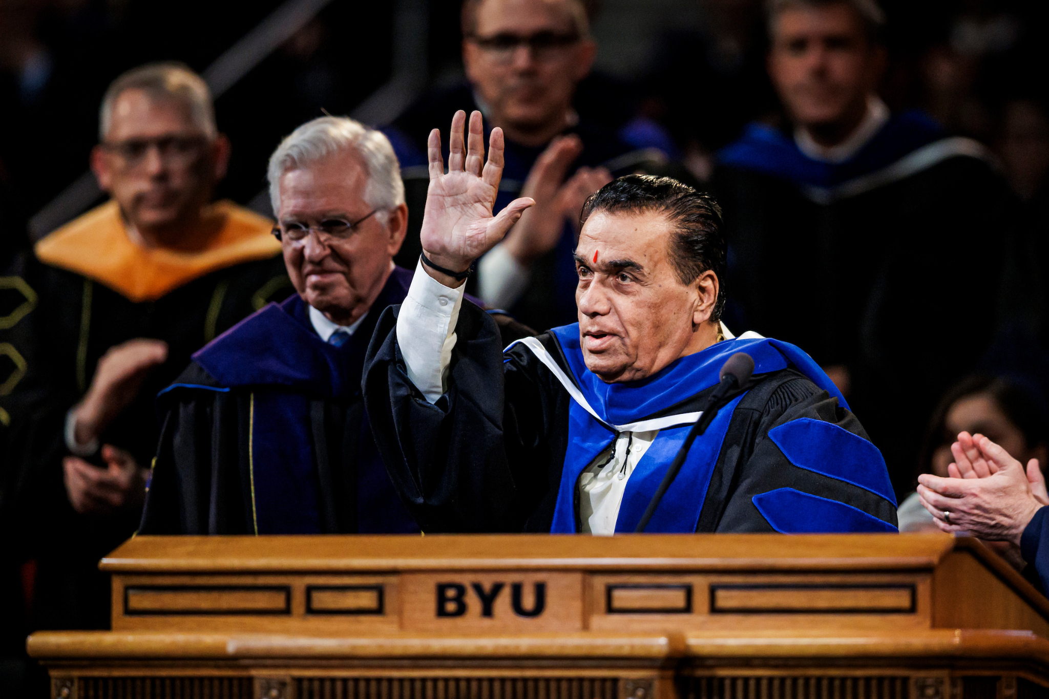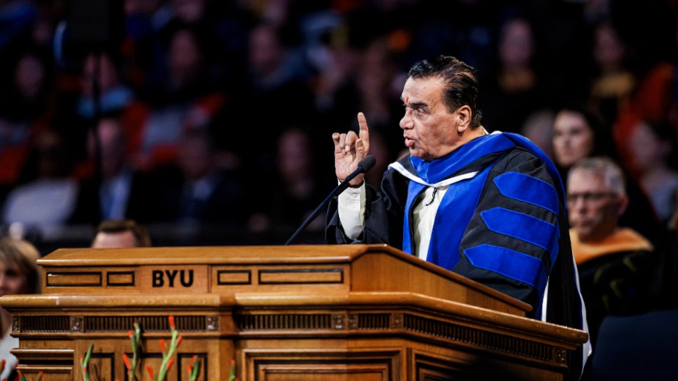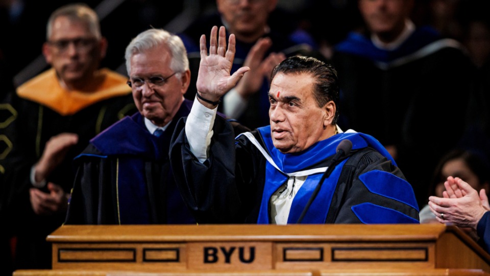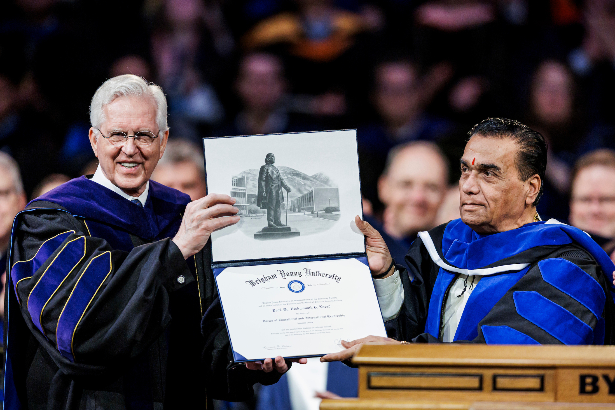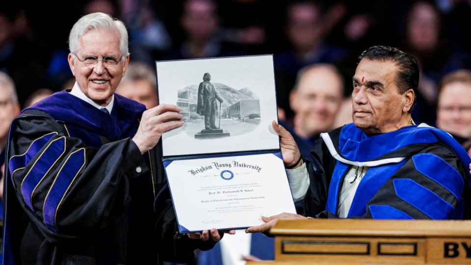 “[The World Peace Center] emphasizes the importance of values-based universal education in promoting a culture of peace in the global society,” said BYU President C. Shane Reese during the ceremony in the Marriott Center in Provo, Utah. “Professor Dr. Karad is a friend of Utah, Brigham Young University and The Church of Jesus Christ of Latter-day Saints. Brigham Young University is pleased to confer upon Professor Dr. Vishwanath Karad the degree of doctor of educational and international leadership.”