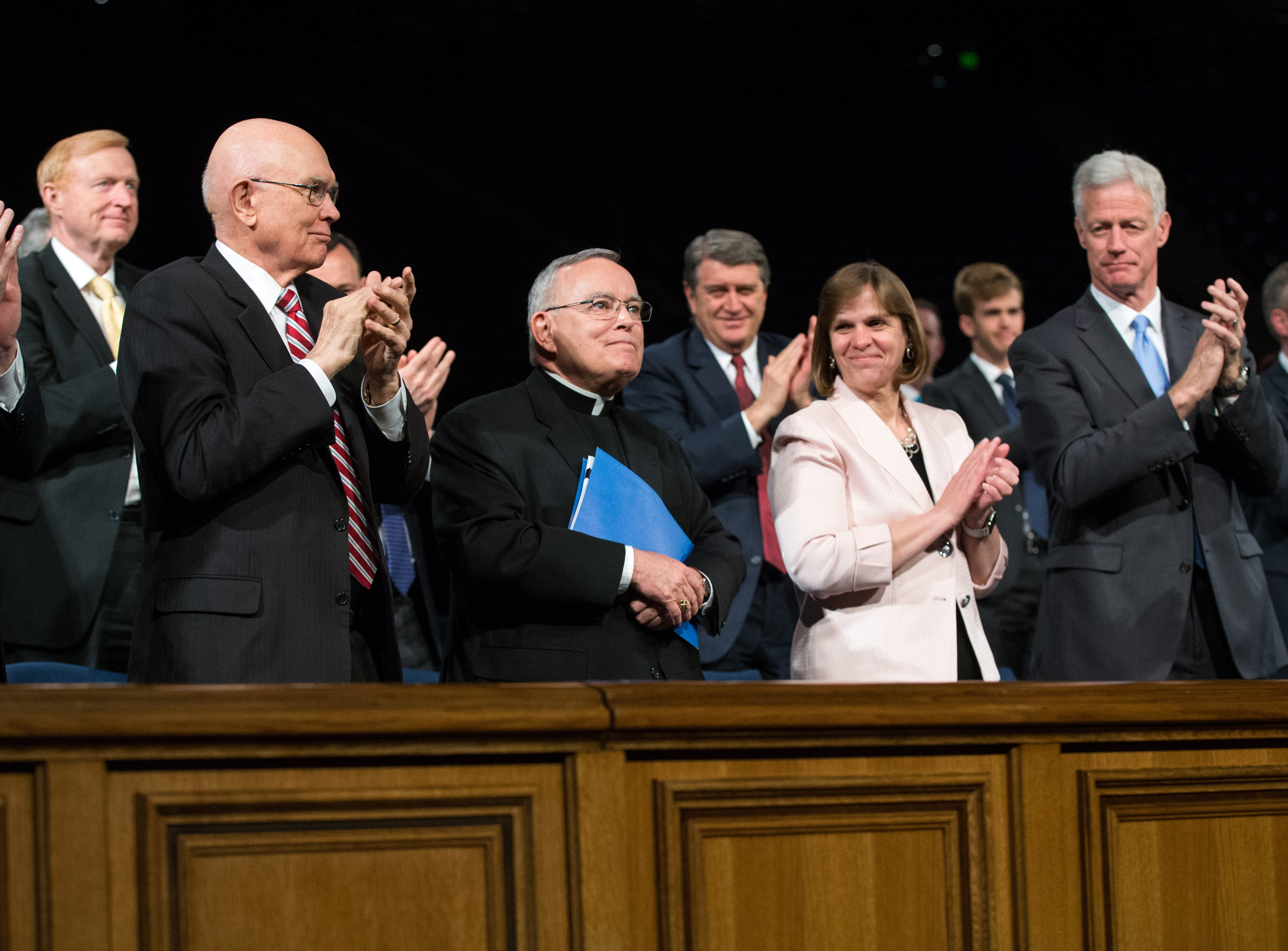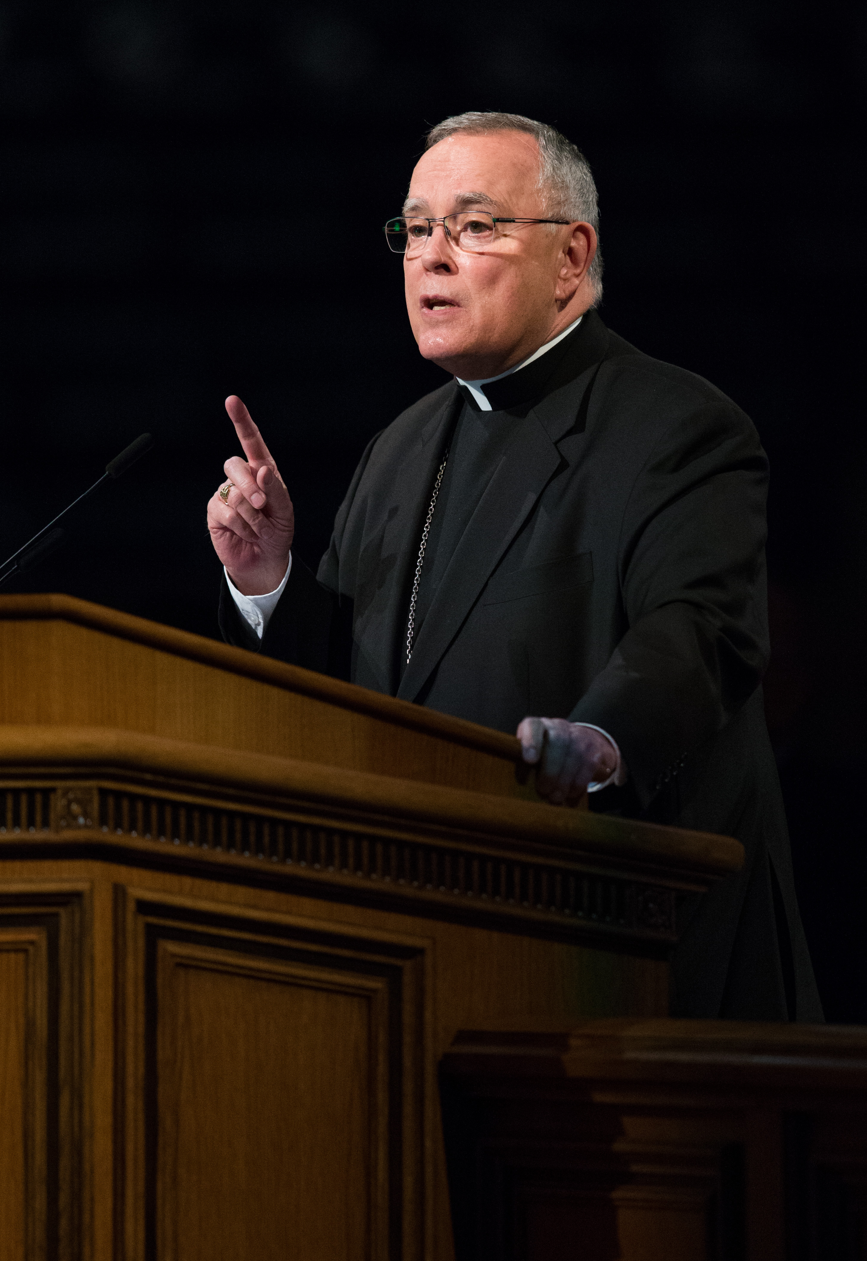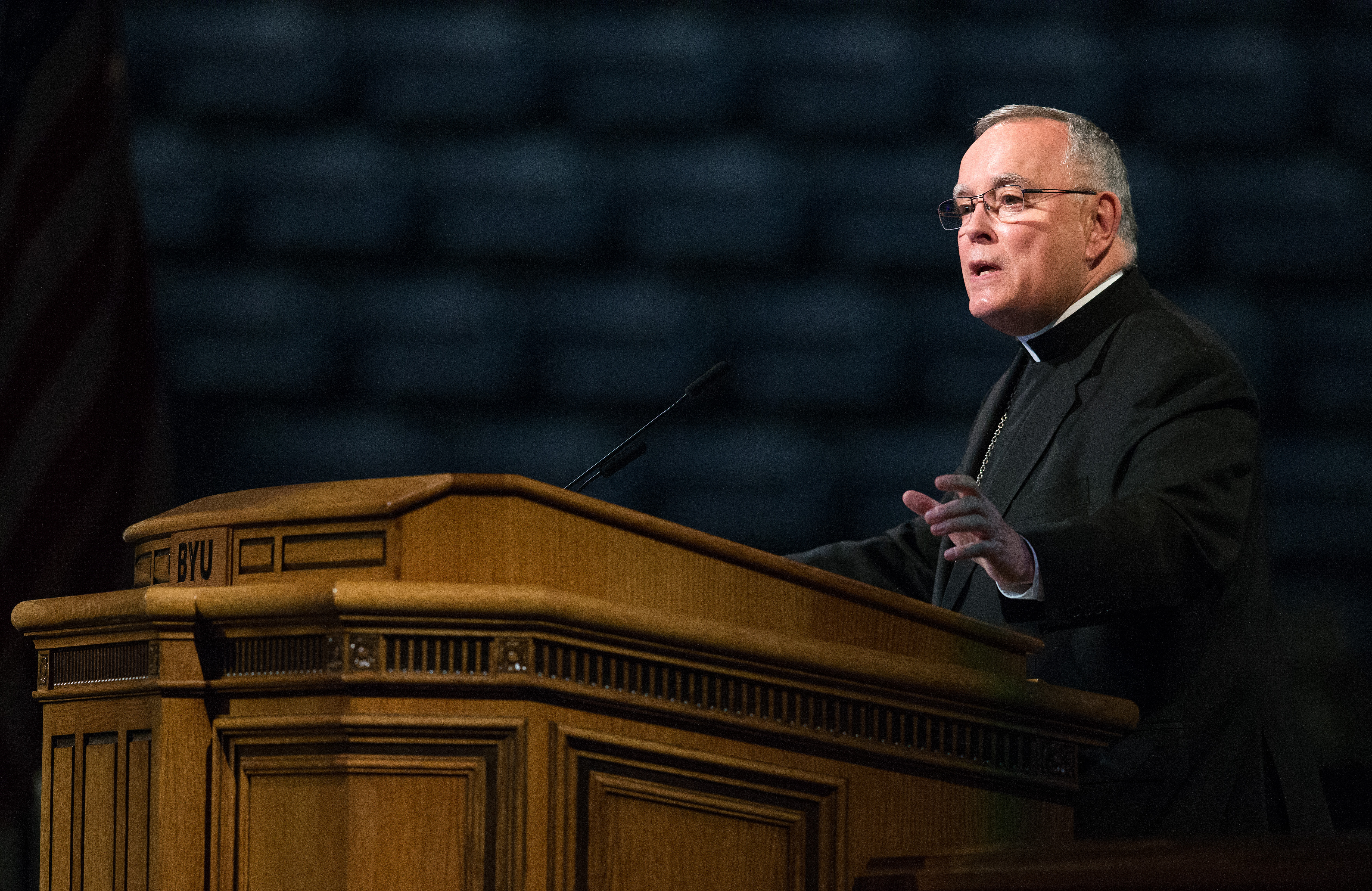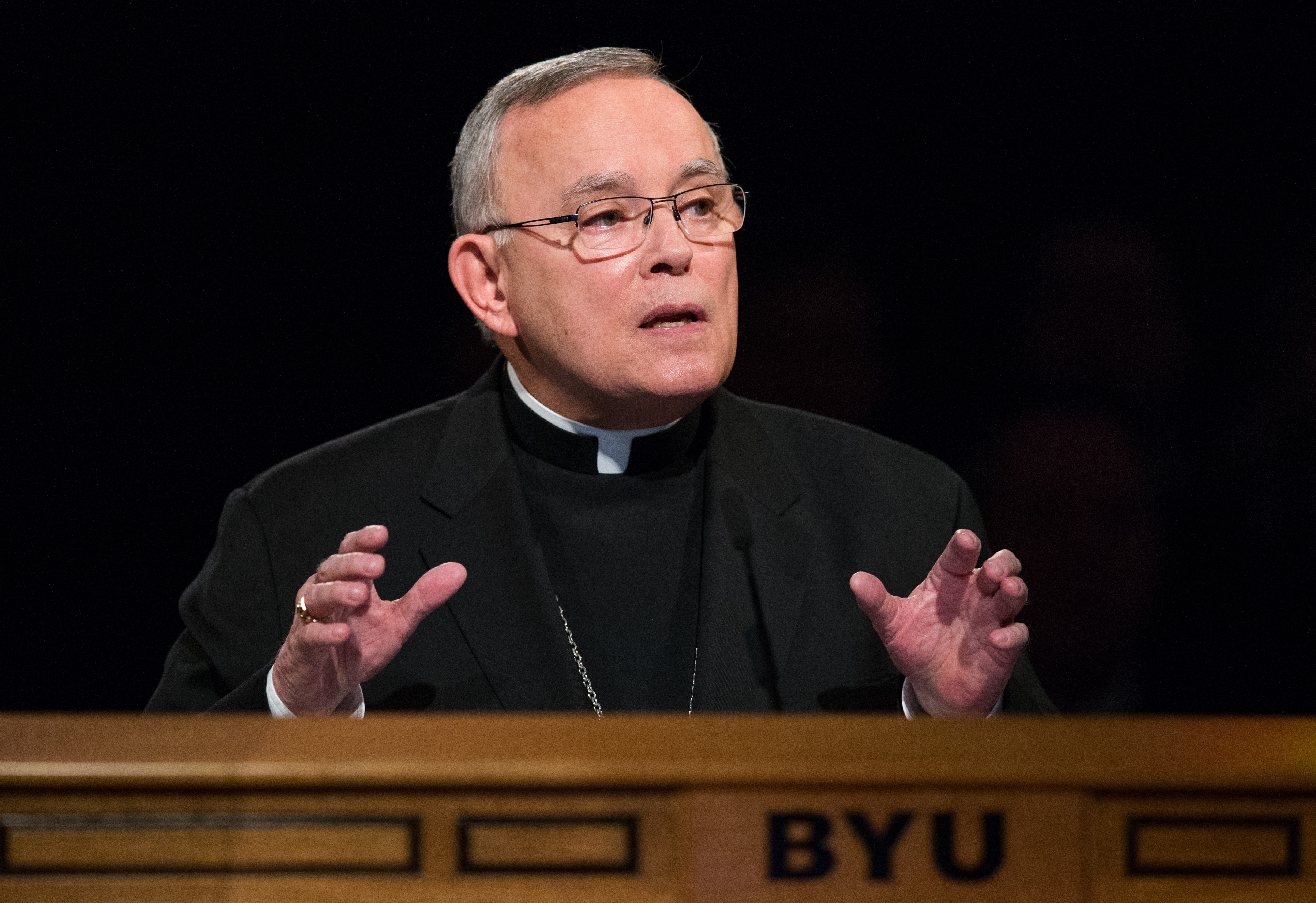 Archbishop Chaput spoke during a forum in the Marriott Center on the Provo, Utah, campus on Tuesday, March 22, 2016. He was joined on the stage by Elder Dallin H. Oaks of the Quorum of the Twelve Apostles of The Church of Jesus Christ of Latter-day Saints. The private university is owned and operated by the Church.
